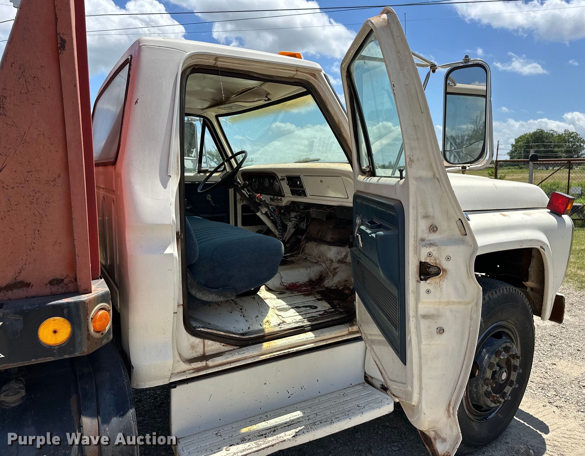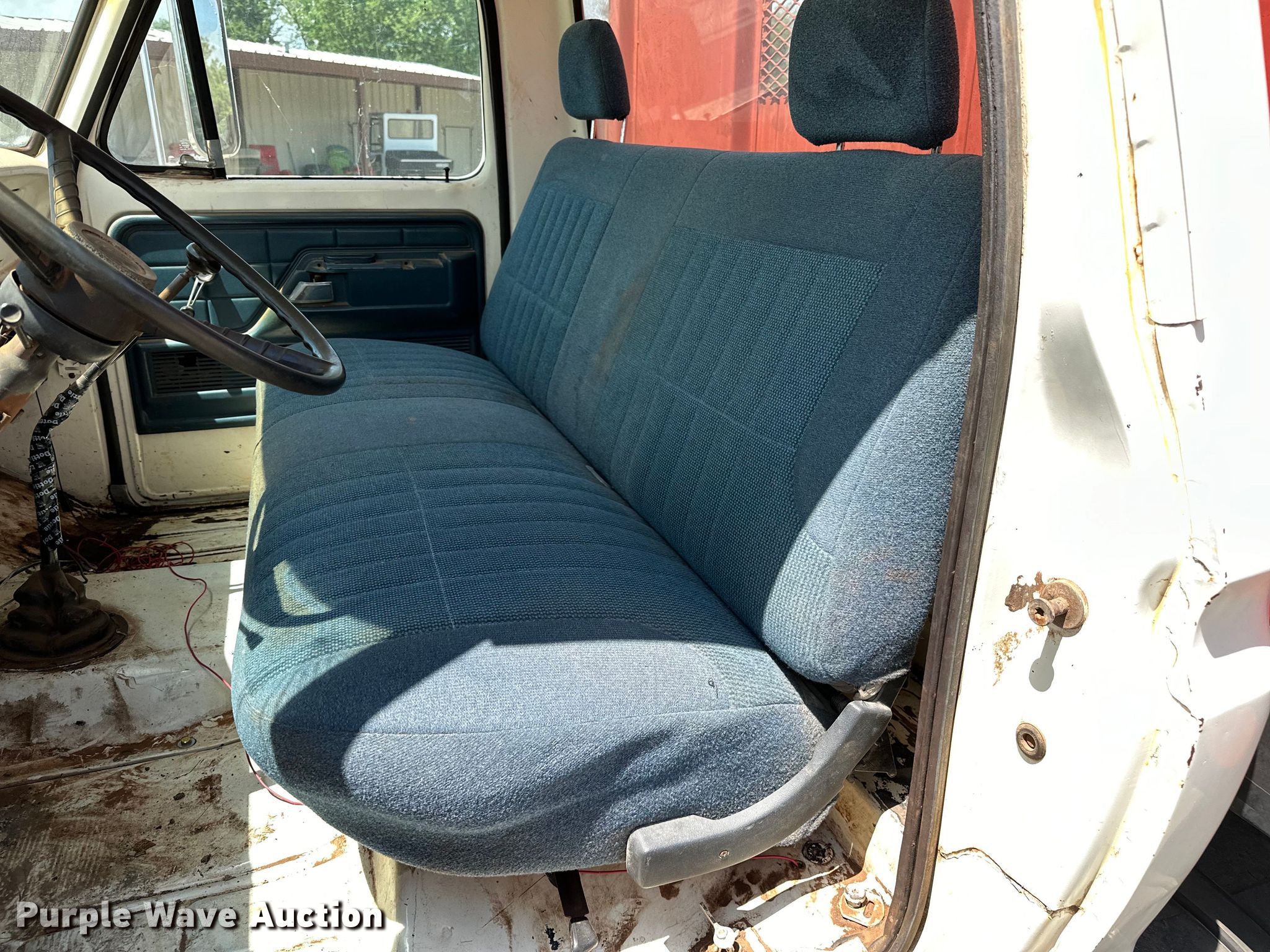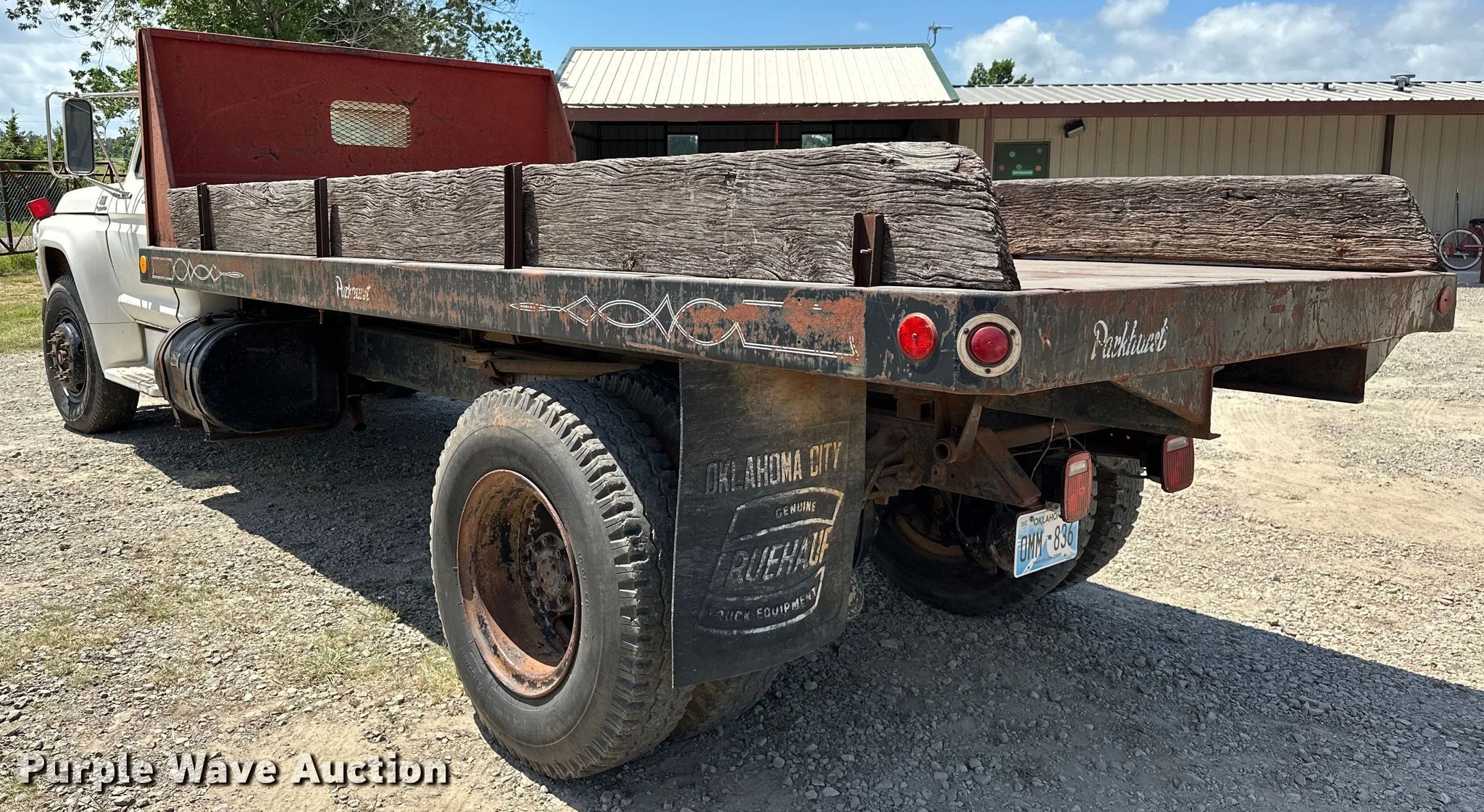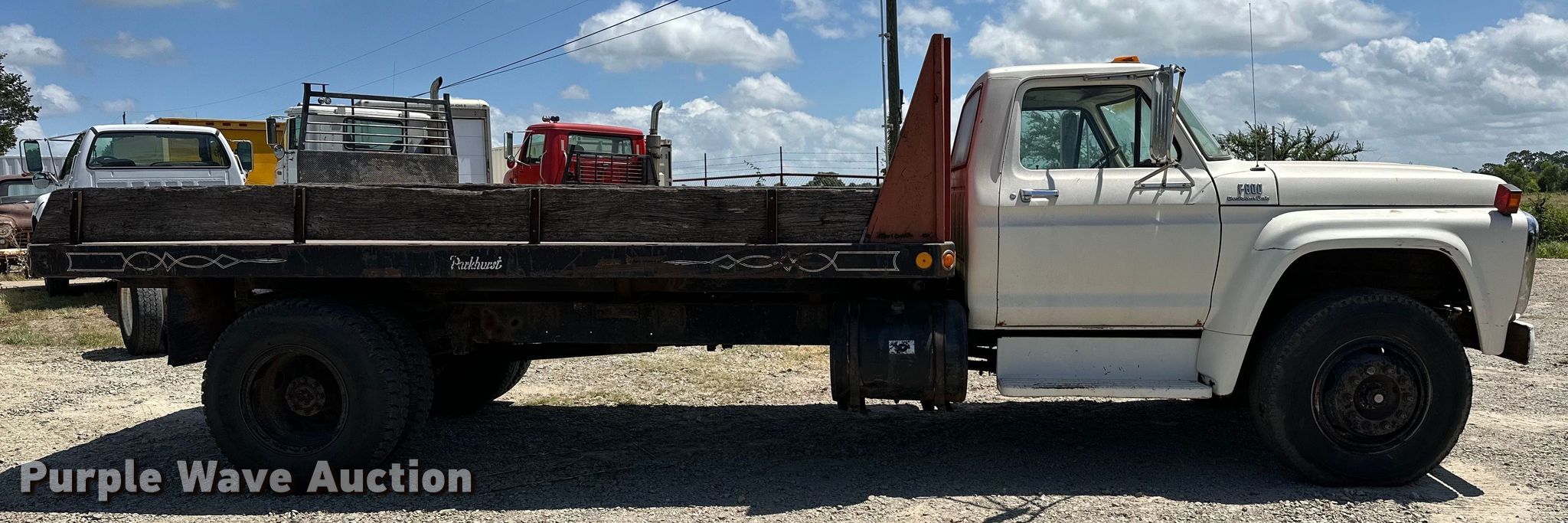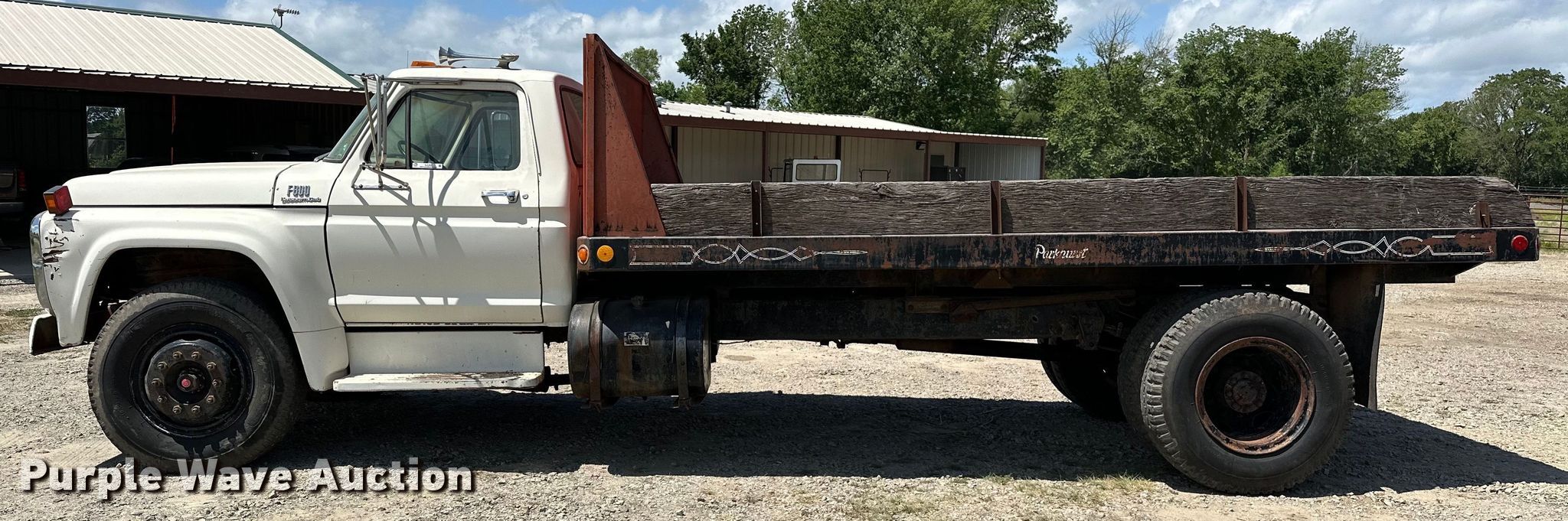 1977 Ford F800 flatbed truck. Miles: 88,553 on odometer, VIN: F82JVY91606. Engine Ford, Displacement: 477 C.I.D, Cylinders: 8, Fuel type: Gas. Transmission Manual, Speed: 5, plus 2. Chassis Axles: Single, Suspension: Spring, Brakes: Air, PTO, GVWR: 27,500 lbs. Features Dump flatbed Parkhurst, 15' 9" L x 96" W, Removable sides, Ram: Single. Tires Size: 10.00-20. Notes Windshield chipped or cracked, Engine issues, misfire. Oklahoma classic title. Title distribution may be delayed up to 14 days from verification of funds. Checotah, OK 74426