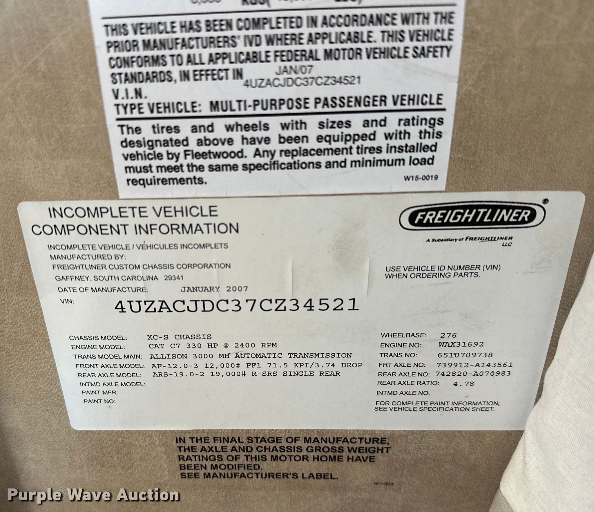 Purple Wave is selling a used RV or Camper in Oklahoma. This item is a 2007 Fleetwood Discovery RV with the following: Miles: 80,082 on odometer, Camper length: 41', VIN: 4UZACJDC37CZ34521, Insurance salvage unit claim #: 4-805636