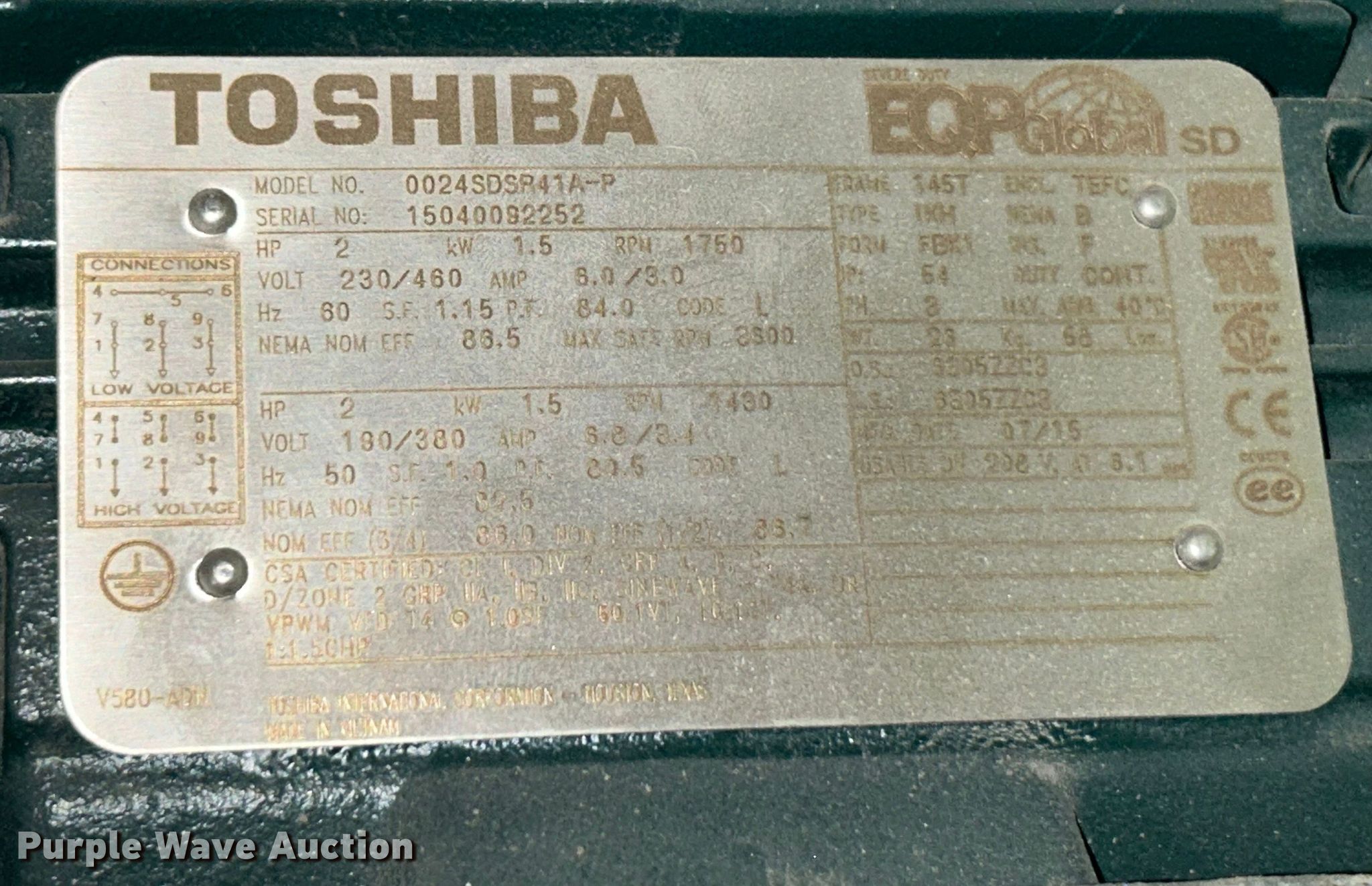 Sullair 4500 air compressor. Hours: Unknown, Serial: 200608180036, Dimensions: 62" L x 35" W x 62" H. Electric Motor Toshiba 0024SDSR41A-P Serial: 15040082252, HP: 2, kW: 1.5, Volts: 230/460, Phase: Three. Features Air compressor Sullair 4509V/A, PSI: 125, Skid mounted, Variable speed drive, Hp: 60. Korte Meat Processing, Inc.. Highland, IL 62249