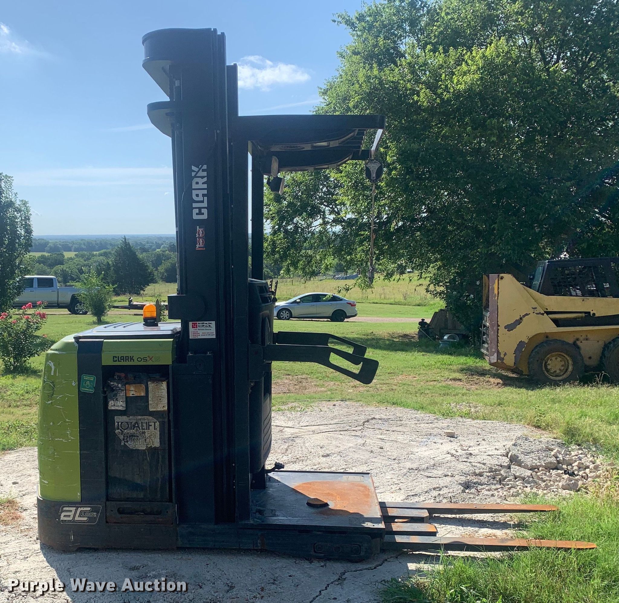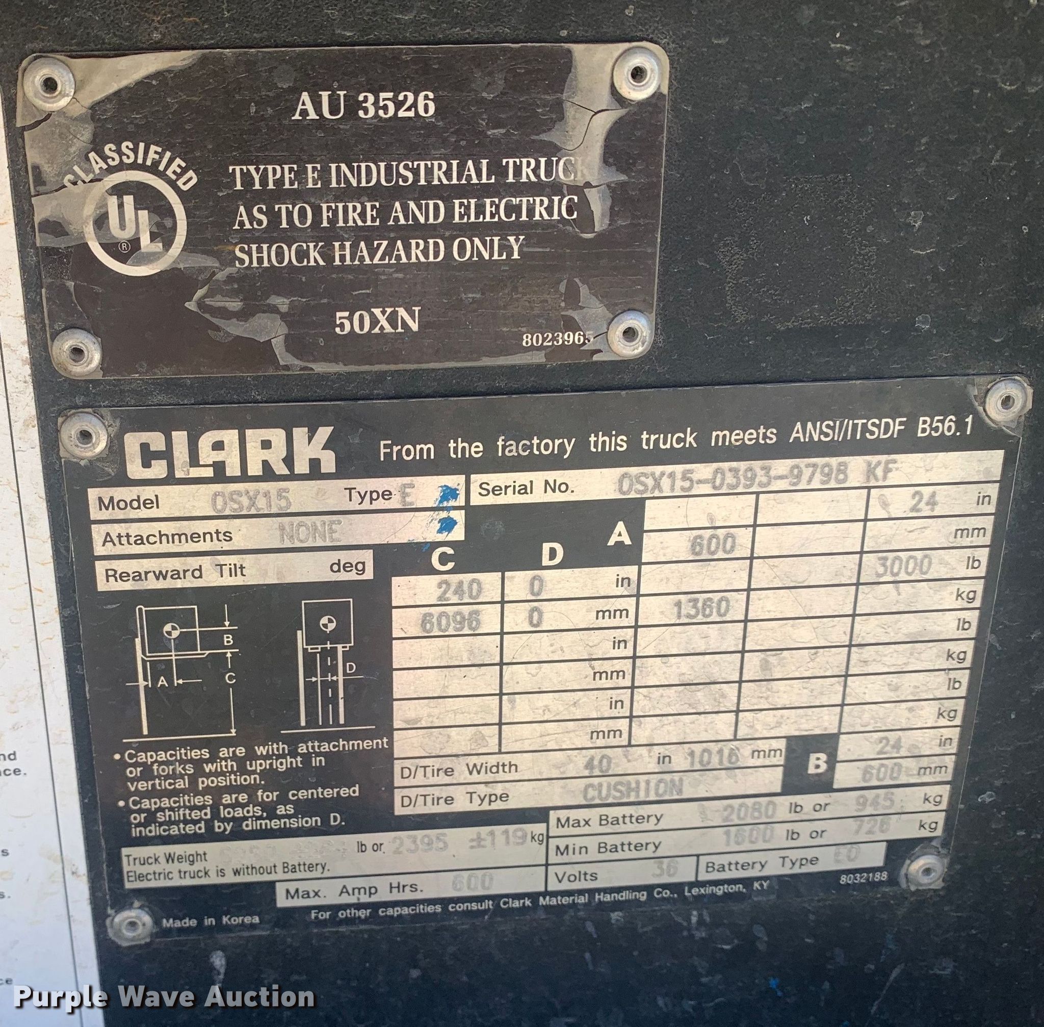 Clark OSX15 order picker. Hours: 1,044 on meter, Serial: OSX15-0393-9798KF. Electric Motor Volts: 36, Phase: Single, Charger: Single phase Total Lift TL36 Volts: 36.. Transmission Hydrostatic. Features Maximum lift capacity: 3,000 lbs, Maximum lift height: 240", Mast stages: 3, Fork length: 42". Tires Size: 5", Solid. Ennis, TX 75119