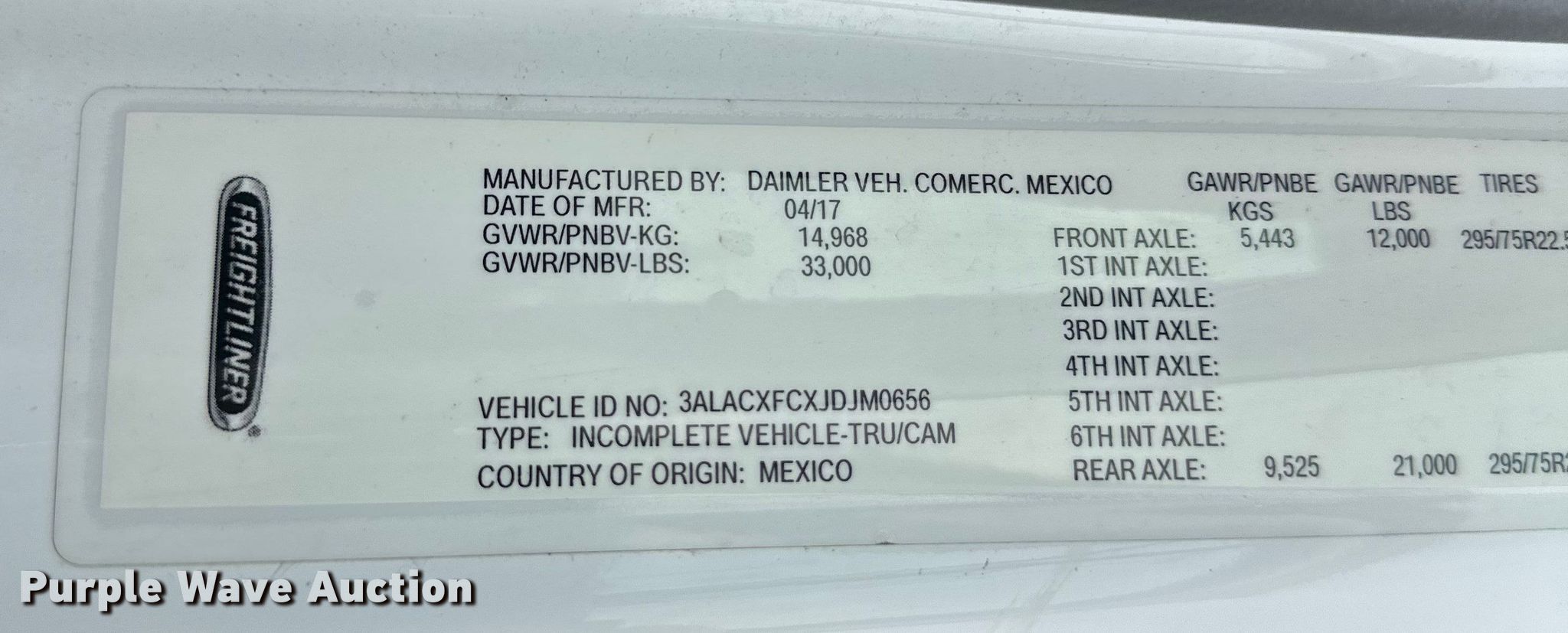 2018 Freightliner Business Class M2 side curtain box truck. Miles: 250,427 on odometer, Hours: 8,342 on meter, VIN: 3ALACXFCXJDJM0656. Engine Cummins, Displacement: 6.7L, Cylinders: 6, Fuel type: Diesel. Transmission Automatic. Chassis Axles: Single, Suspension: Air, Brakes: Air, GVWR: 33,000 lbs. Interior AC, Heat, Heated mirrors, Power windows, Power locks, Cruise control, Backup camera. Features Box bed Delta QX109-26-102-CS, Serial: 98971, 26' L x 95" W x 101" H, Floor: Wood. Tires Size: 295/75R22.5. Notes Transmission issues Drive shaft disconnected from rear axle. Minnesota title. Title distribution may be delayed up to 14 days from verification of funds. MacArthur Co. Butler, WI 53007