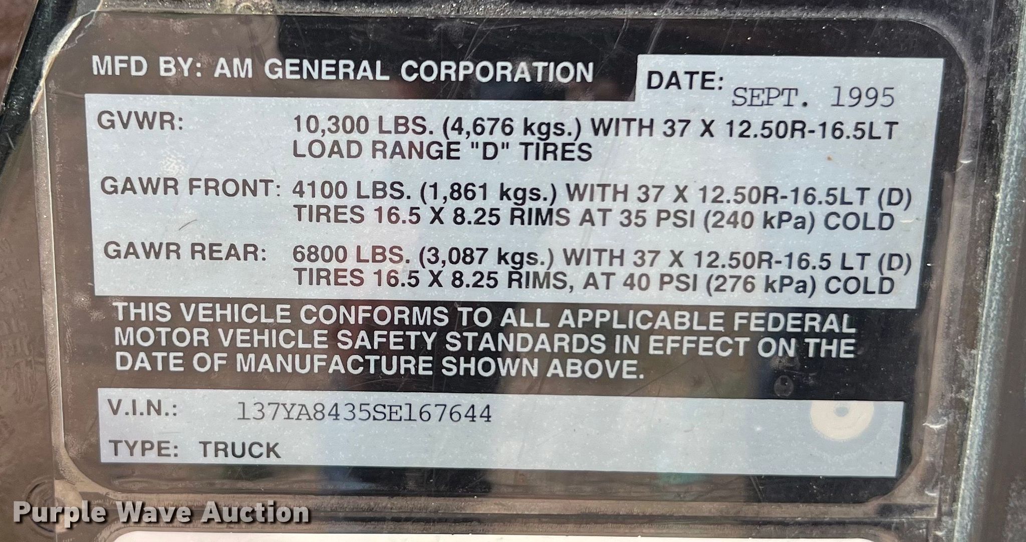 Purple Wave is selling a used Passenger Vehicle in Texas. This item is a 1995 AM General Humvee SUV with the following: Miles: 110,716 on odometer, VIN: 137YA8435SE167644