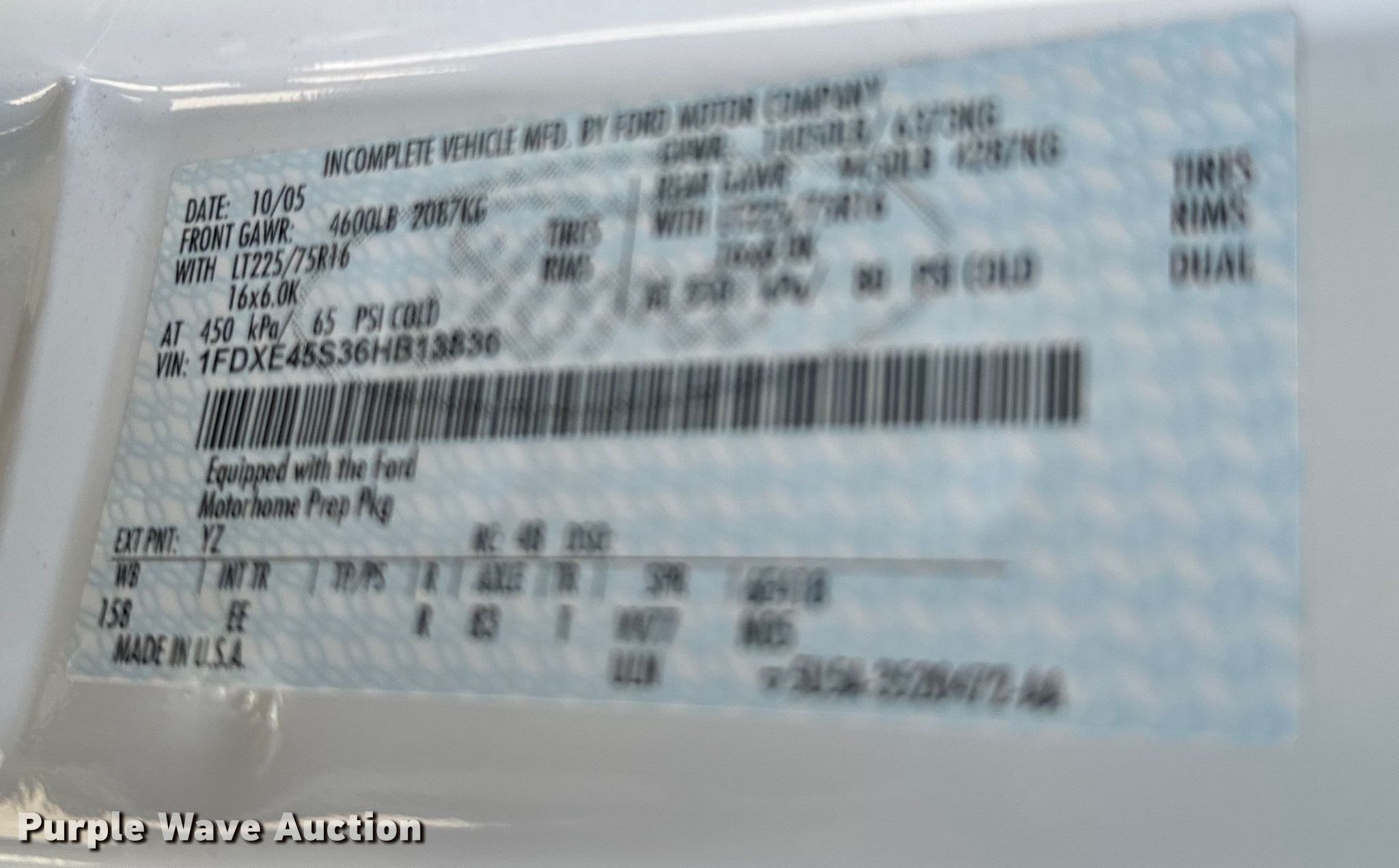 Purple Wave is selling a used RV or Camper in Kansas. This item is a 2006 Ford E450 Super Duty RV with the following: Miles: 20,862 on odometer, Camper length: 29' 6", VIN: 1FDXE45S36HB13836