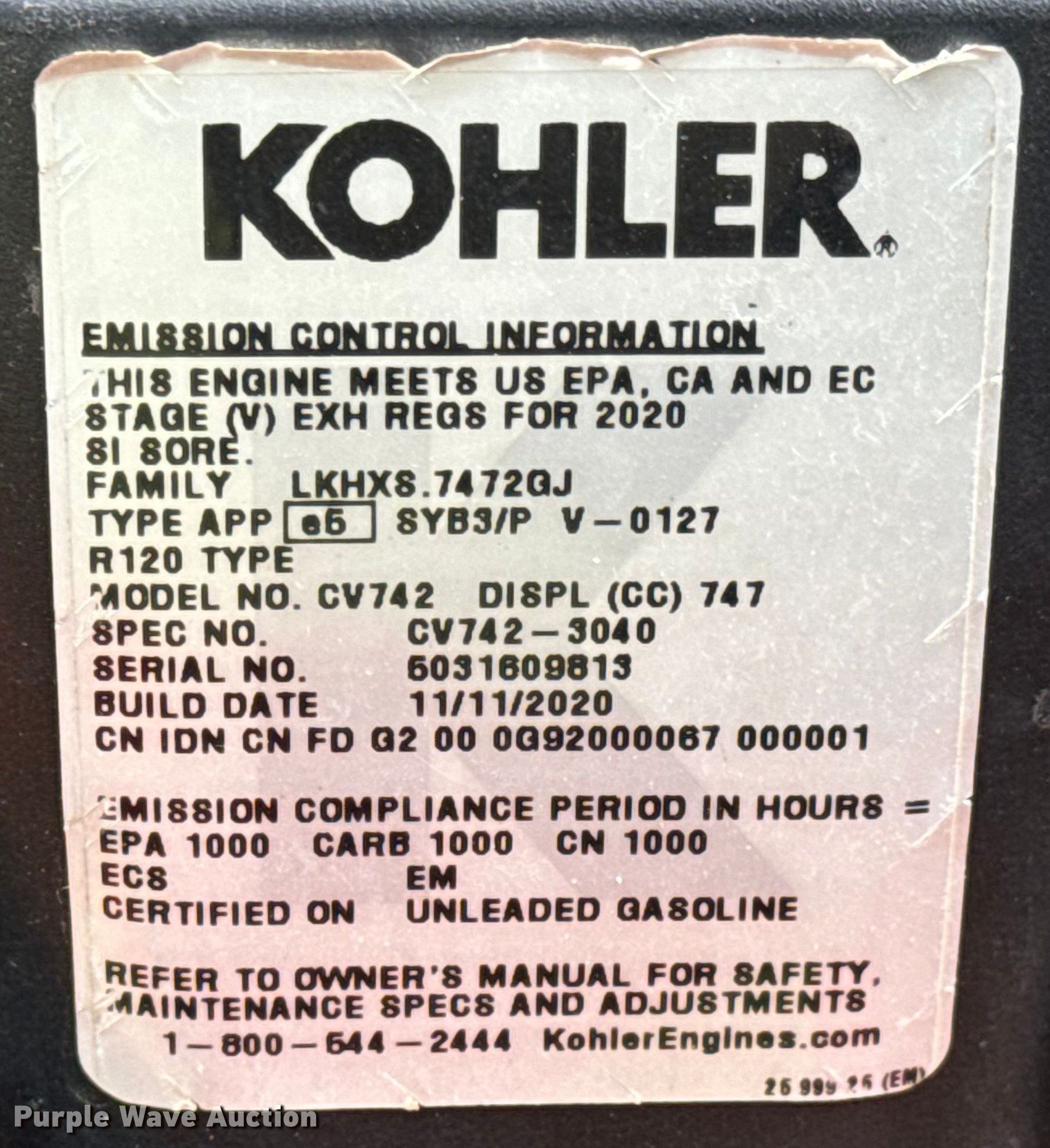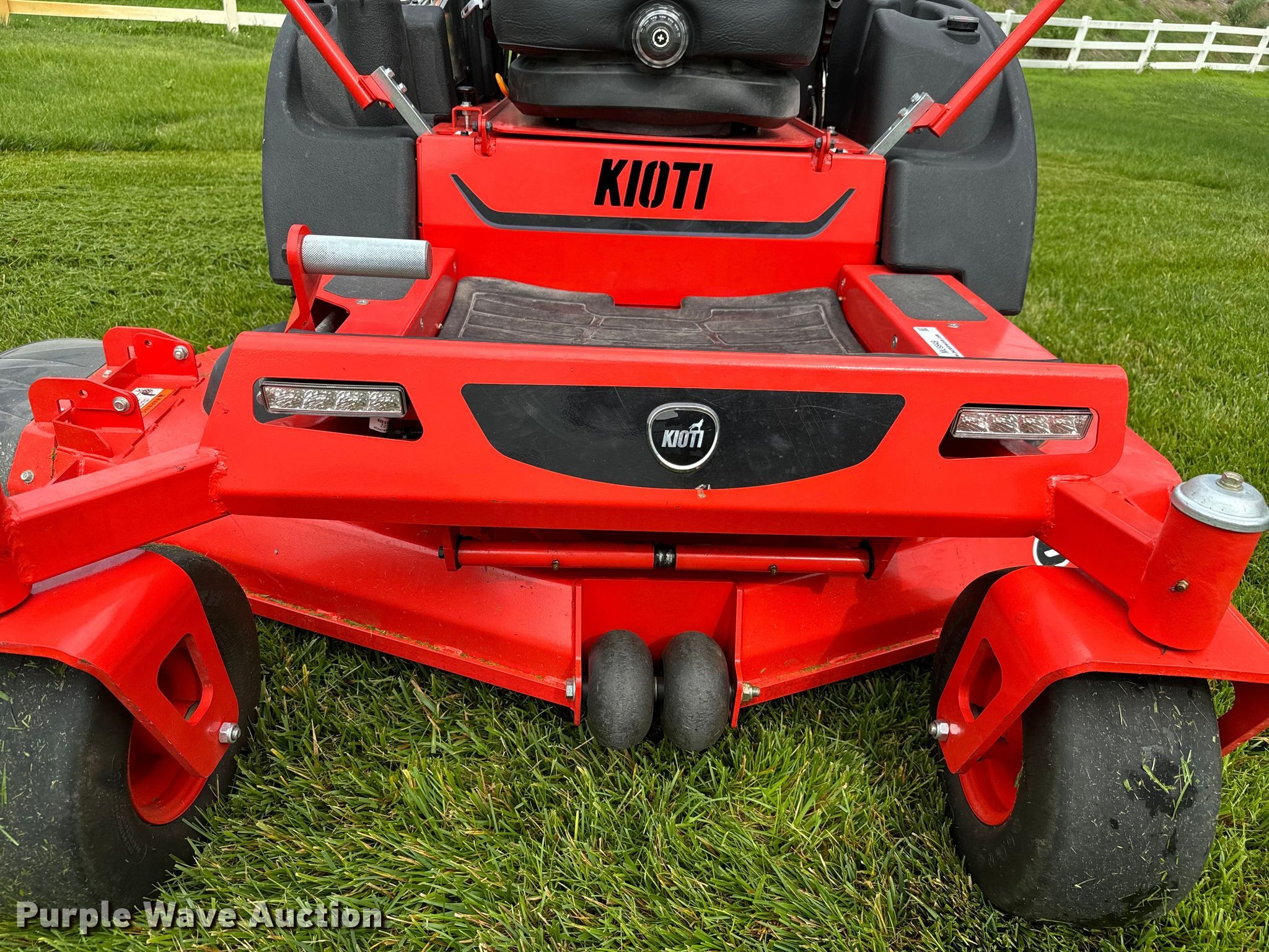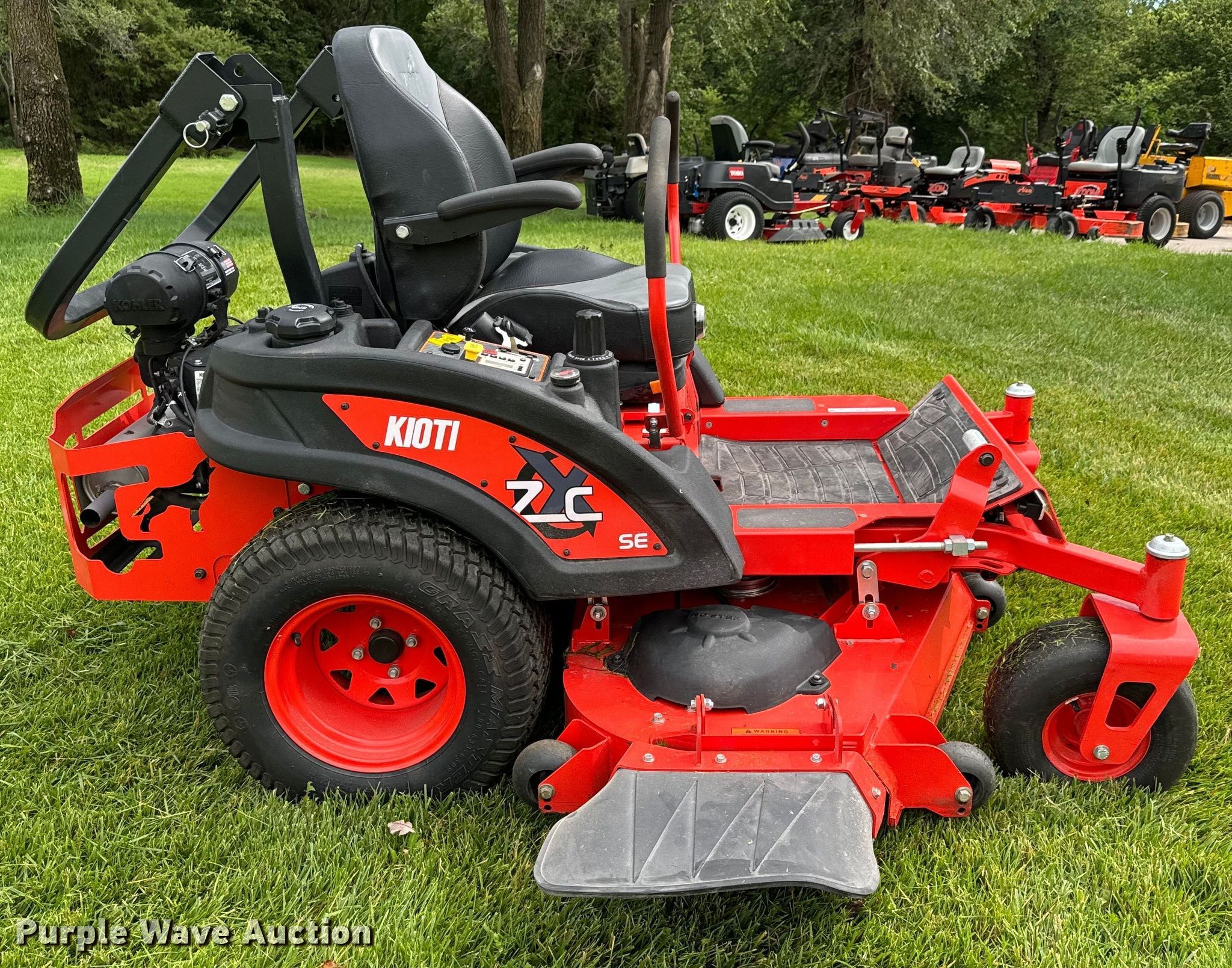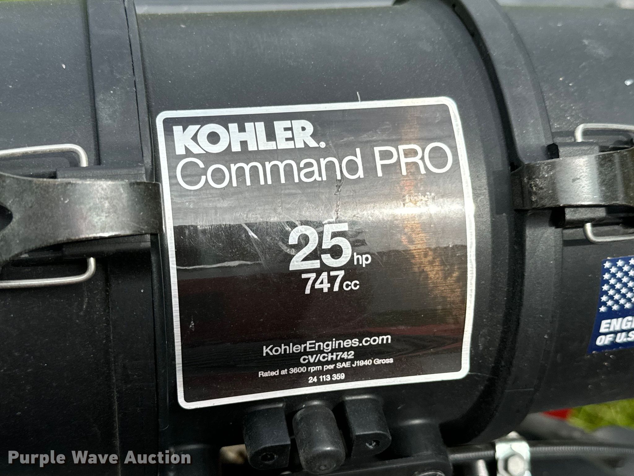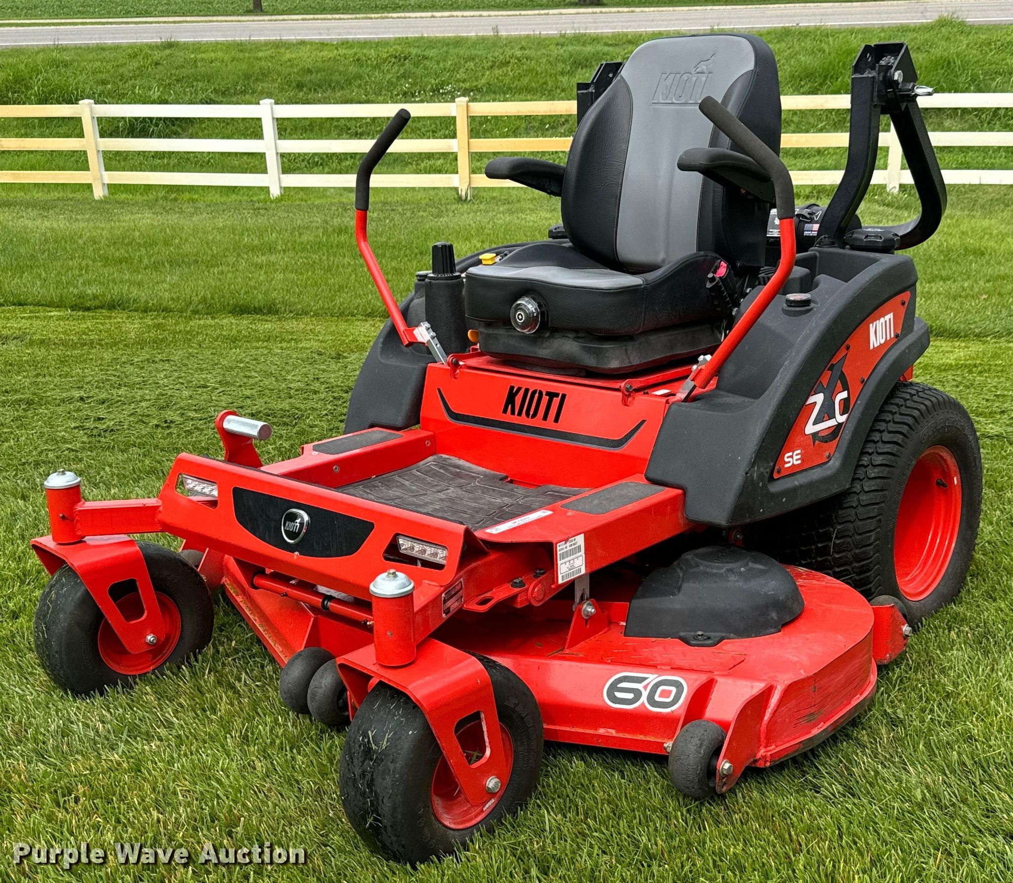 Kioti ZXC SE ZTR lawn mower. Hours: 59 on meter, Cutting width: 60", Serial: XSB100227. Engine Kohler Command Pro CV742, Serial: 5031609813, Displacement: 747 cc, Cylinders: 2, Fuel type: Gas, HP: 25. Transmission Hydrostatic. Operators station OROPS. Features Rear drawbar, Mower deck Width: 60", Kioti. Tires Front: 13x6.50-6, Rear: 23x10.50-12. Sedgwick, KS 67135