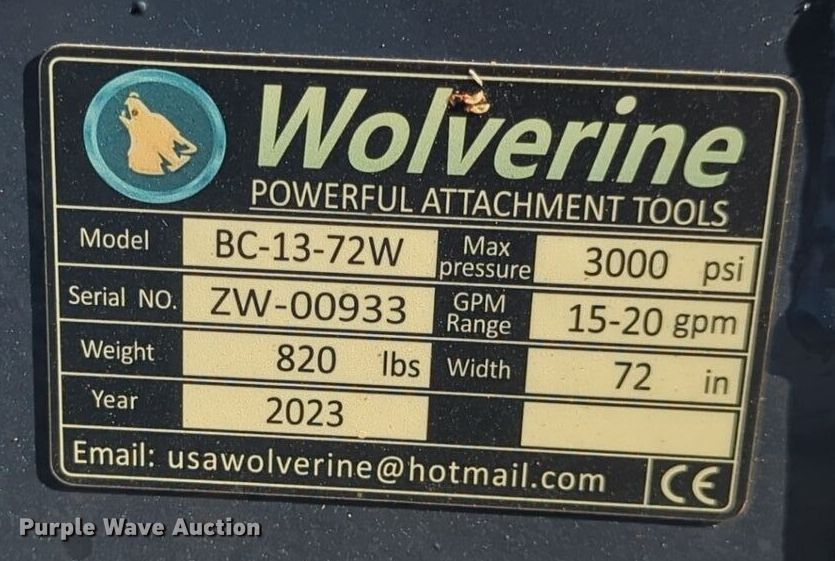 Purple Wave is selling a used Skid Steer Attach. in Oklahoma. This item is a 2023 Wolverine BC-13-72W skid steer rotary mower with the following: Serial: ZW-00933, Width: 72", Unused