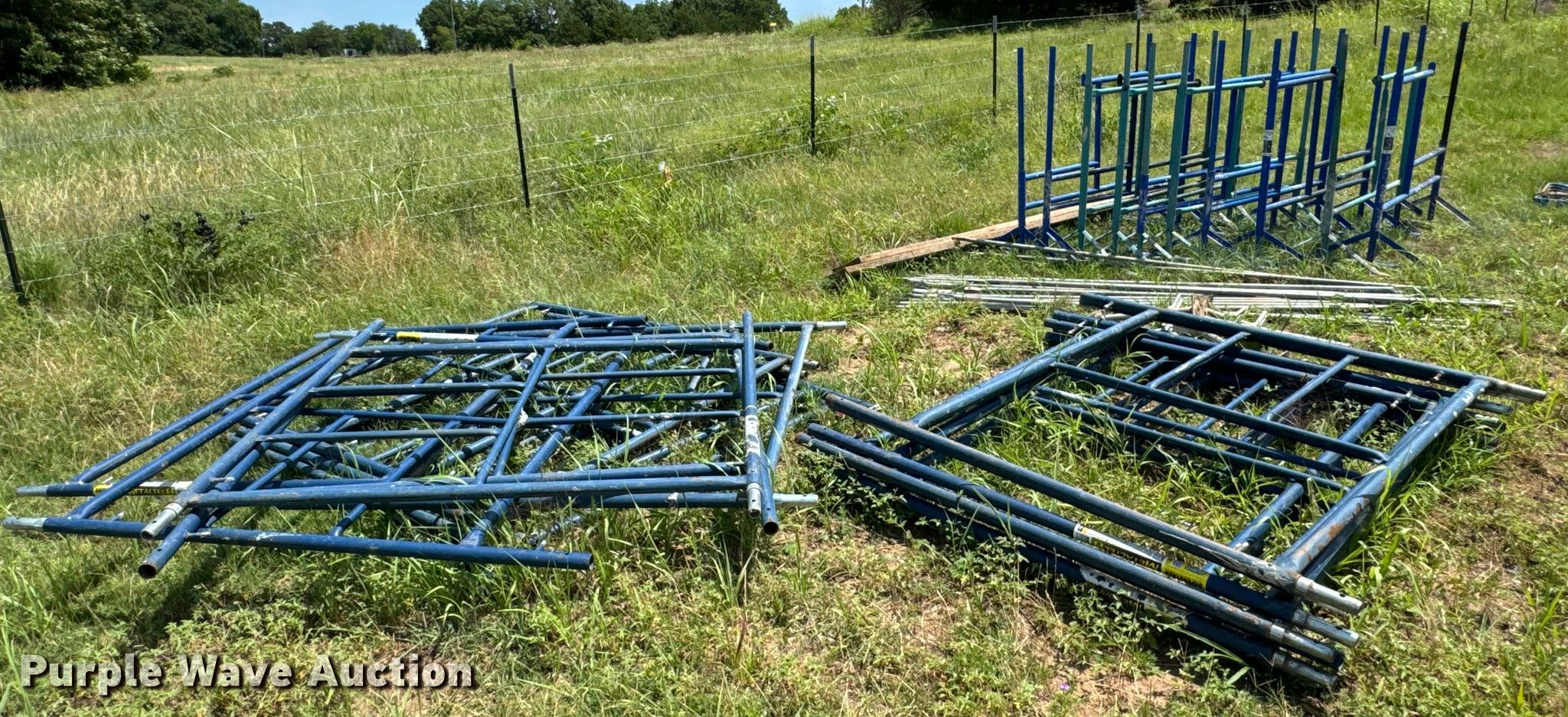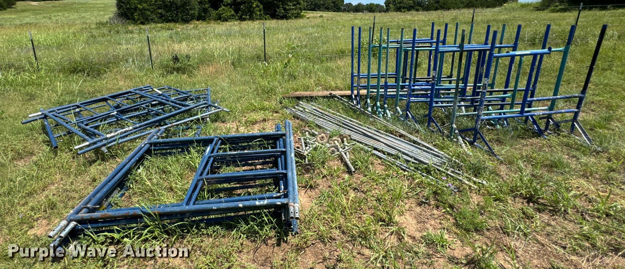 Purple Wave is selling a used Tools in Oklahoma. This item is a Metal tech Saferstack scaffolding with the following: (10) bases, 45"x40", (18) 5' wide sides