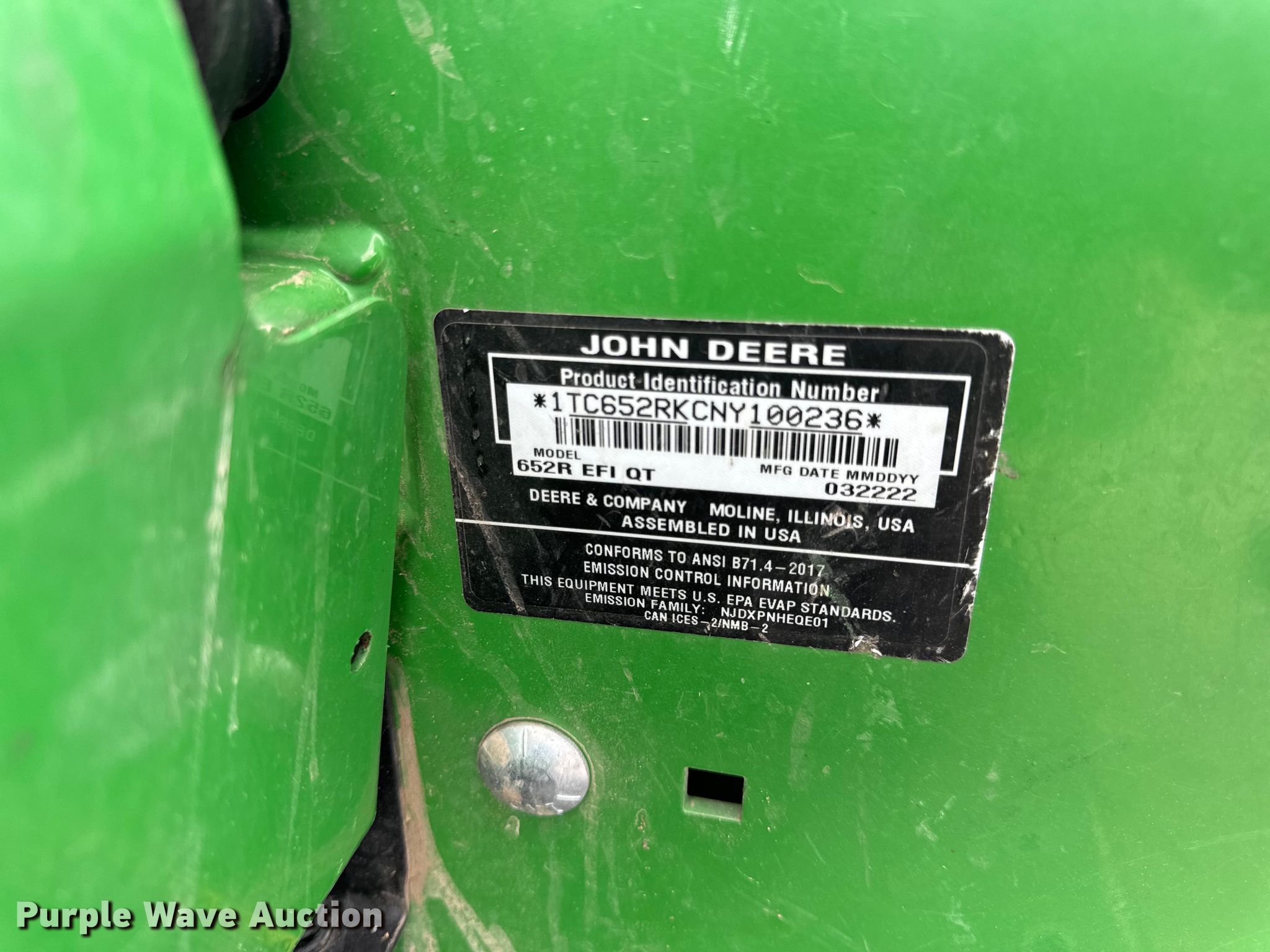 Purple Wave is selling a used Commercial Turf Mower in Missouri. This item is a 2022 John Deere 652R ZTR lawn mower with the following: Hours: 767 on meter, Cutting width: 52", Serial: 1TC652RKCNY100236