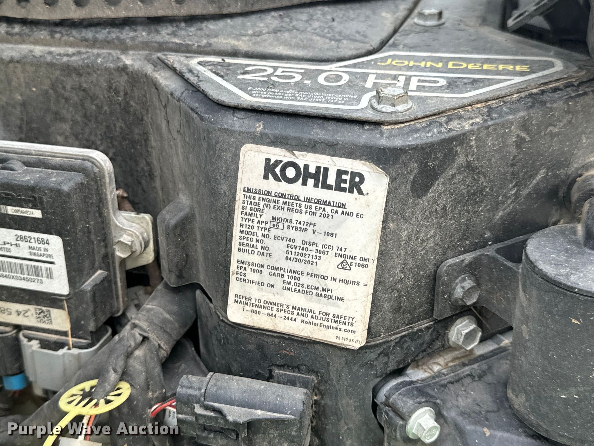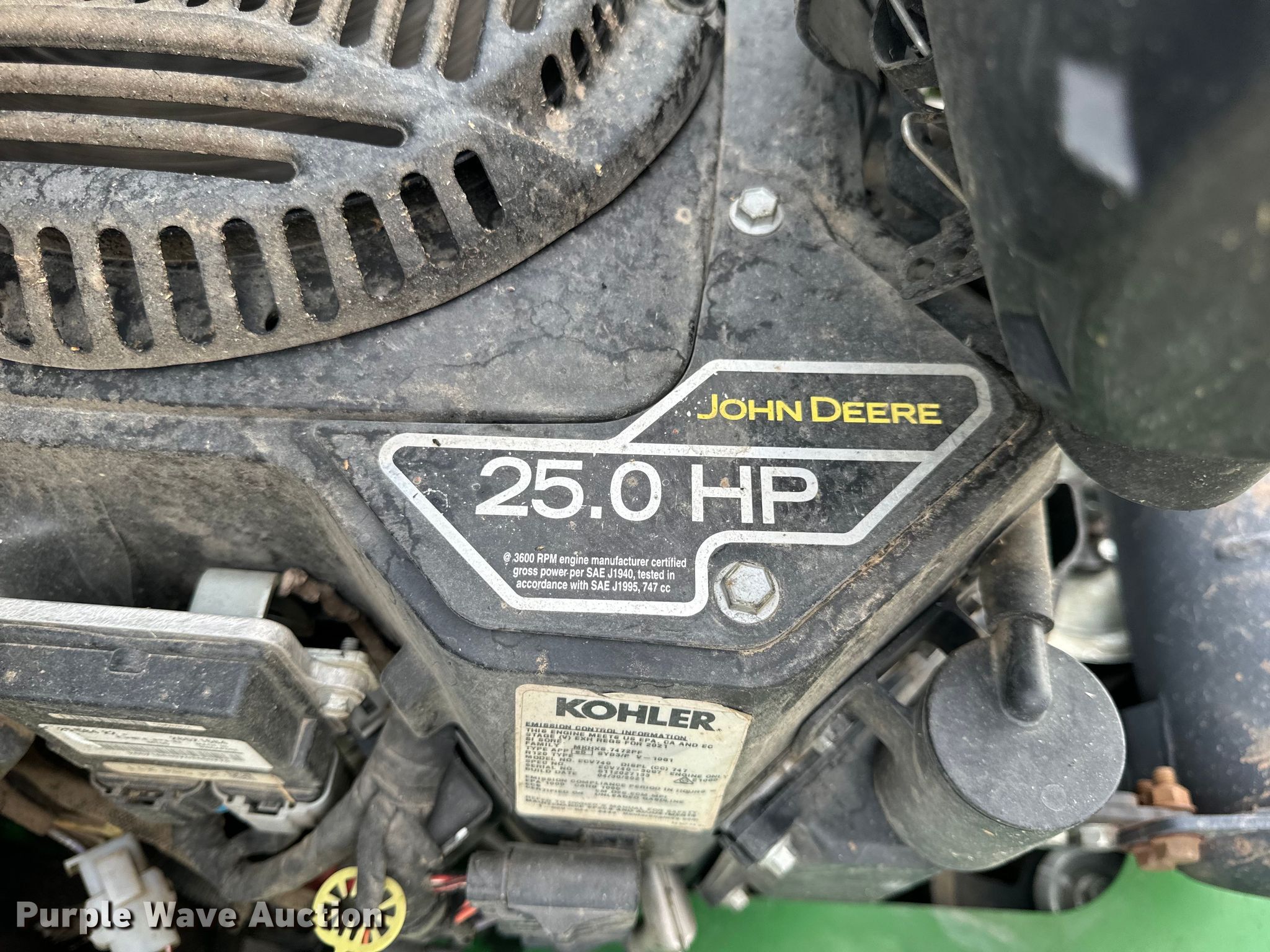 2021 John Deere 661R ZTR lawn mower. Hours: 890 on meter, Cutting width: 61", Serial: 1TC661RMKMY090246. Engine Kohler ECV740, Serial: 5112027133, Displacement: 747 cc, Cylinders: 2, Fuel type: Gas, HP: 25. Transmission Hydrostatic. Chassis PTO. Features Stand on. Tires Front: 13X6.50-6/4.50, Rear: 20X10.00-8. Notes Grass deflector chute missing. Quality Cut Lawn Care LLC. Columbia, MO 65201