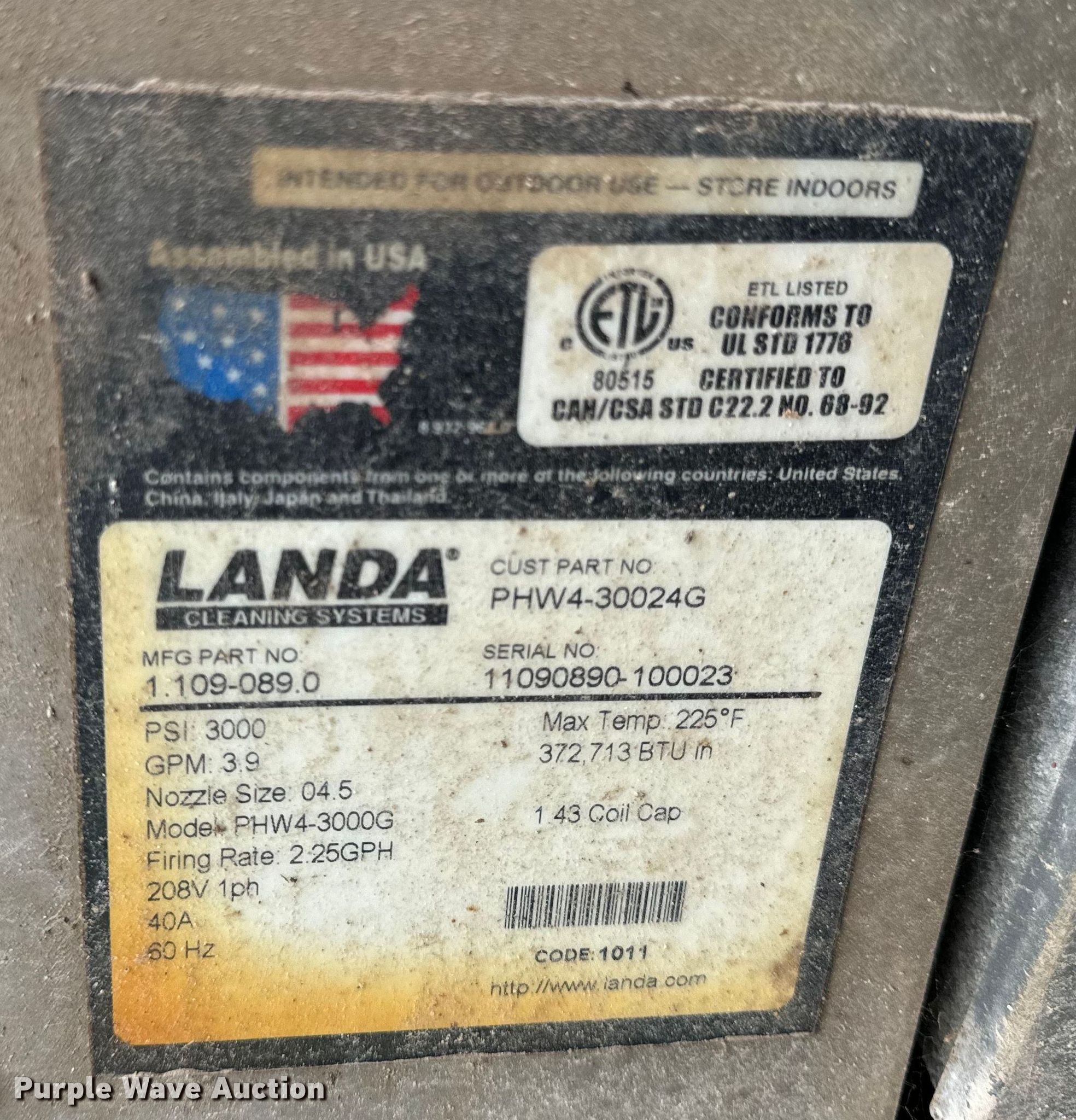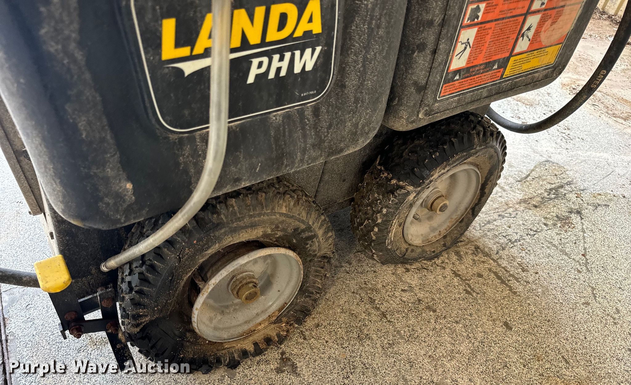 Landa PHW pressure washer. Hours: 857 on meter, Serial: 11090890-100023. Electric Motor Volts: 240, Phase: Single, Amp: 40, Hz: 60. Features Diesel heat, Max temperature: 225 degrees, Max PSI: 3,000, GPM: 3.9. Tires Size: 4.10/3.50-6. Notes Tires damaged, Unknown operating condition. Co-Mo Electric Cooperative. Tipton, MO 65081