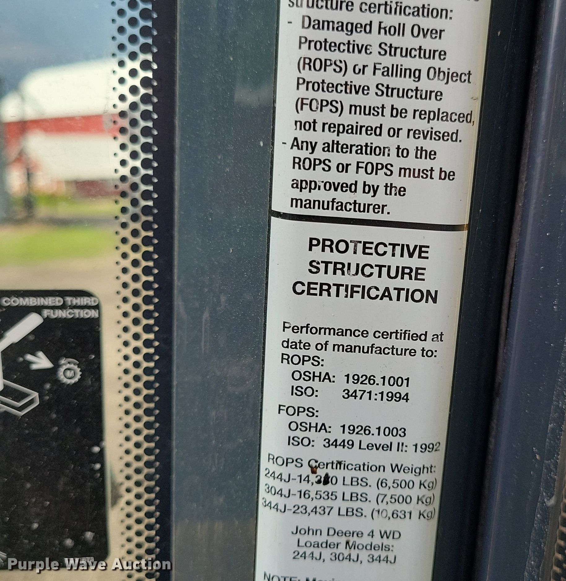 2012 John Deere 344J wheel loader. Hours: 7,840 on meter, Serial: 1LU344JXTZB028977. Engine John Deere, Serial: 4045HT281, Cylinders: 4, Fuel type: Diesel. Transmission Hydrostatic, Two speed travel. Operators station Enclosed cab, AC, Heat, Bucket controls: Joystick. Features Quick coupler: Hydraulic, Counter weights, Bucket Width: 94", Cutting edge: Bolt-on. Tires Size: 17.5R25. Sterling, IL 61081