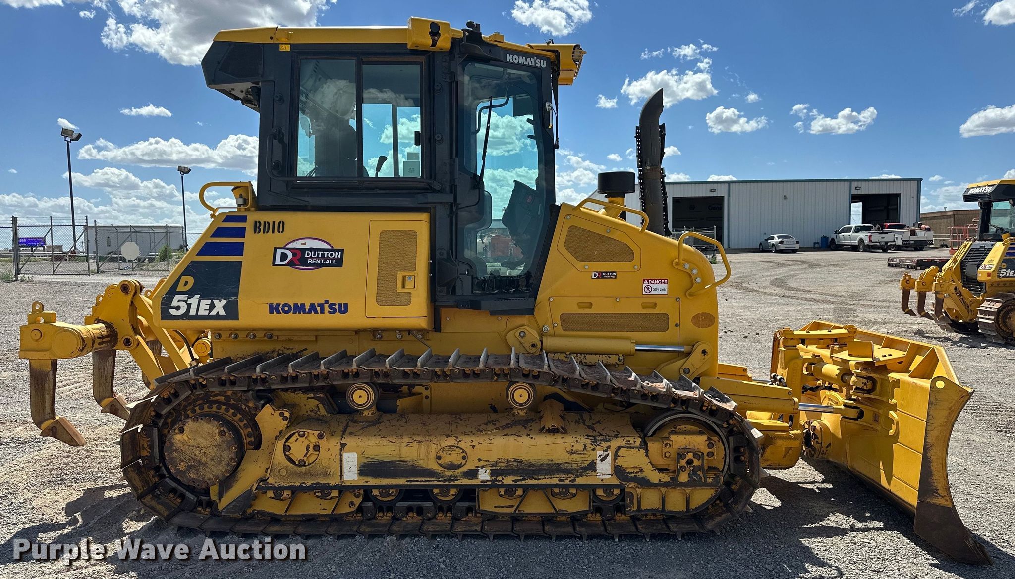 2022 Komatsu D51EX-24 dozer. Hours: 1,464 on meter, Serial: KMT0D133HNA015719, Unit #: BD10. Engine Komatsu SAA4D107E-3, Serial: 26757863, Displacement: 4.5L, Cylinders: 4, Fuel type: Diesel, HP: 133, kW: 99. Transmission Hydrostatic. Operators station OROPS, AC, Heat, Electronic Monitoring System panel, Steering: Joystick. Features Dozer blade Type: 6-way, Straight, Width: 10', Attachments Ripper Komatsu 4CD01-S, Shanks: 3.. Tracks Width: 22", Grouser pads: Single, Bottom rollers: 7, Track guards. Notes Power train warranty valid through July 28, 2026 or 4,000 hours. Dutton Rent-All, Inc. - Open Inspection Wednesday, July 24. 305 Southeast 4th Street. Lindsay, OK 73052