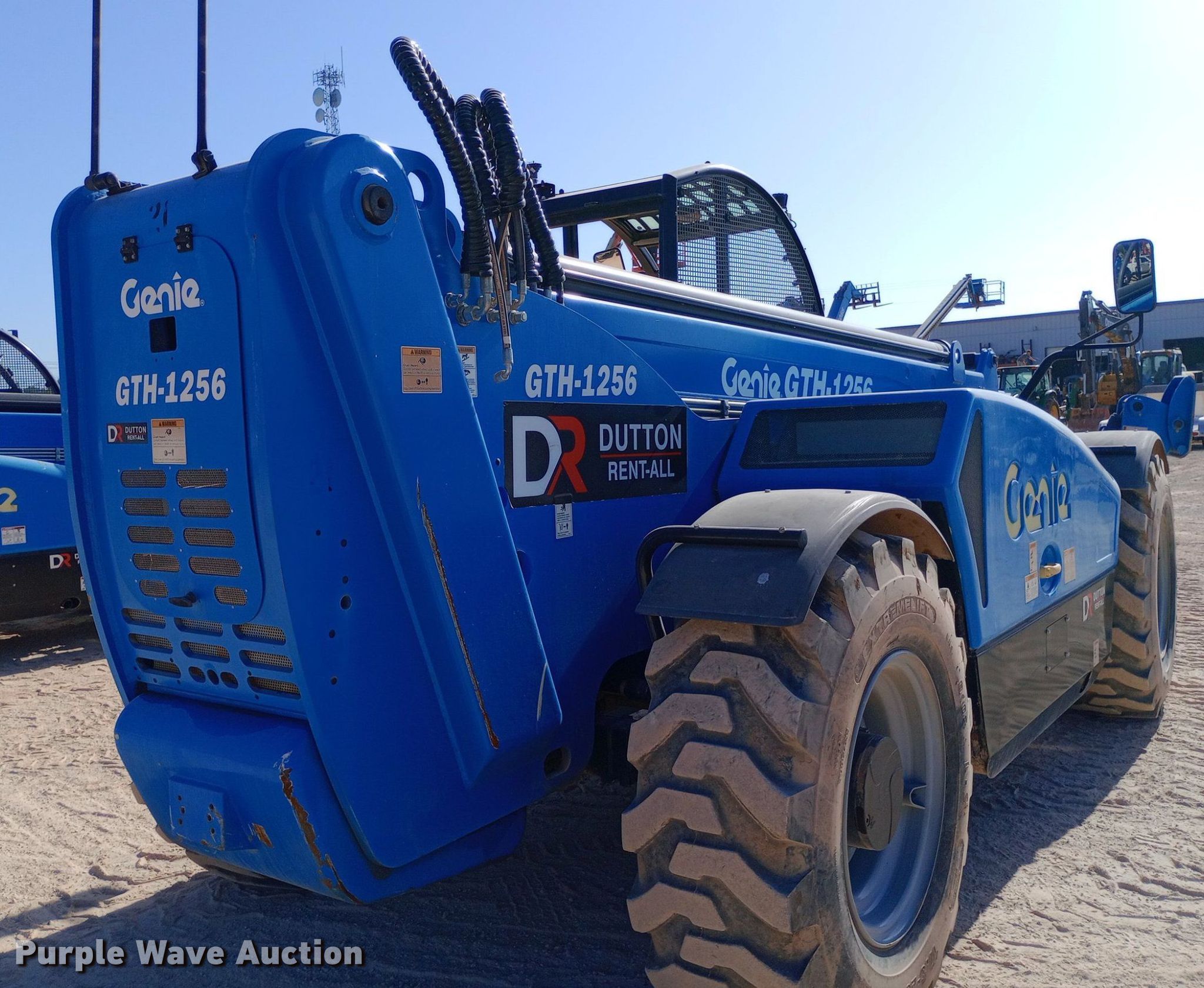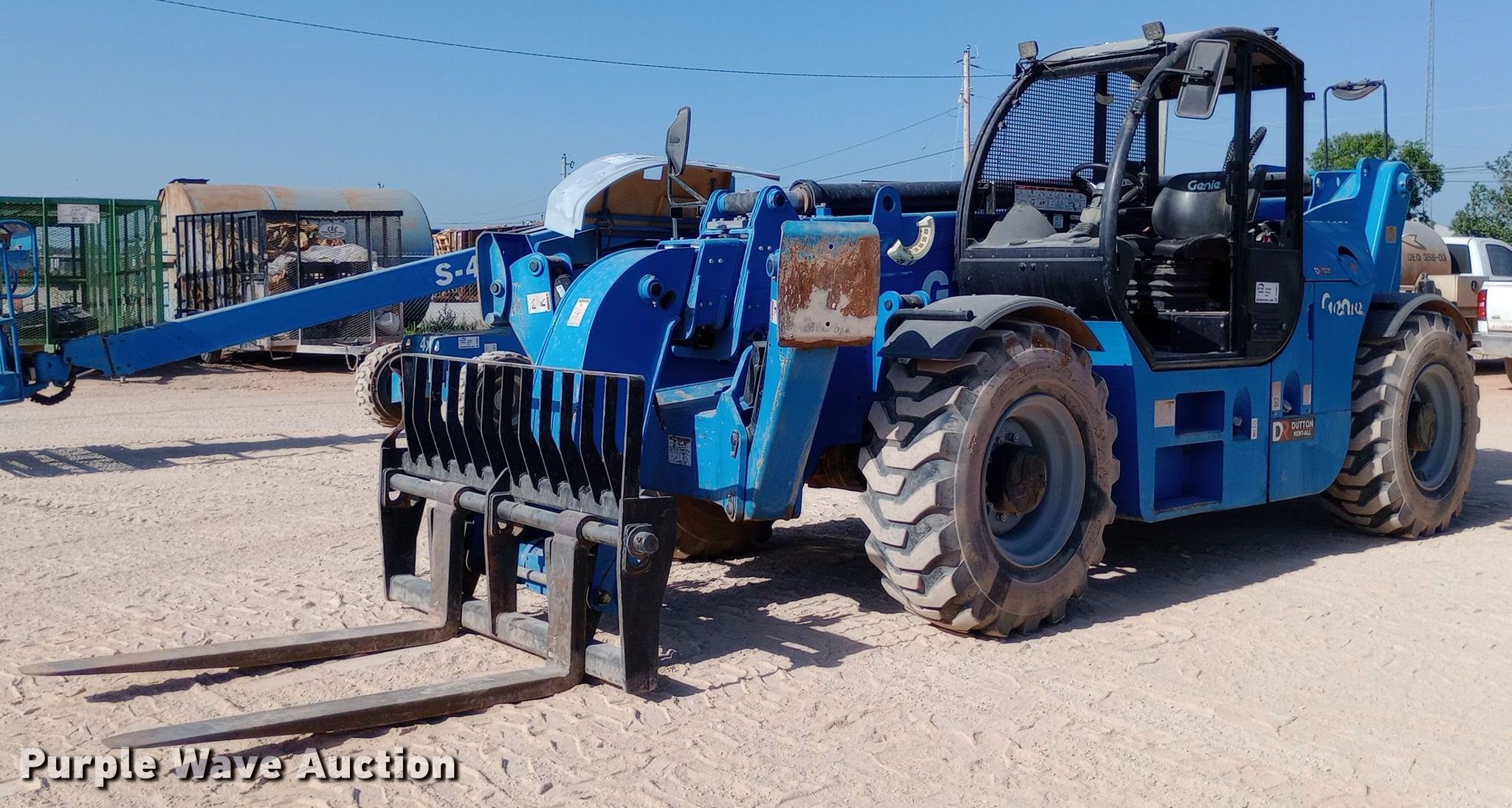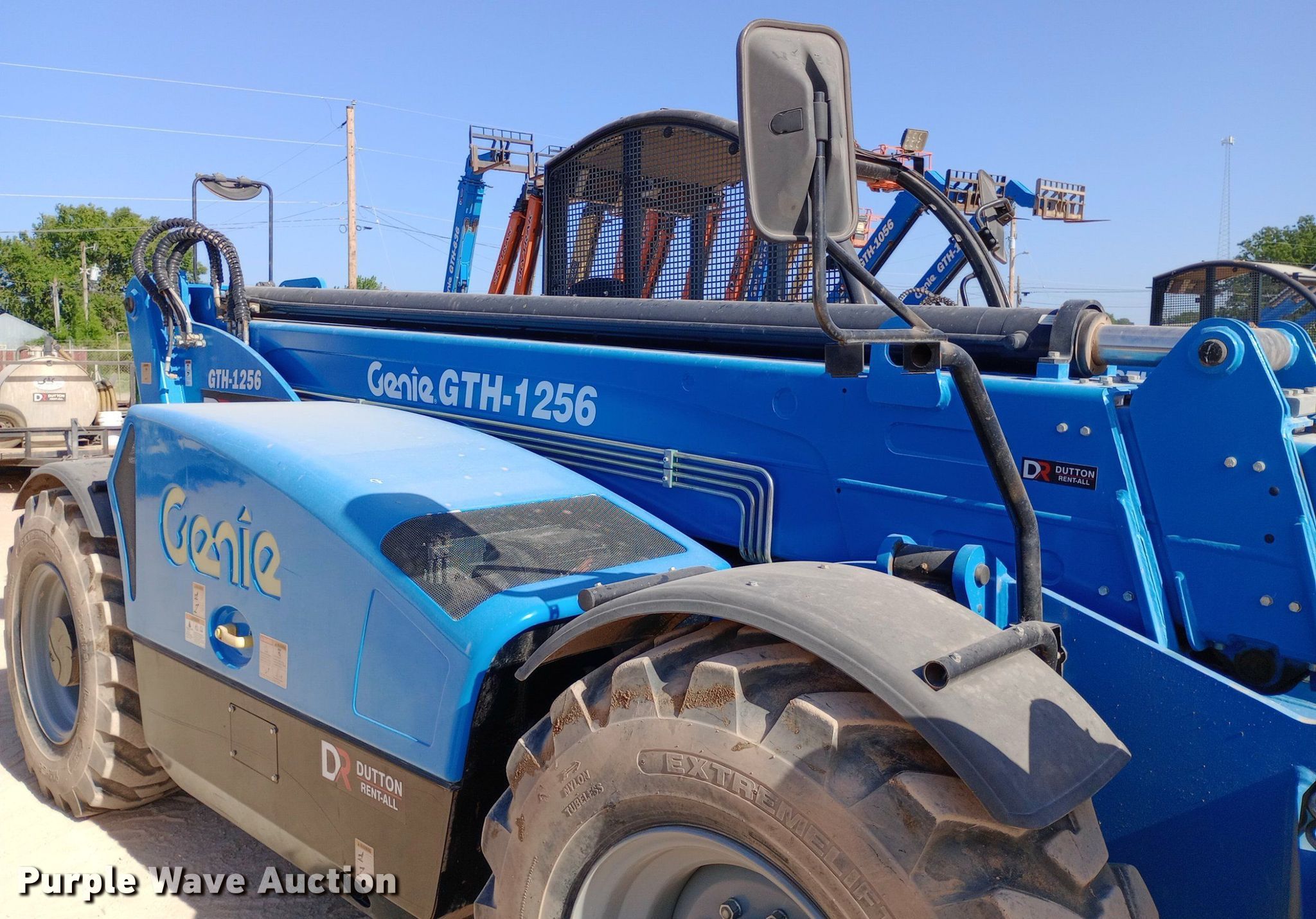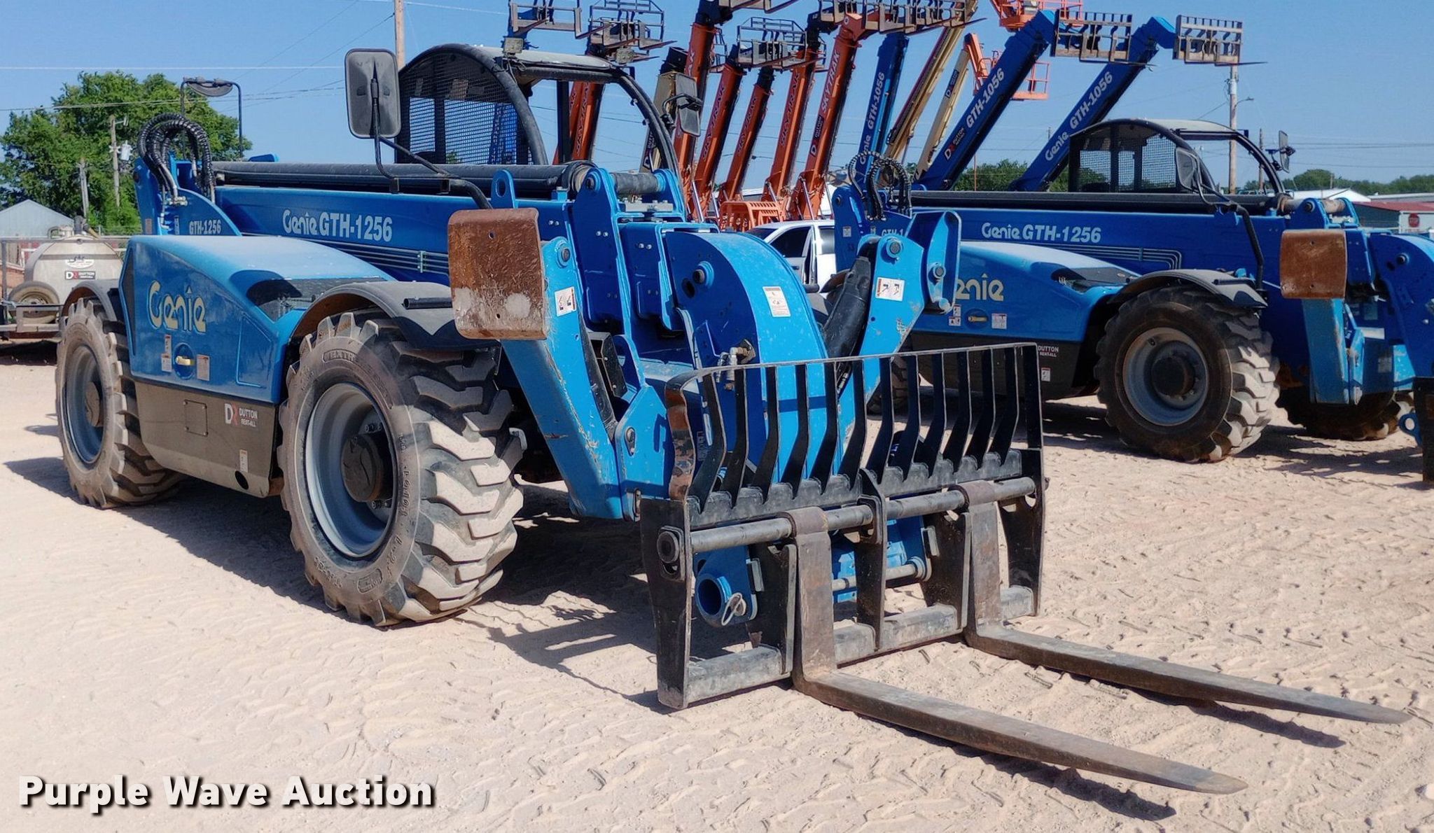 2019 Genie GTH-1256 telehandler. Hours: 1,276 on meter, Serial: CPJTCN0367, Unit #: ST21. Engine Deutz, Cylinders: 4, Fuel type: Diesel. Transmission Powershift, Four wheel drive. Operators station OROPS, Steering: Crab, Four wheel. Features Maximum lift capacity: 12,000 lbs, Maximum lift height: 56', Boom stages: 4, Fork length: 60", Hydraulic outriggers, Hydraulic leveling. Tires Size: 17.5-25. Dutton Rent-All, Inc. - Open Inspection Wednesday, July 24. 305 Southeast 4th Street. Lindsay, OK 73052