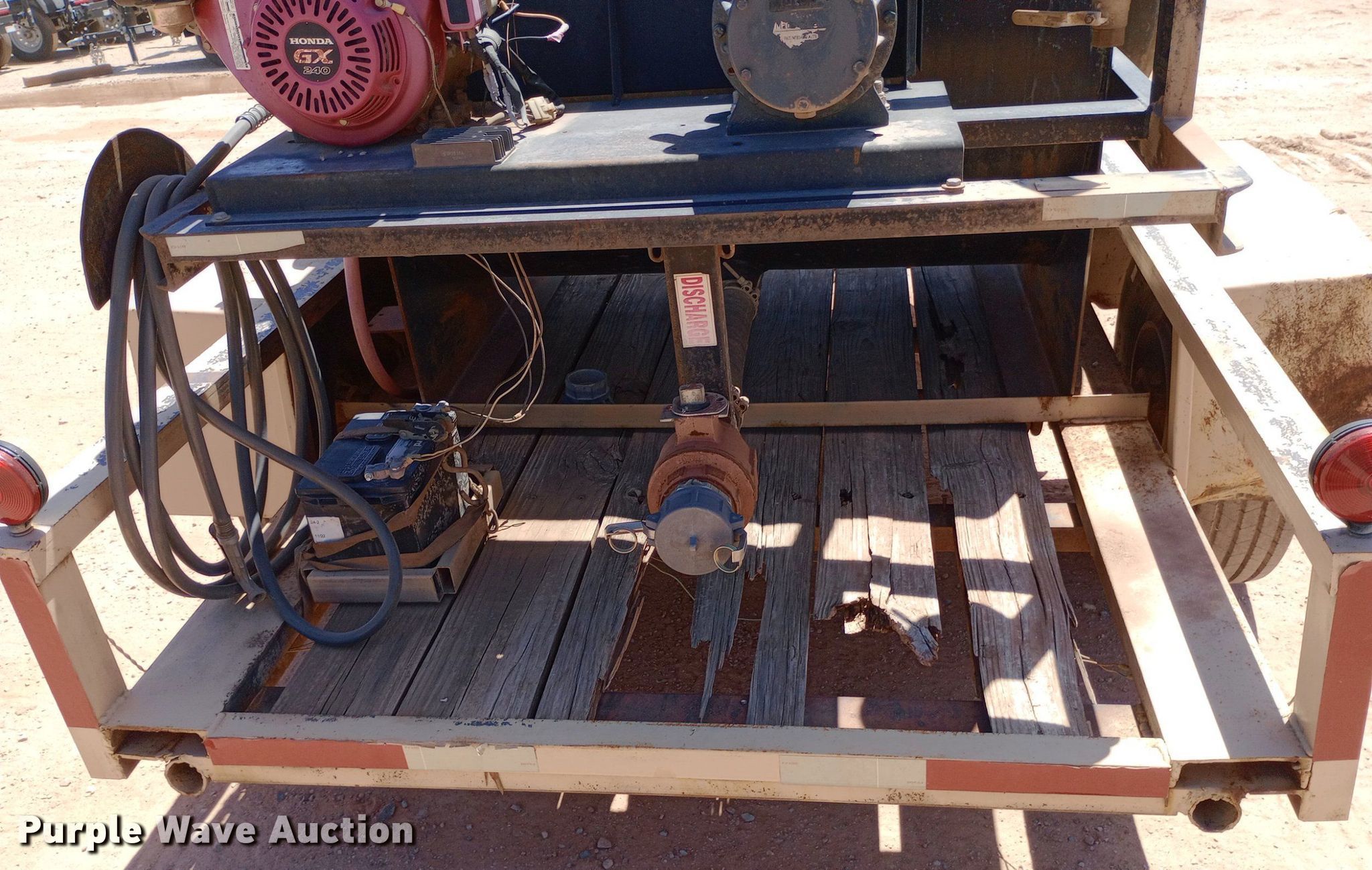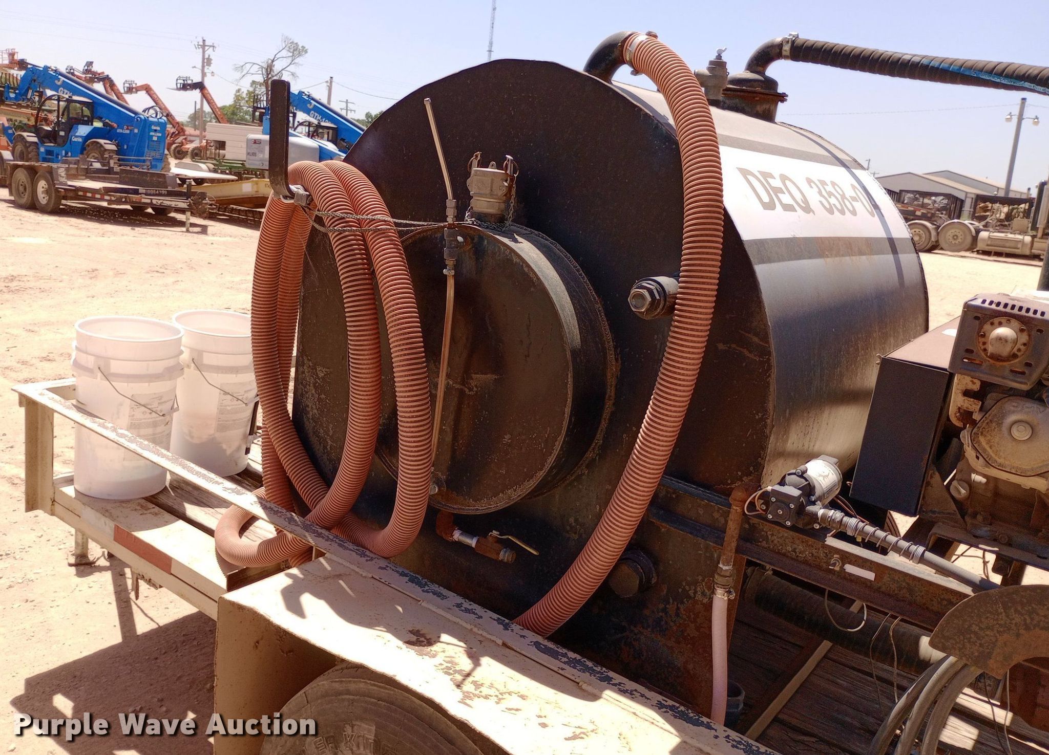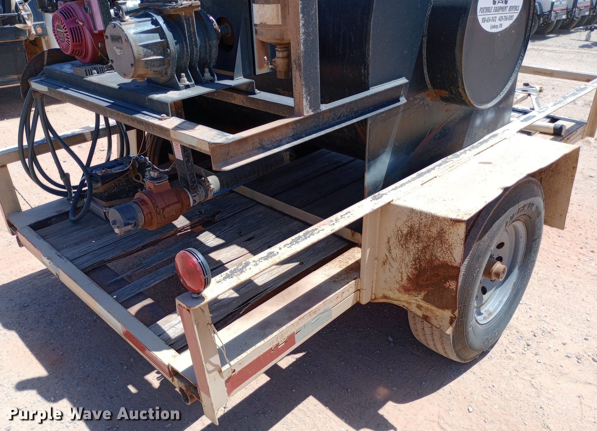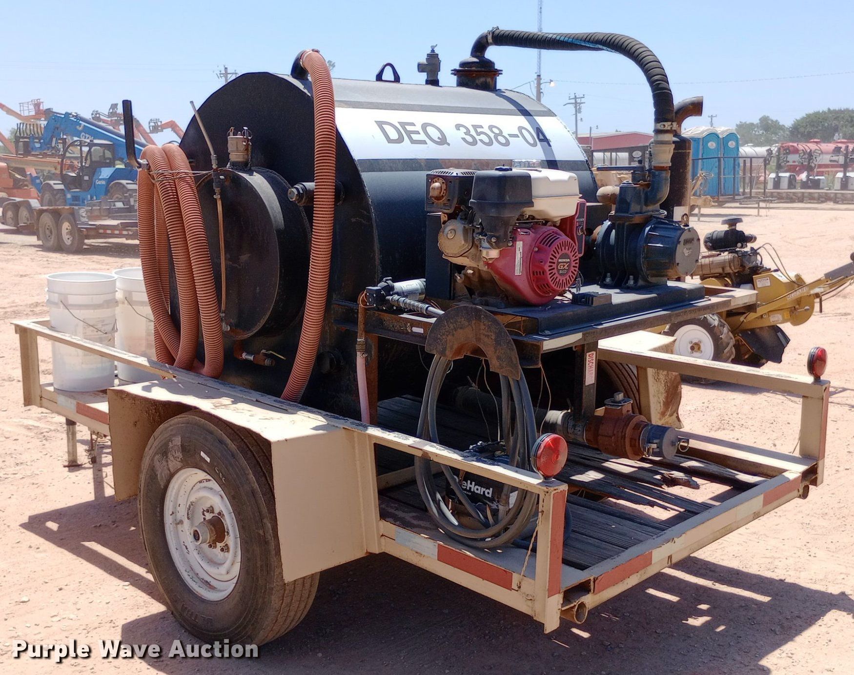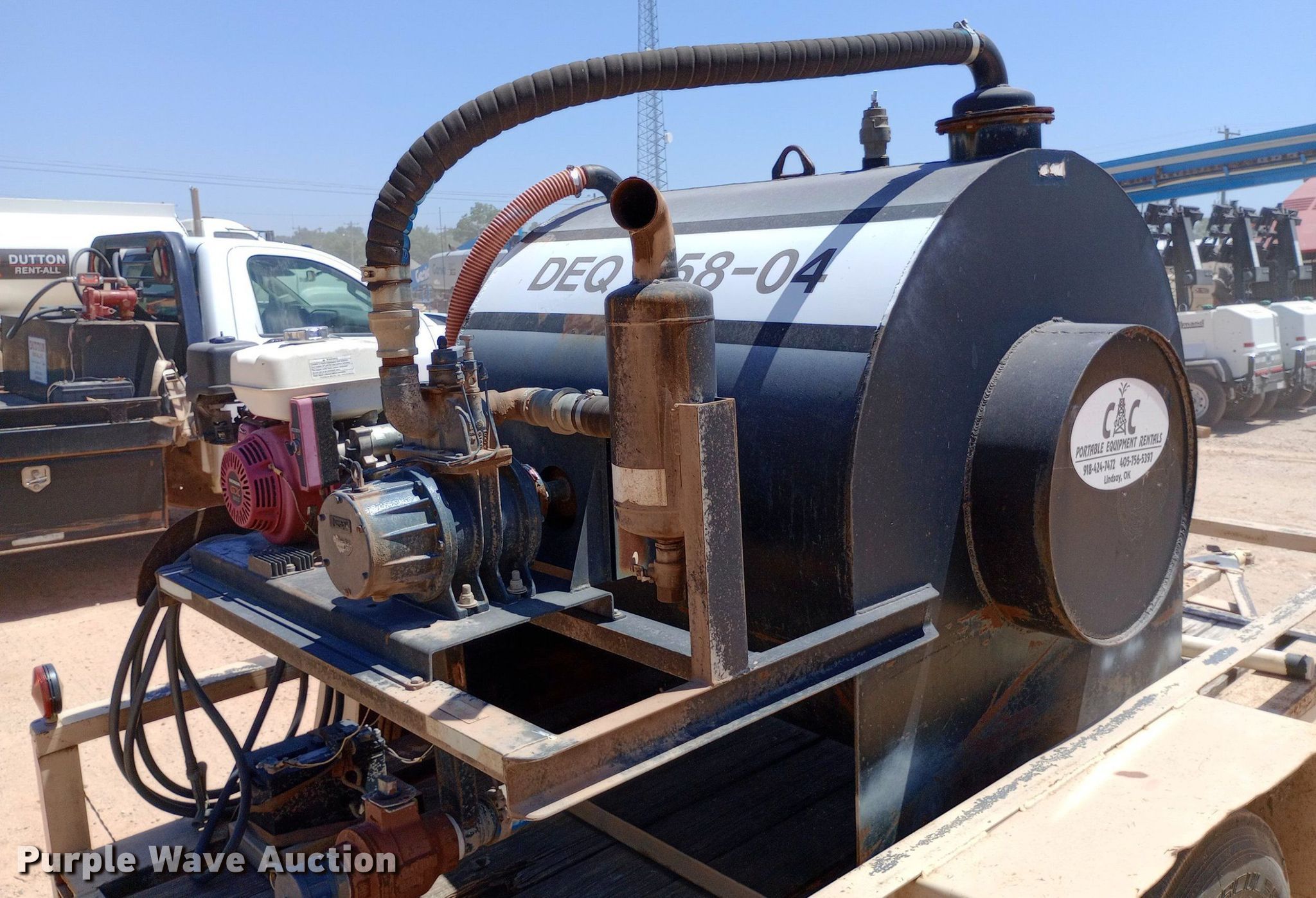 DEQ 358-04 vacuum excavator. Engine. Honda GX240, Cylinders: 1, Fuel type: Gas. Features Spoils tank Capacity: 375 gallons, Water tank, Water pump, Vacuum pump Jurop 18275, Inlet valve size: 2", Outlet valve size: 4". Trailer 14' L x 86" W, Ball hitch size: 2 5/16", Suspension: Spring, Axles: Single, Tire size: 235/85R16. Transfer of ownership documentation will be a bill of sale. Dutton Rent-All, Inc. - Open Inspection Wednesday, July 24. 305 Southeast 4th Street. Lindsay, OK 73052