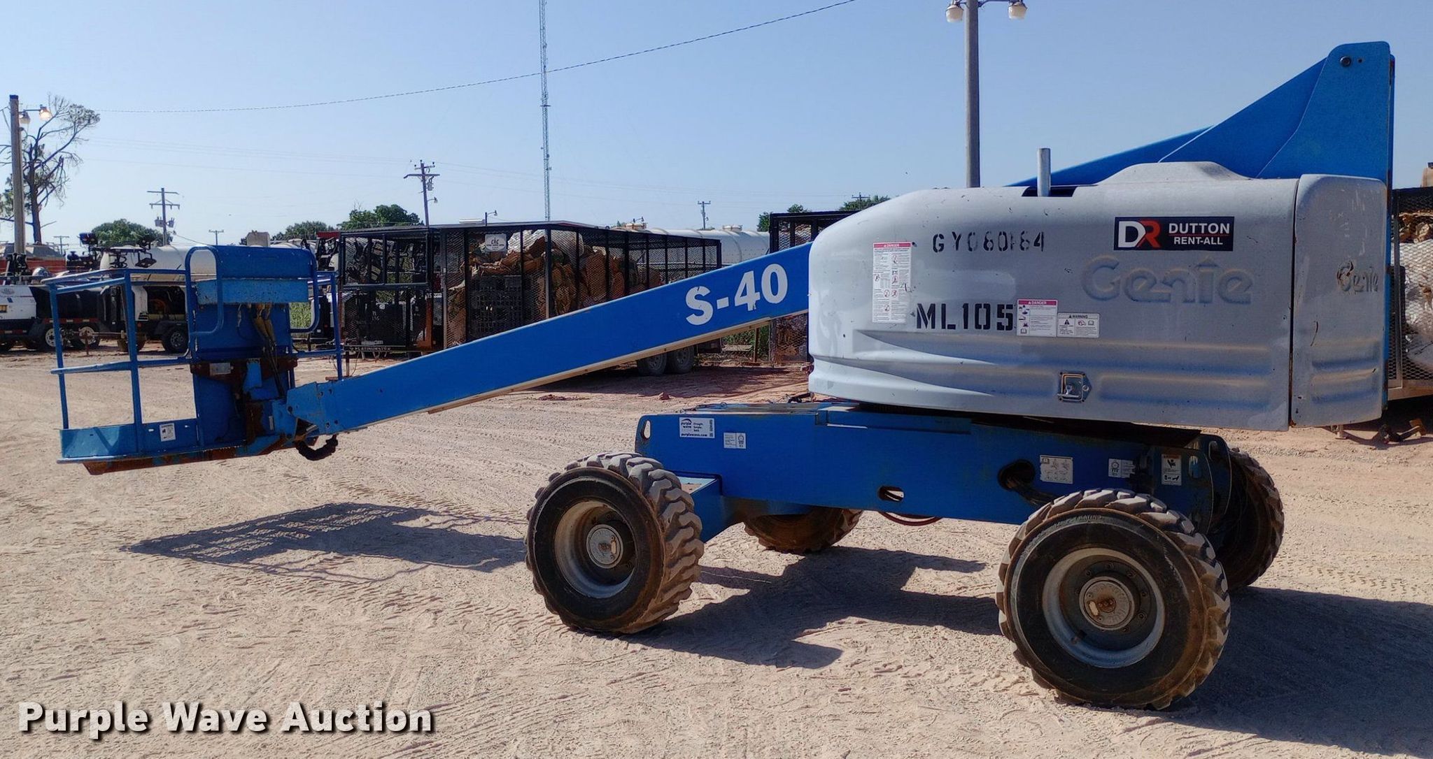 Purple Wave is selling a used Boom Lift in Oklahoma. This item is a 2008 Genie S-40 boom lift with the following: Hours: 3,623 on meter, Serial: S4008-15050