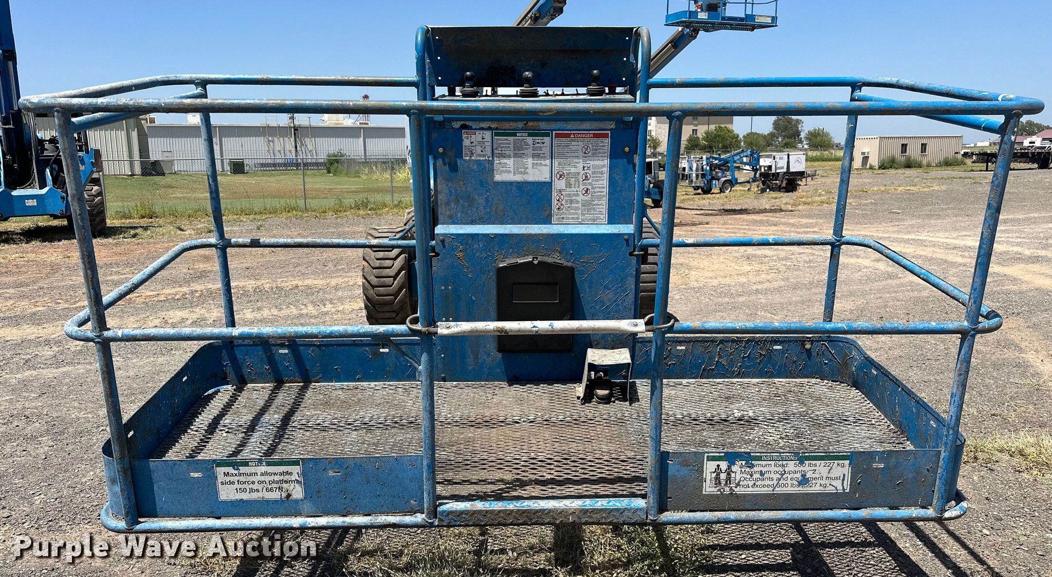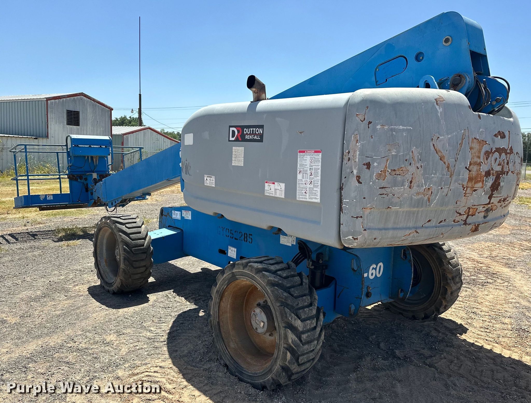 2006 Genie S-60 boom lift. Hours: 3,895 on meter, Serial: S6006-13149. Engine Deutz F3L, Serial: 10093553, Displacement: 2.332L, Cylinders: 3, Fuel type: Diesel, HP: 48, kW: 35.8. Chassis Four wheel drive. Features Rough terrain, Boom type: Articulating, Telescopic, Maximum lift capacity: 500 lbs, Maximum reach length: 50' 4", Maximum lift height: 60' 2", Hydraulic leveling, Platform: 94" L x 34" W, Controls: Platform, Ground, Platform rotation: Hydraulic, Safety alarm. Tires Tire size: 355/55D625. Dutton Rent-All, Inc. - Open Inspection Wednesday, July 24. 305 Southeast 4th Street. Lindsay, OK 73052