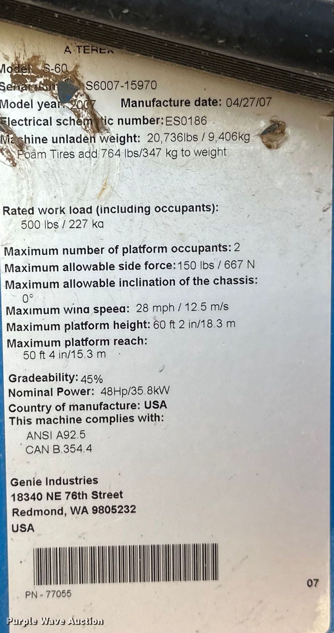 Purple Wave is selling a used Boom Lift in Oklahoma. This item is a 2007 Genie S-60 boom lift with the following: Hours: 4,384 on meter, Serial: S6007-15970
