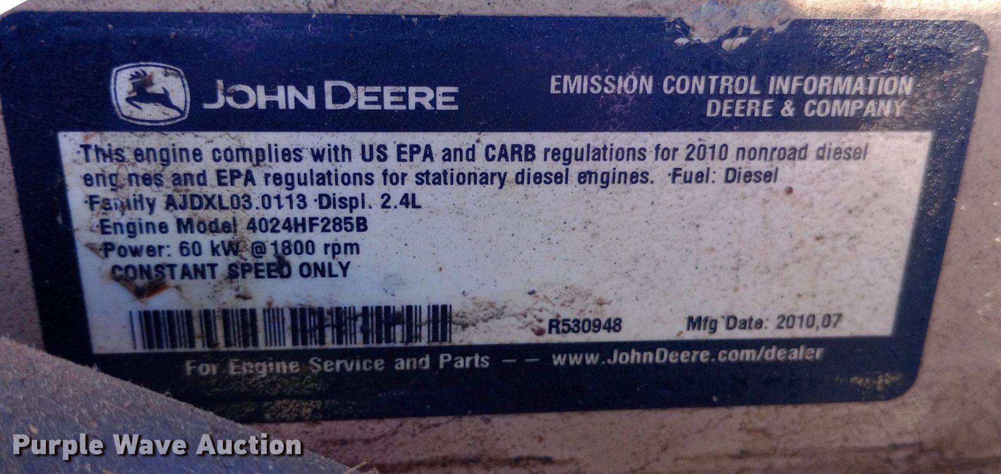Magnum MMG55FH generator. Serial: 1102148, Hours: 5,280 on meter. Engine John Deere, Displacement: 2.4L, Cylinders: 4, Fuel type: Diesel. Features Generator kVA: 47, kW: 47, Phase: Single, Three, Electric start. Trailer 12' L x 56" W, Ball hitch size: 2", Suspension: Spring, Axles: Single, Tire size: 225/75R15. Notes Dead battery. This is worksite support equipment and will not come with a title. Transfer of ownership documentation will be a bill of sale. Dutton Rent-All, Inc. - Open Inspection Wednesday, July 24. 305 Southeast 4th Street. Lindsay, OK 73052