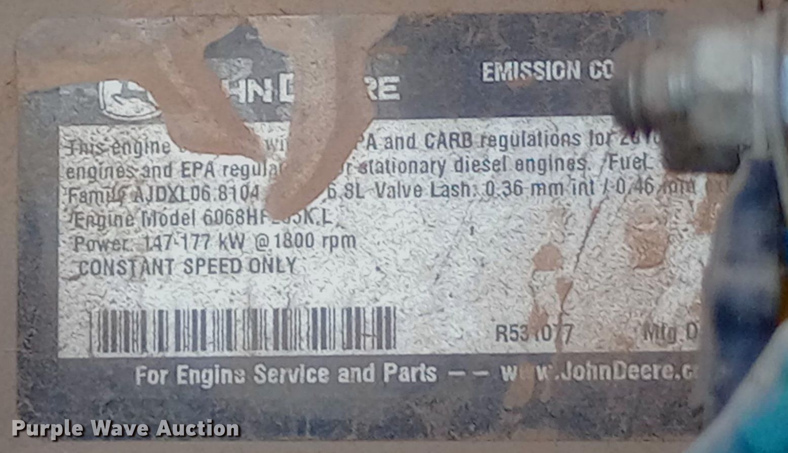Magnum Magna Plus 150 generator. Serial: MX-174958-0312. Engine John Deere, Displacement: 6.8L, Cylinders: 6, Fuel type: Diesel, Natural gas. Features Generator Magna Plus 363PSL1661, kVA: 156, kW: 125, Phase: Three, Electric start, Fuel tank. Trailer 18' L x 87" W, Ball hitch size: 2 5/16", Suspension: Spring, Brakes: Electric, Axles: Tandem, Tire size: 235/85R16. This is worksite support equipment and will not come with a title. Transfer of ownership documentation will be a bill of sale. Dutton Rent-All, Inc. - Open Inspection Wednesday, July 24. 305 Southeast 4th Street. Lindsay, OK 73052