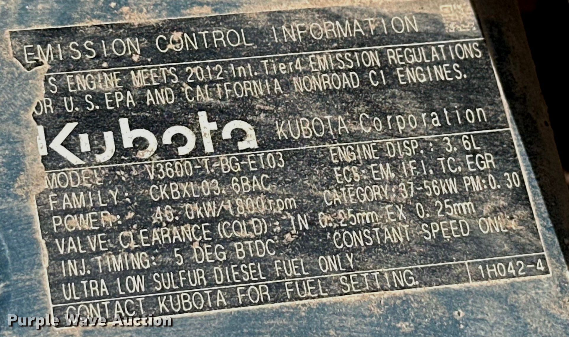 Magnum MMG45 generator. Hours: 6,291 on meter, Serial: 307835, Unit #: GT105. Engine Kubota V3600-T, Serial: CG3292, Displacement: 3.6L, Cylinders: 4, Fuel type: Diesel. Electric Motor MagnaPlus 284PSL1708-1 Serial: MT-0061610, kW: 38, Volts: 480, Phase: Three. Features Generator Magnum MMG45, kVA: 33, kW: 33, Phase: Three, Electric start, Fuel tank. Trailer 12' L x 55" W, Ball hitch size: 2 5/16", Suspension: Spring, Brakes: Hydraulic, Axles: Single, Tire size: ST225/75R15. Notes Dead battery. This is worksite support equipment and will not come with a title. Transfer of ownership documentation will be a bill of sale. Dutton Rent-All, Inc. - Open Inspection Wednesday, July 24. 305 Southeast 4th Street. Lindsay, OK 73052