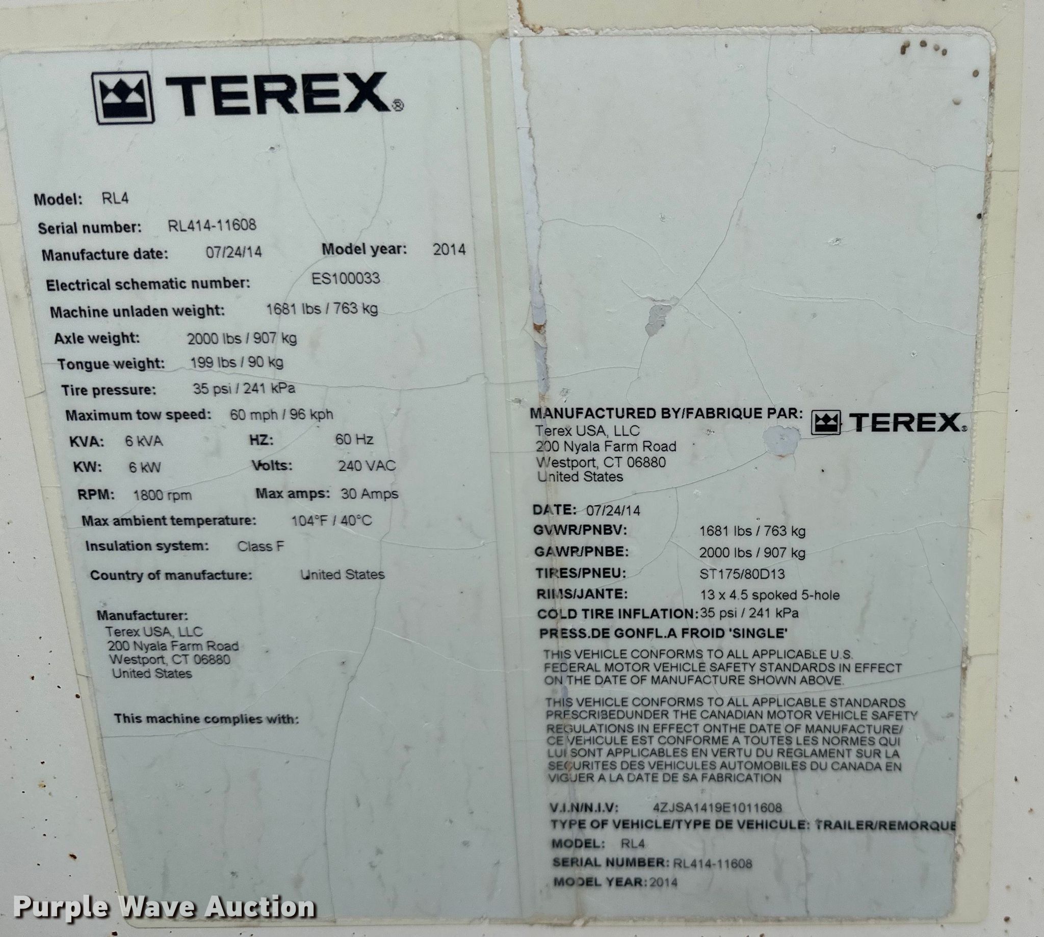 Purple Wave is selling a used Light Plant in Oklahoma. This item is a 2014 Terex RL4 light plant with the following: Hours: 1,672 on meter, VIN: 4ZJSA1419E1011608, Serial: RL414-11608, Unit #: 36