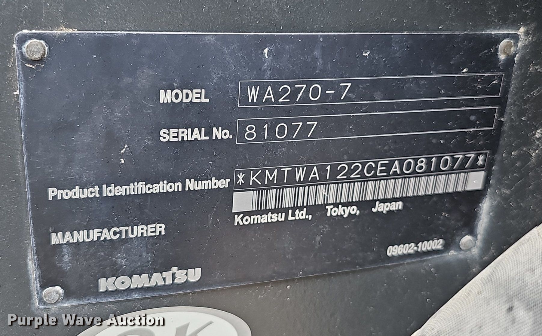 Purple Wave is selling a used Wheel Loader in Nebraska. This item is a 2016 Komatsu WA270-7 wheel loader with the following: Hours: 5,672 on meter, Serial: KMTWA122CEA081077