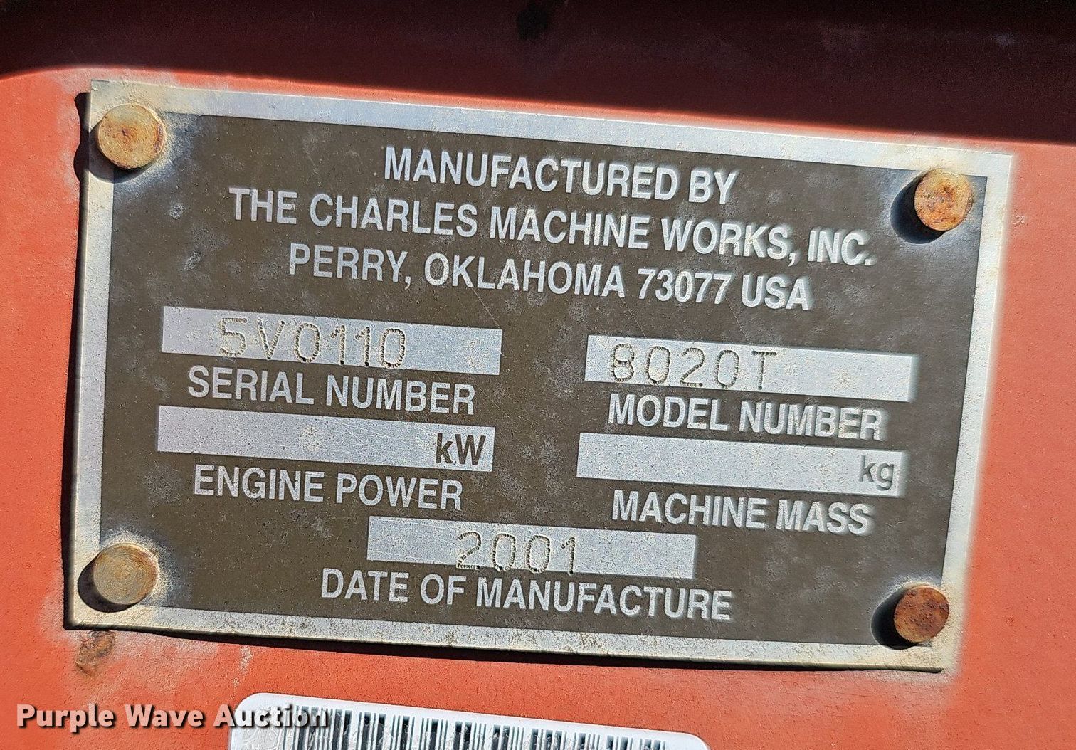 2001 DItch Witch 8020T cable plow. Hours: 733 on meter, Serial: 5V0110. Engine John Deere 4045TF150, Serial: PE4045T088749, Cylinders: 4, Fuel type: Diesel. Transmission Hydrostatic, Two speed travel, Four wheel drive. Operators station OROPS. Features Vibratory plow Model: H830, Serial: 2V1639, Depth: 45", Reel carrier Model: RLCR75, Serial: 6V0023, Maximum reel width: 42", Maximum reel diameter: 56". Tires Size: 38x18.00-20. Notes Front differential fluid leak, Hydraulic leaks, Rear tire flat. Valley Corp / TJ Cable. Lincoln, NE 68522