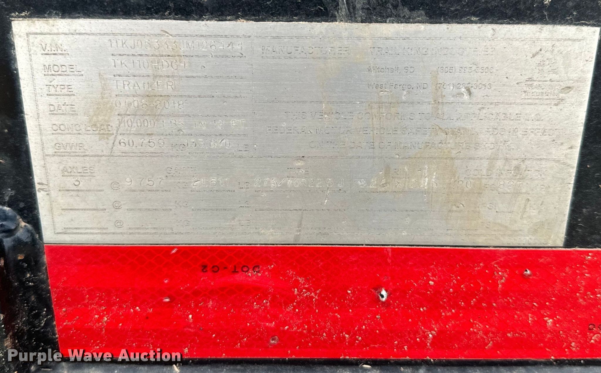 Purple Wave is selling a used Equip. Trailer in Kansas. This item is a 2018 Trail King lowboy equipment trailer with the following: VIN: 1TKJ05333JM126444