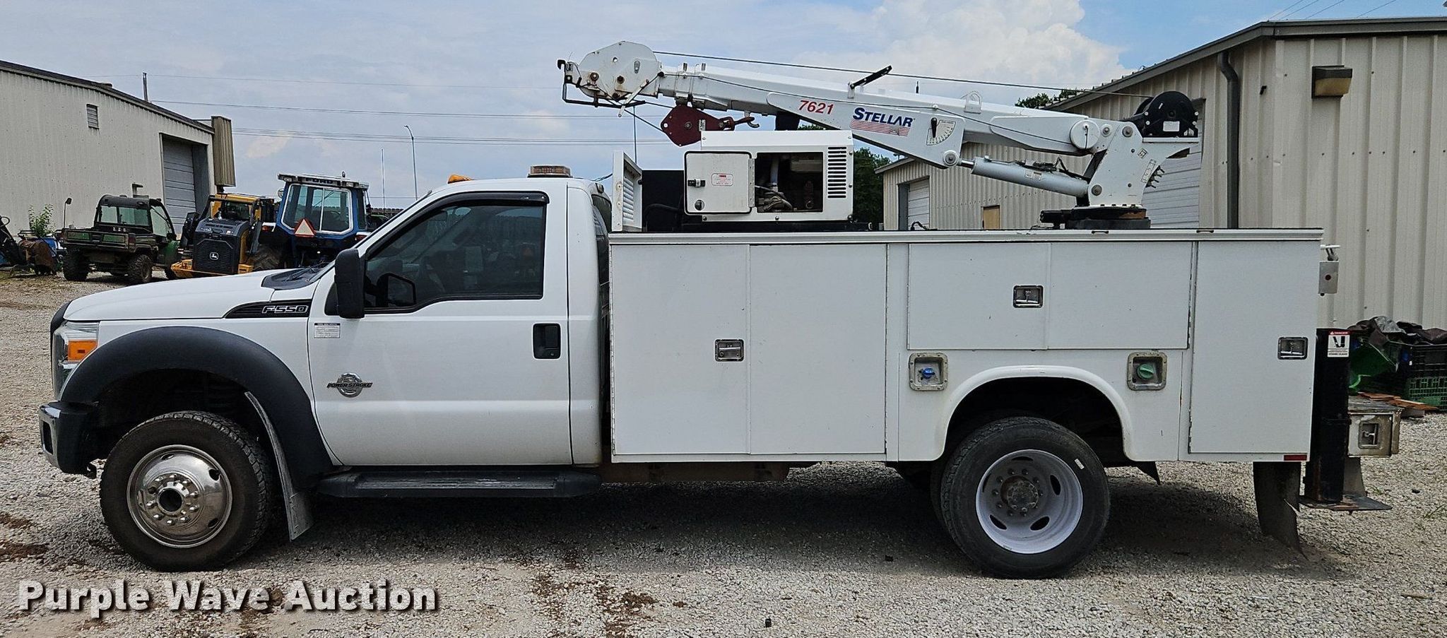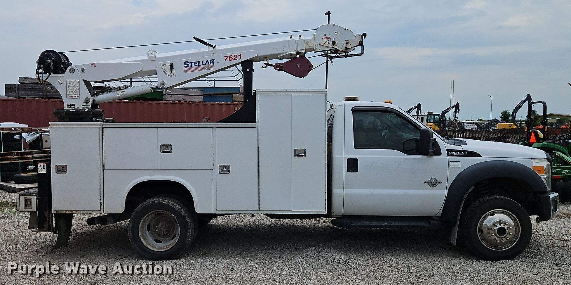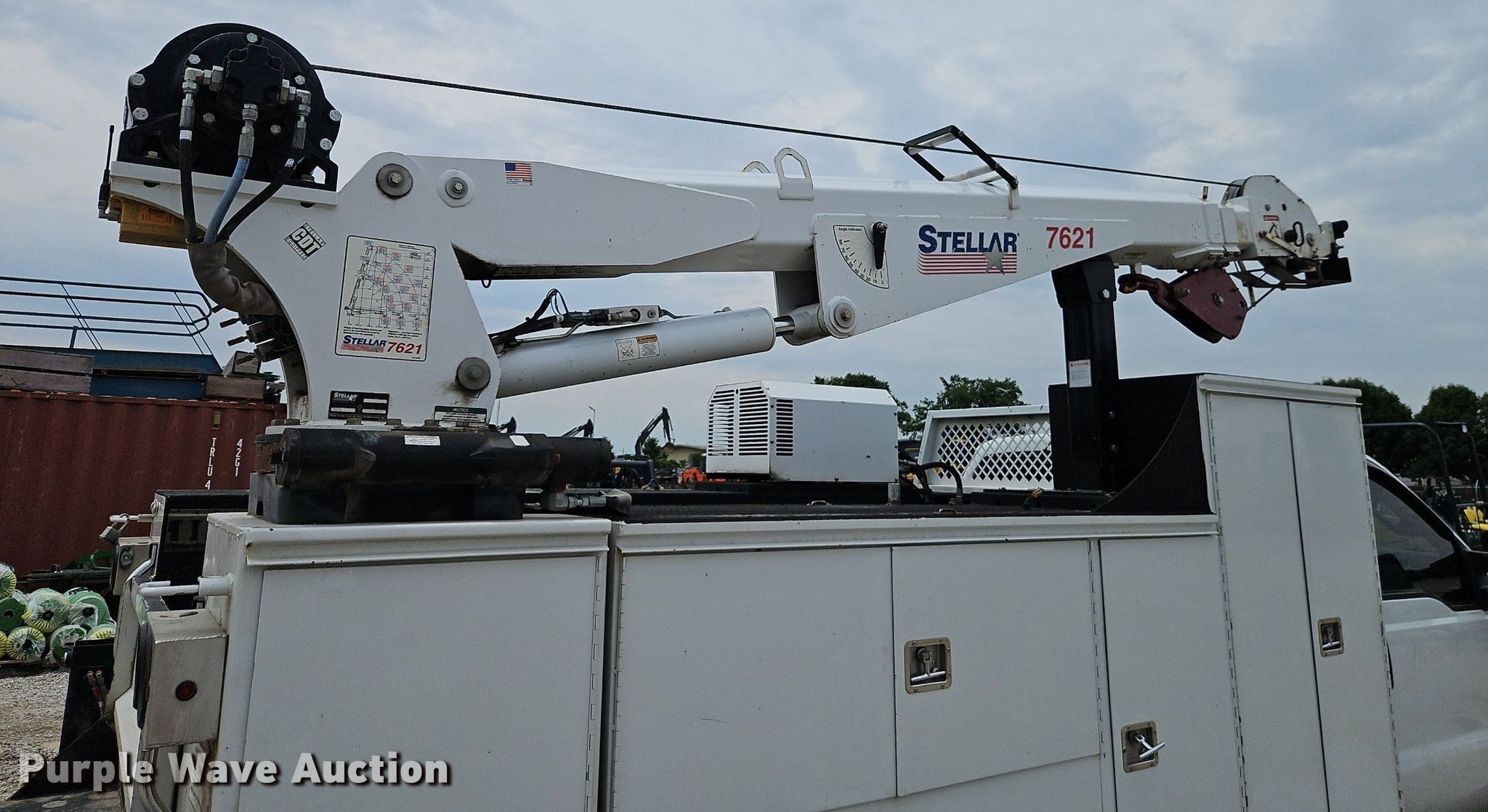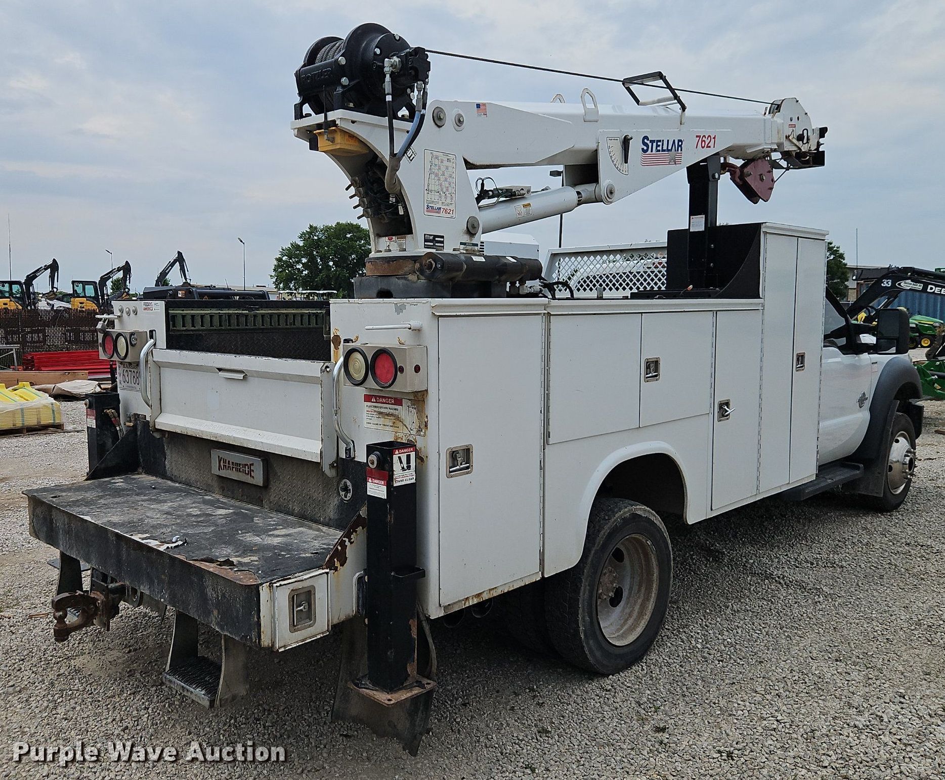 2012 Ford F550 XL Super Duty utility / service truck. Miles: 144,278 on odometer, VIN: 1FDUF5HT0CEC46660. Engine Displacement: 6.7L, Cylinders: 8, Fuel type: Diesel. Transmission Automatic. Chassis Four wheel drive, Axles: Single, Suspension: Spring, Brakes: Hydraulic, PTO, Wet kit, GVWR: 19,500 lbs. Interior AC, Heat, Power windows, Power locks, Cruise control, Auxiliary controls. Features Bed Knapheide 6132DLR-44KJ, 13'L x 96" W, Torch bottle rack, Air compressor Boss, Crane Stellar 7621, Maximum boom length: 21' Maximum lift capacity: 7,500 lbs.. Tires Size: 225/70R19.5. Notes Dash warning indicator: Check engine. Kansas title. Heritage Tractor. Olathe, KS 66062