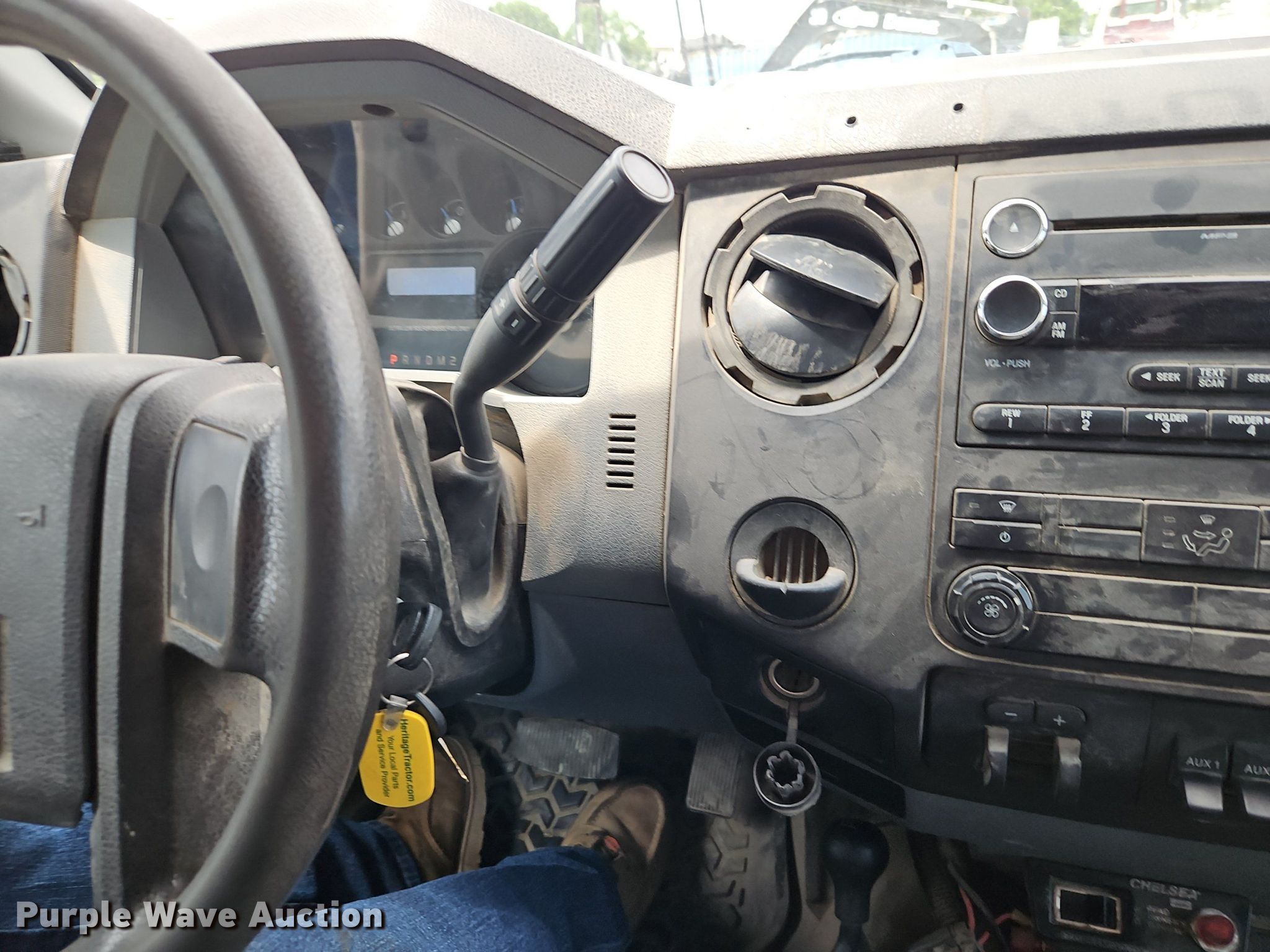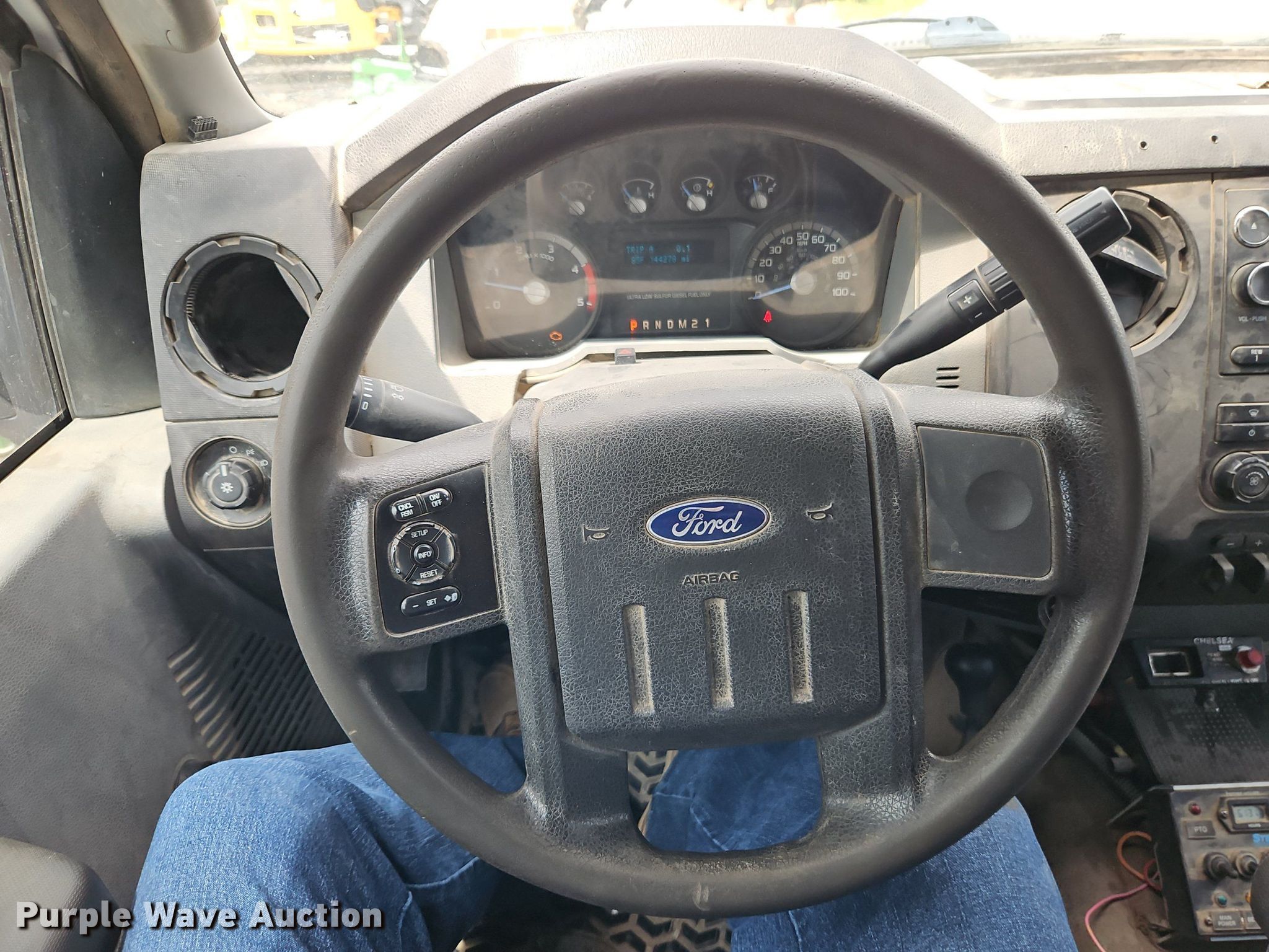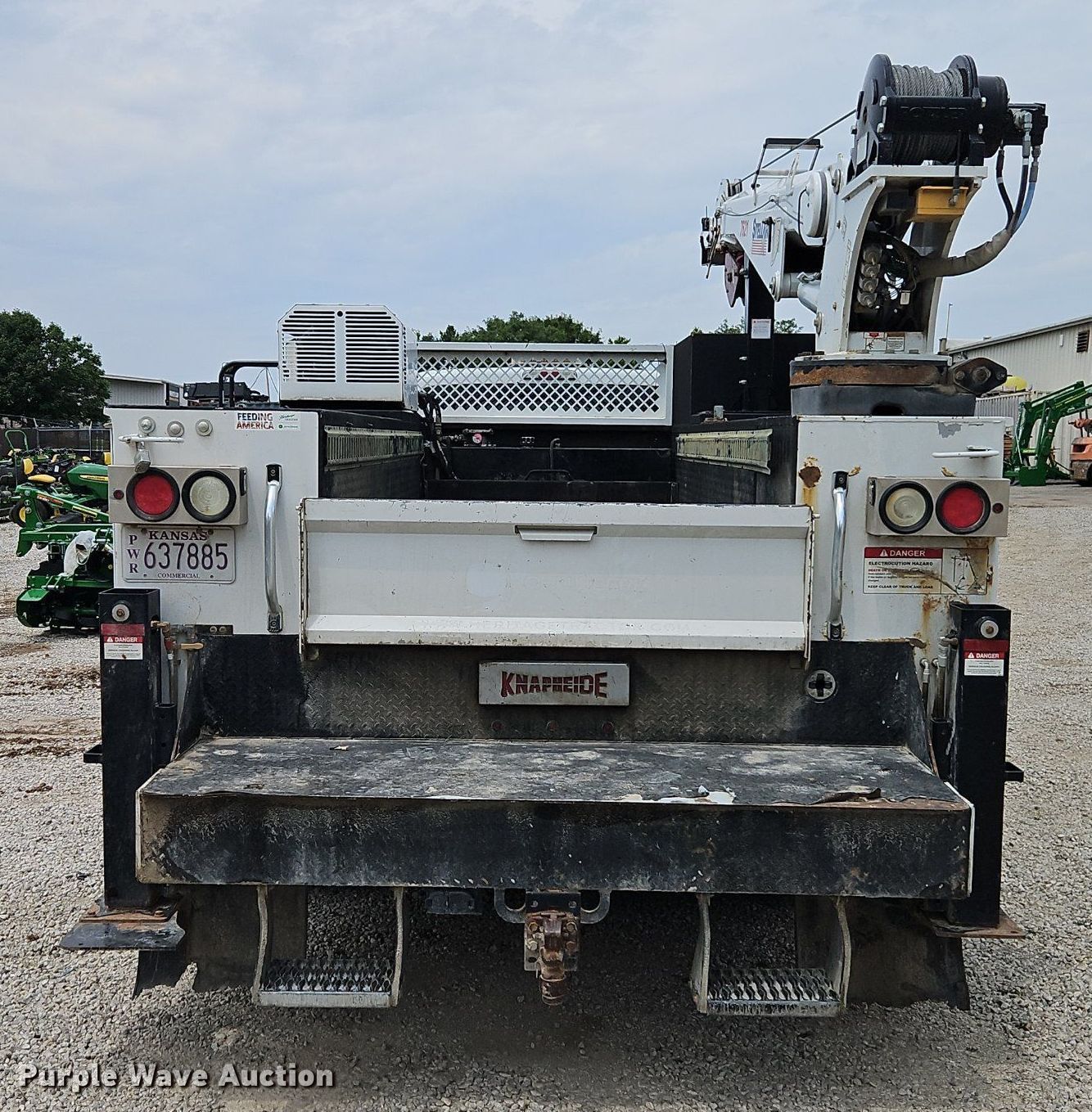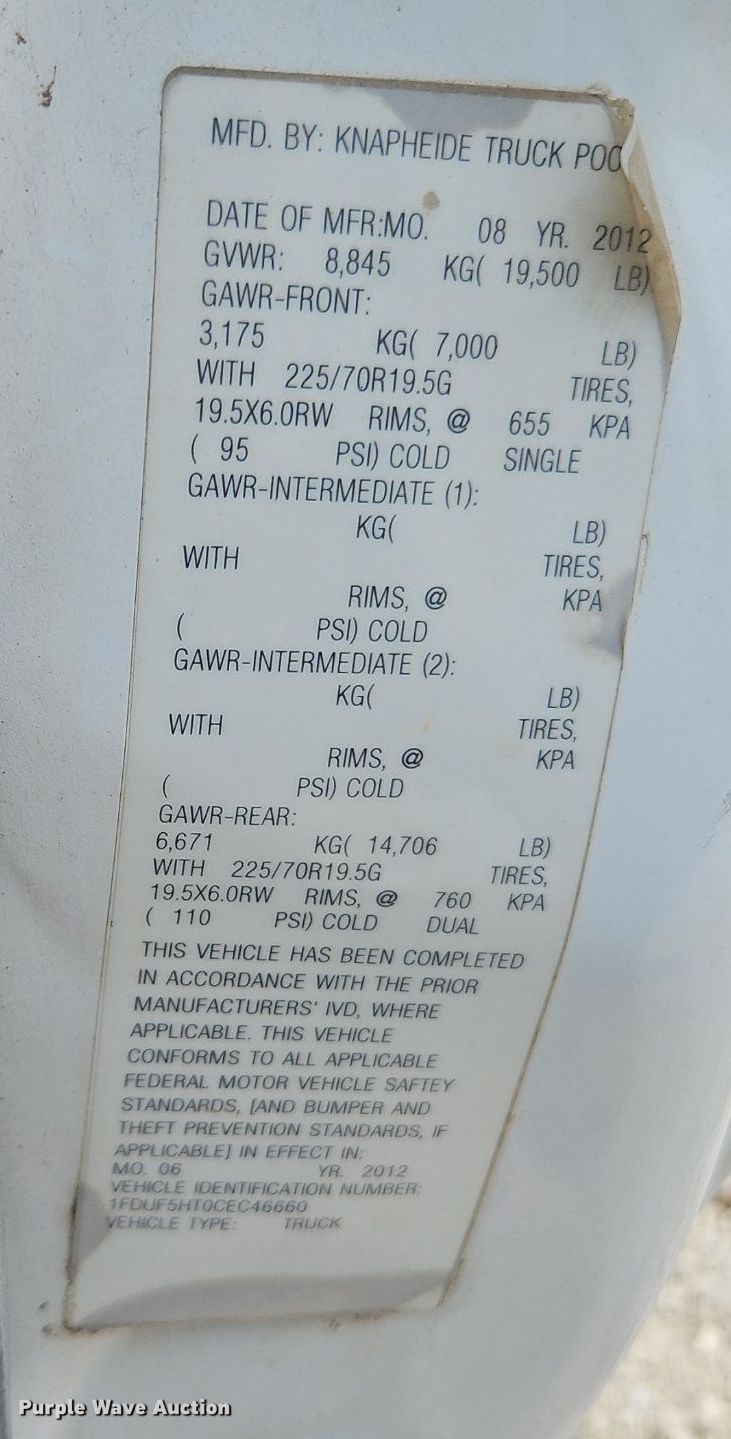 2012 Ford F550 XL Super Duty utility / service truck. Miles: 144,278 on odometer, VIN: 1FDUF5HT0CEC46660. Engine Displacement: 6.7L, Cylinders: 8, Fuel type: Diesel. Transmission Automatic. Chassis Four wheel drive, Axles: Single, Suspension: Spring, Brakes: Hydraulic, PTO, Wet kit, GVWR: 19,500 lbs. Interior AC, Heat, Power windows, Power locks, Cruise control, Auxiliary controls. Features Bed Knapheide 6132DLR-44KJ, 13'L x 96" W, Torch bottle rack, Air compressor Boss, Crane Stellar 7621, Maximum boom length: 21' Maximum lift capacity: 7,500 lbs.. Tires Size: 225/70R19.5. Notes Dash warning indicator: Check engine. Kansas title. Heritage Tractor. Olathe, KS 66062