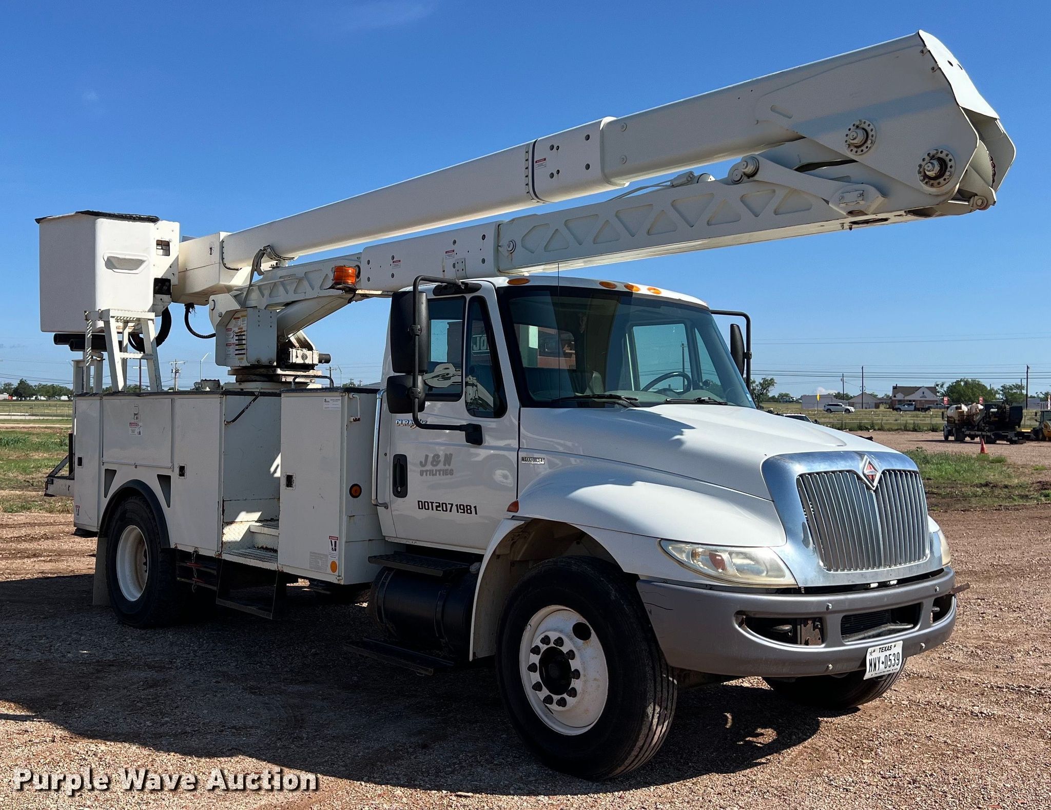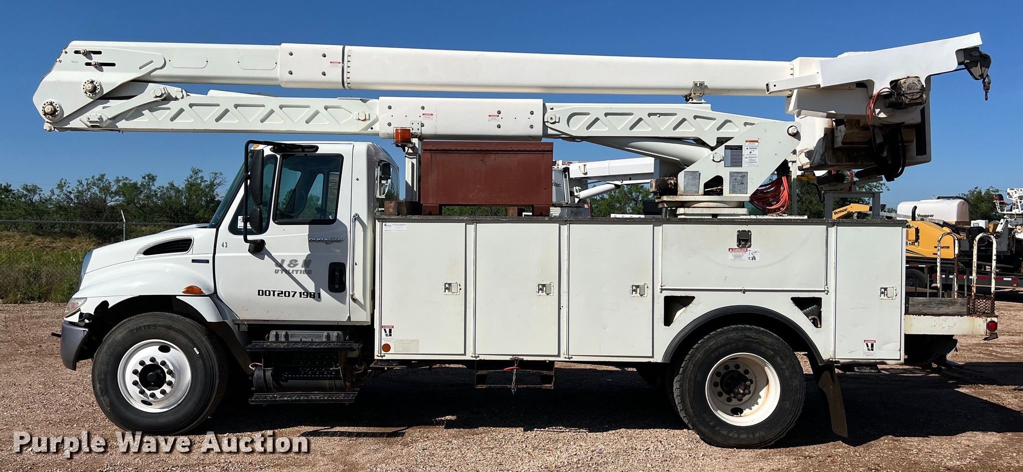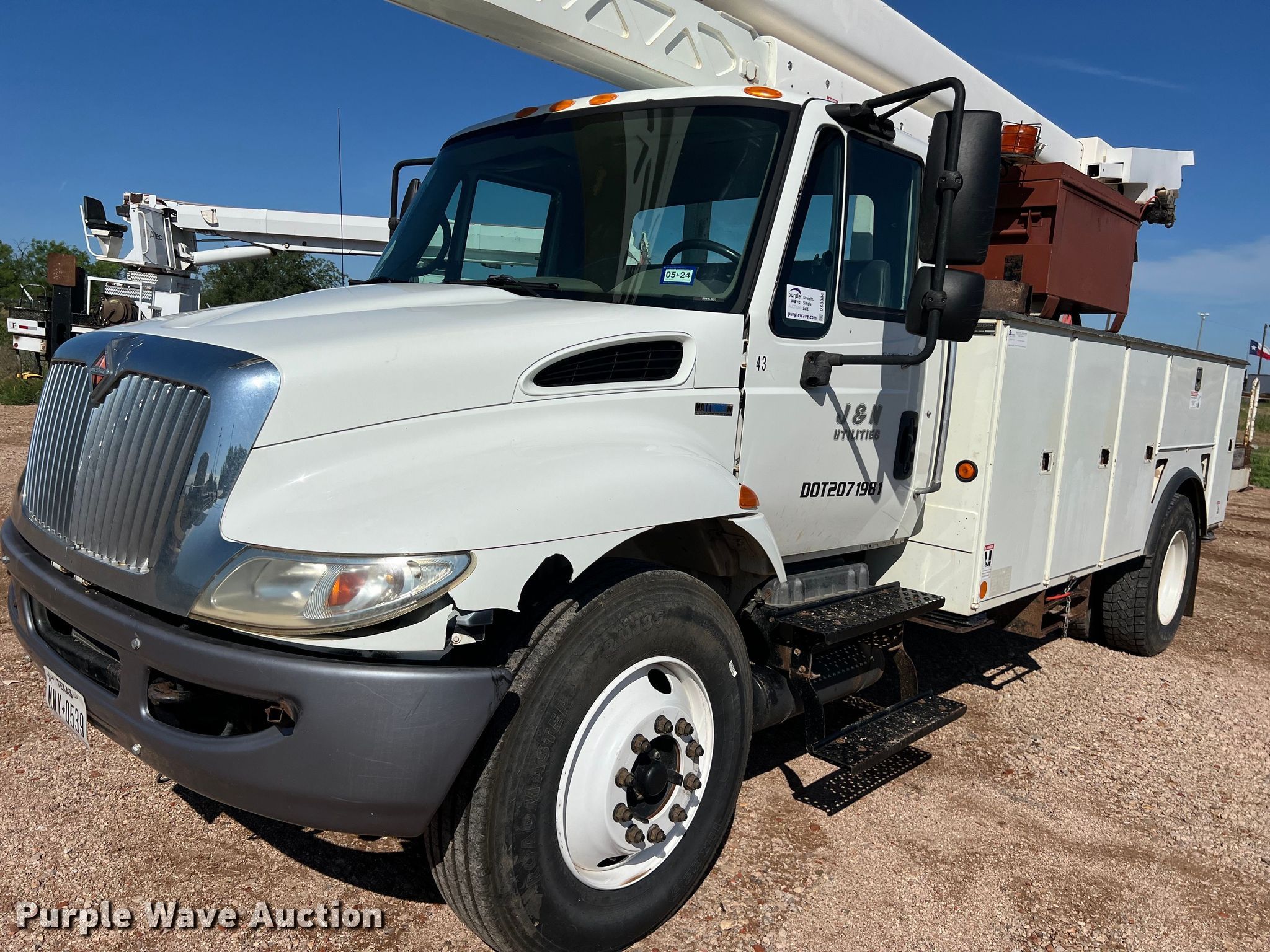 Purple Wave is selling a used Bucket Truck in Texas. This item is a 2010 International DuraStar 4300 bucket truck with the following: Miles: 74,474 on odometer, Hours: 9,184 on meter, VIN: 1HTMMAAN8AH191548, Unit #: 43