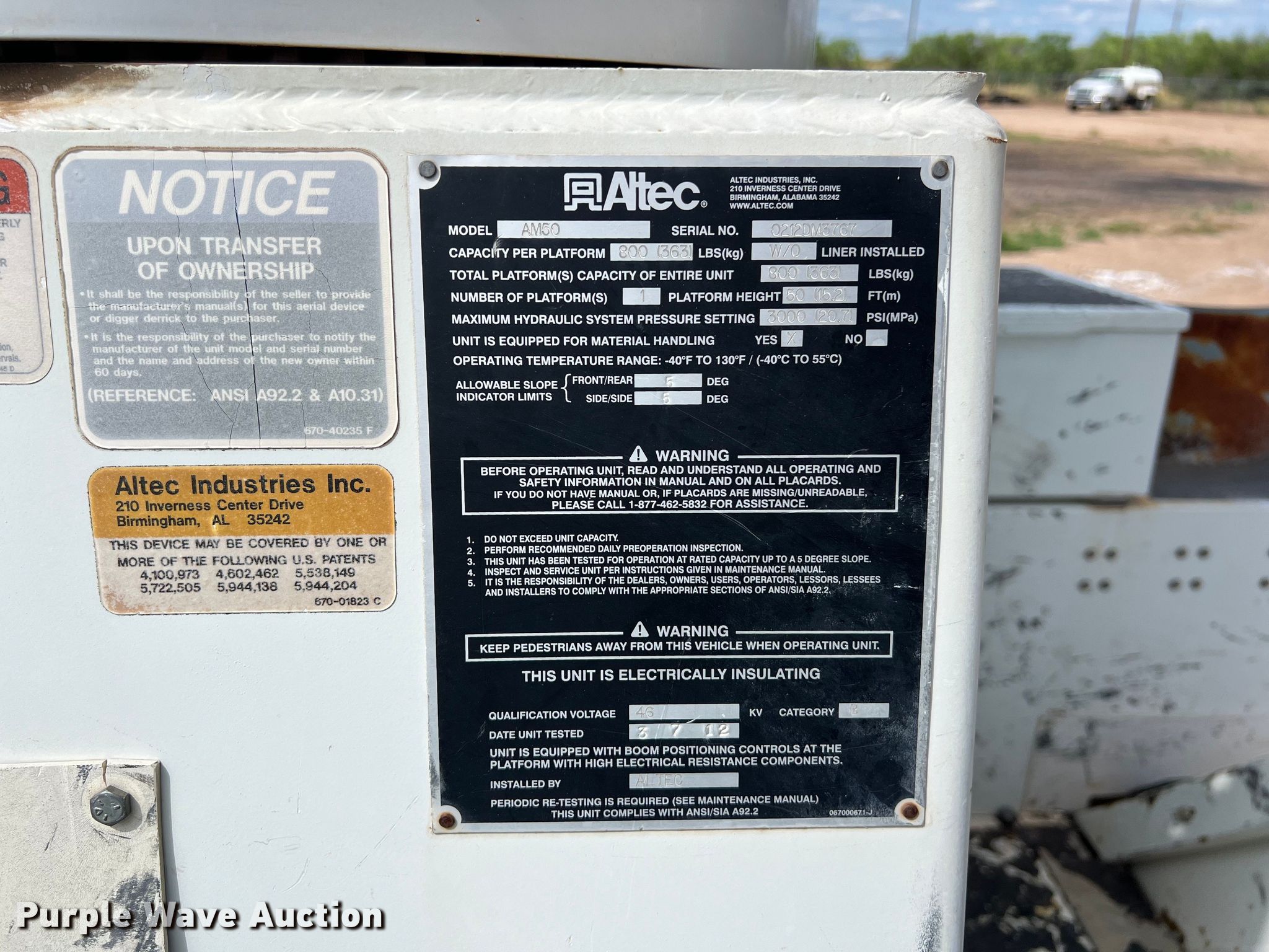 2012 International WorkStar 7400 bucket truck. Miles: 224,297 on odometer, Hours: 10,849 on meter, VIN: 1HTWGAZR5CJ599637, Unit #: 26. Engine Displacement: 9.3L, Cylinders: 6, Fuel type: Diesel. Transmission Allison, Automatic. Chassis Axles: Tandem, Suspension: Spring over walking beam, Brakes: Air, PTO, Wet Kit, GVWR: 54,000 lbs. Interior AC, Heat, Cruise control, Auxiliary controls, Brake controller. Features Bed Altec, 18' L x 7' 8" W, Boom Altec AM50, Serial: 0212DM3767, Mast height: 50', Maximum lift capacity: 800 lbs, Boom type: Articulating, Insulated, Man basket, Boom controls Ground, Platform/ basket.. Tires Size: 11R22.5. Notes Boom to be repaired prior to auction. Texas title. J&N Utilities. 6849 East Highway 80. Abilene, TX 79601