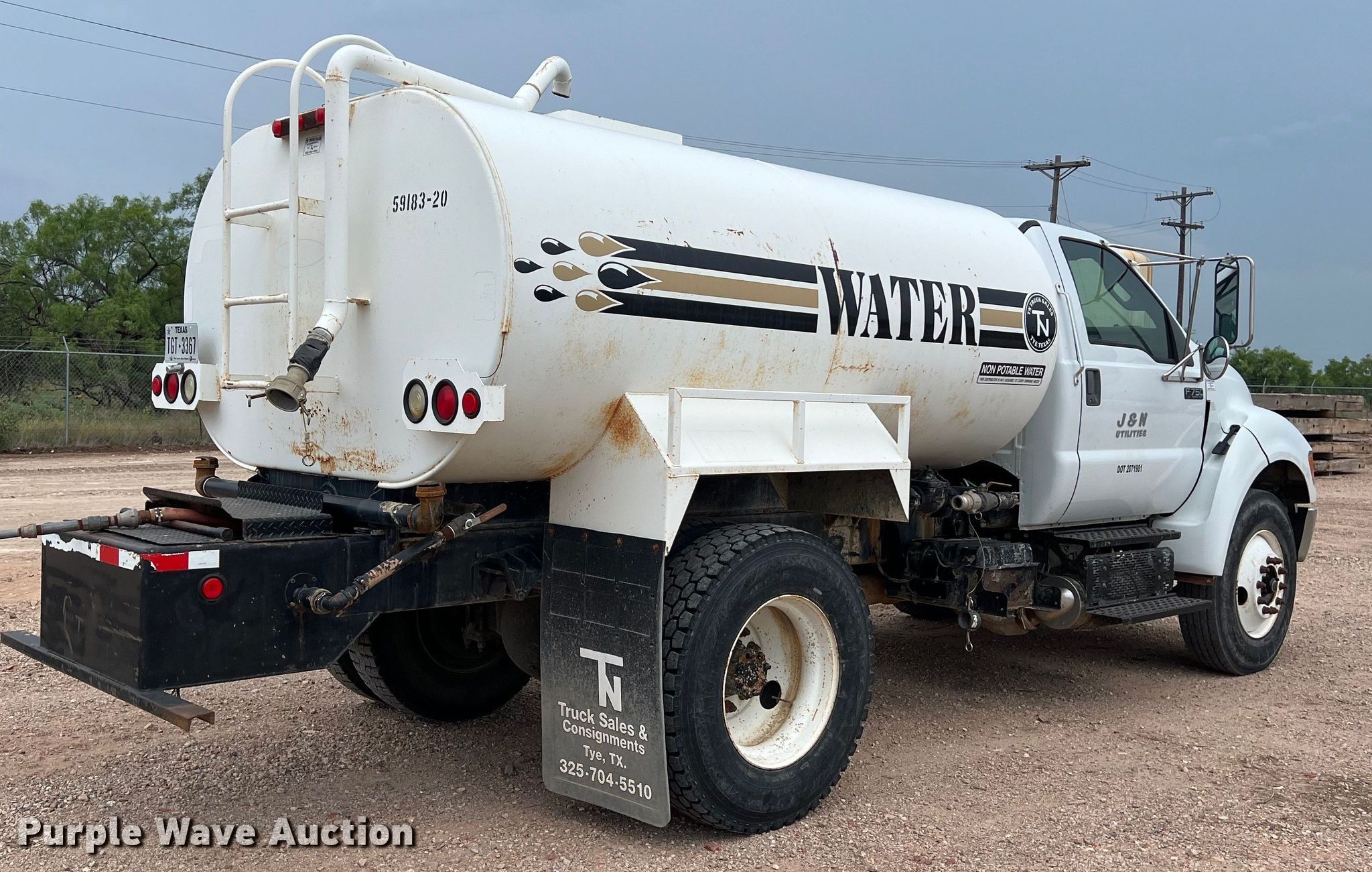 2012 Ford F750 water truck. Miles: 21,494 on odometer, VIN: 3FRXF7FA7CV199505, Unit #: 47. Engine Cummins, Displacement: 6.7L, Cylinders: 6, Fuel type: Diesel. Transmission Automatic. Chassis Axles: Single, Suspension: Spring, Brakes: Air, PTO, GVWR: 33,000 lbs, Wheelbase: 158". Interior AC, Heat, Cruise control, Auxiliary controls. Features Bed / tank, Capacity: 2,000 gallons Spray bar: Front, Rear, Side discharge, Hose reel, Top fill. Tires Size: 11R22.5. Texas title. J&N Utilities. 6849 East Highway 80. Abilene, TX 79601
