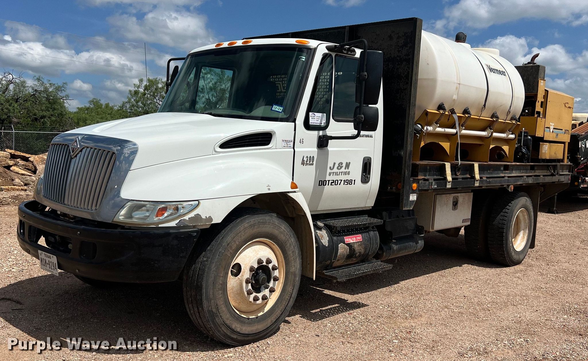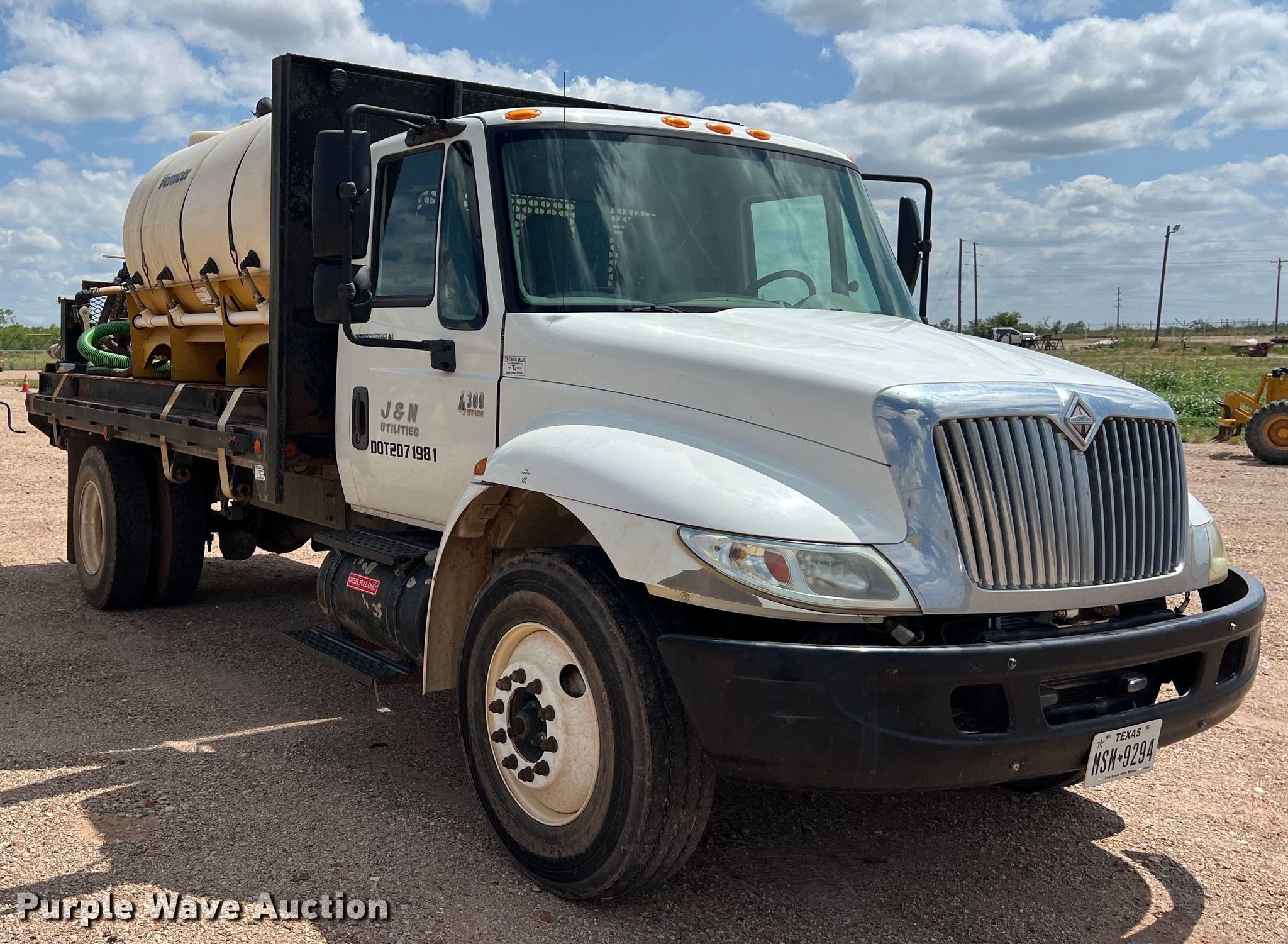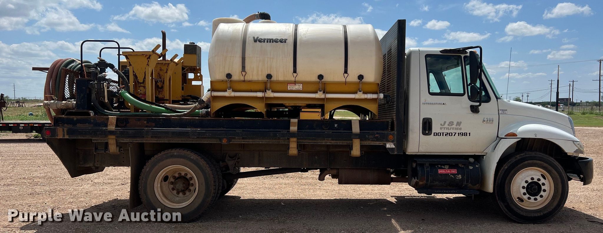2007 International 4300 flatbed truck. Miles: 127,781 on odometer, Hours: 6,325 on meter, VIN: 1HTMMAAL67H519542, Unit #: 46. Engine International DT466, Displacement: 7.6L, Cylinders: 6, Fuel type: Diesel. Transmission Automatic. Chassis Axles: Single, Suspension: Spring, Brakes: Air, GVWR: 25,999 lbs. Interior AC, Heat, Heated mirrors, Cruise control, Brake controller. Features Flatbed 16' L x 8' 2" W, Vermeer DT750 fluid mixer Hours: 2,985 on meter, Serial: 1VRT160D7Y1000972, Kubota V1505 diesel engine, (2) tanks Capacity: 750 gallons, Pump. Tires Size: 11R22.5. Notes Windshield chipped or cracked. Texas title. J&N Utilities. 6849 East Highway 80. Abilene, TX 79601