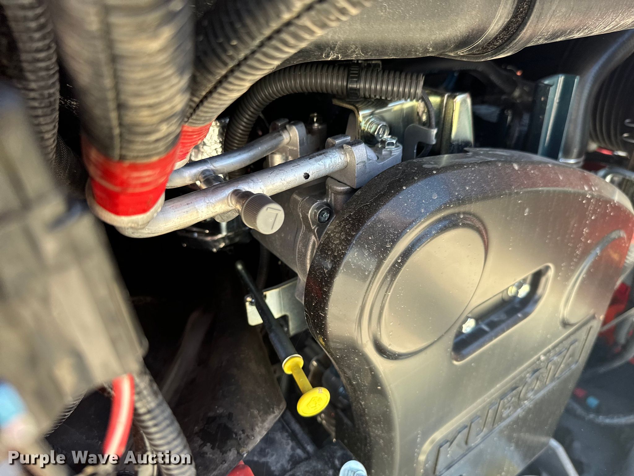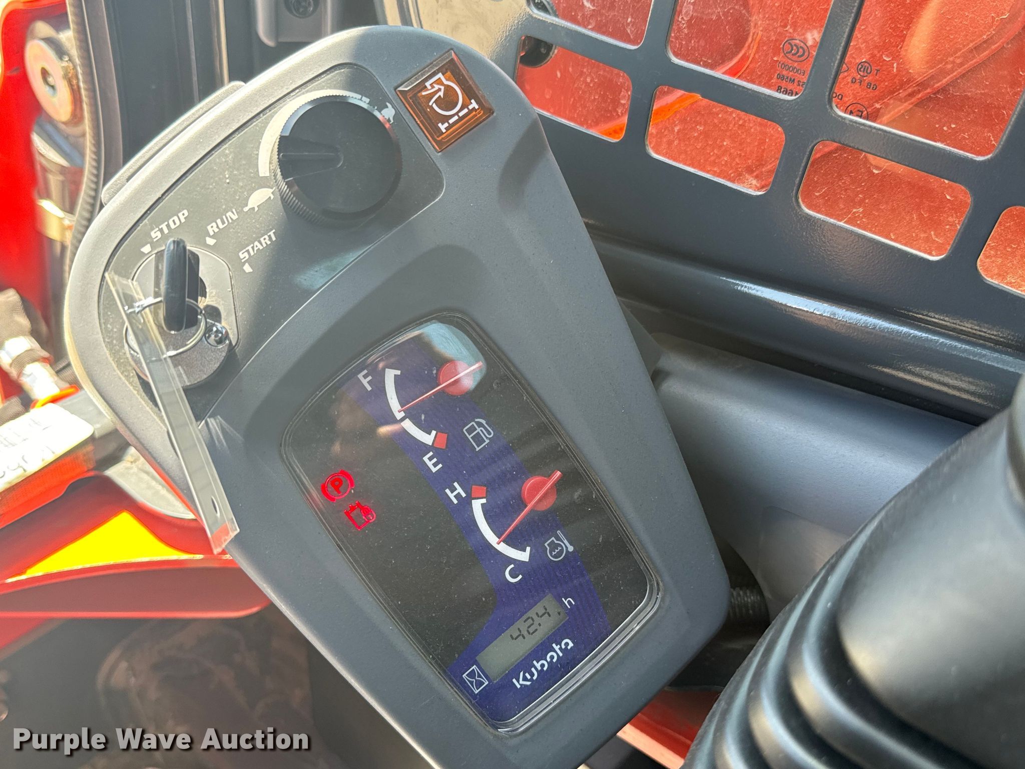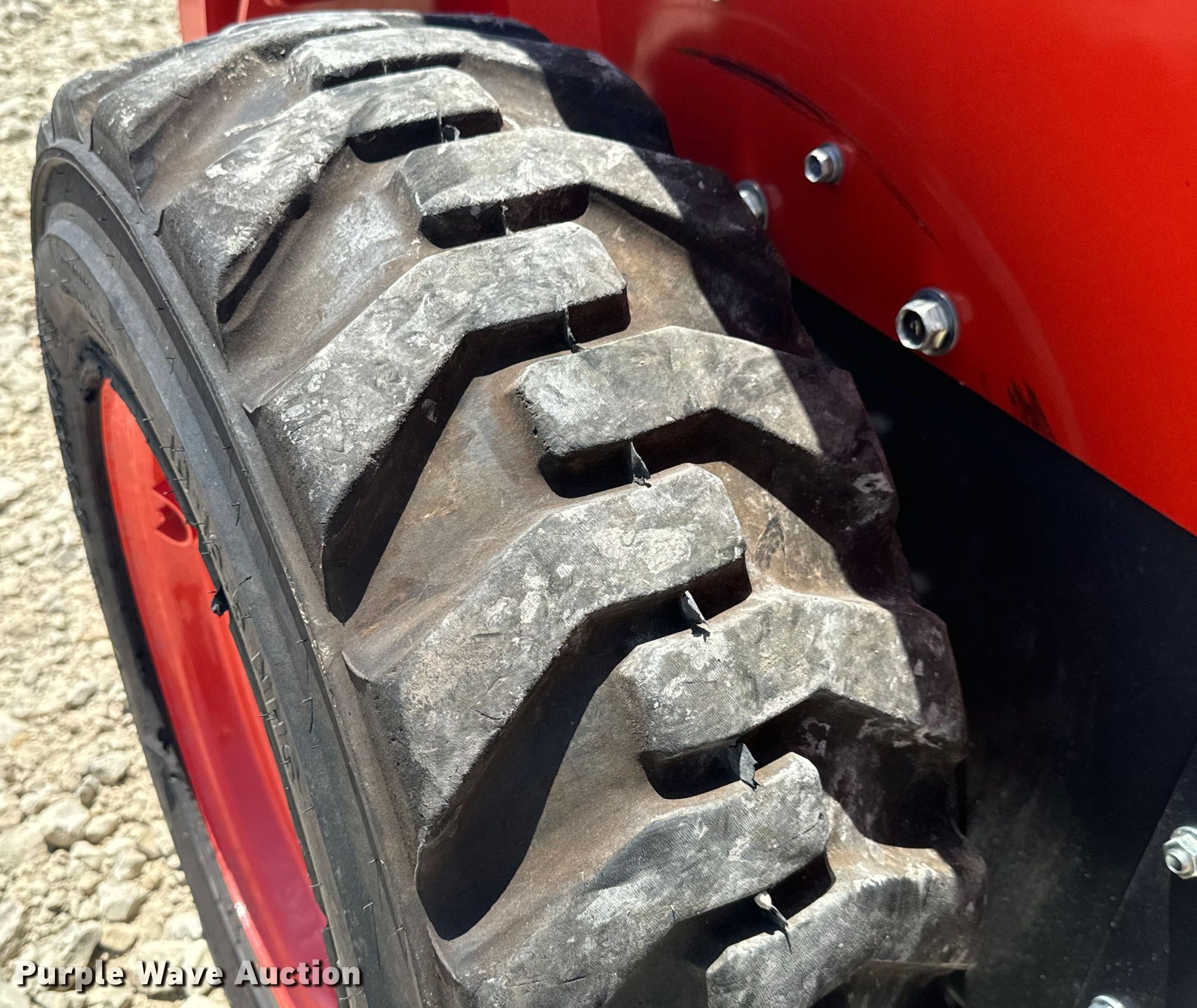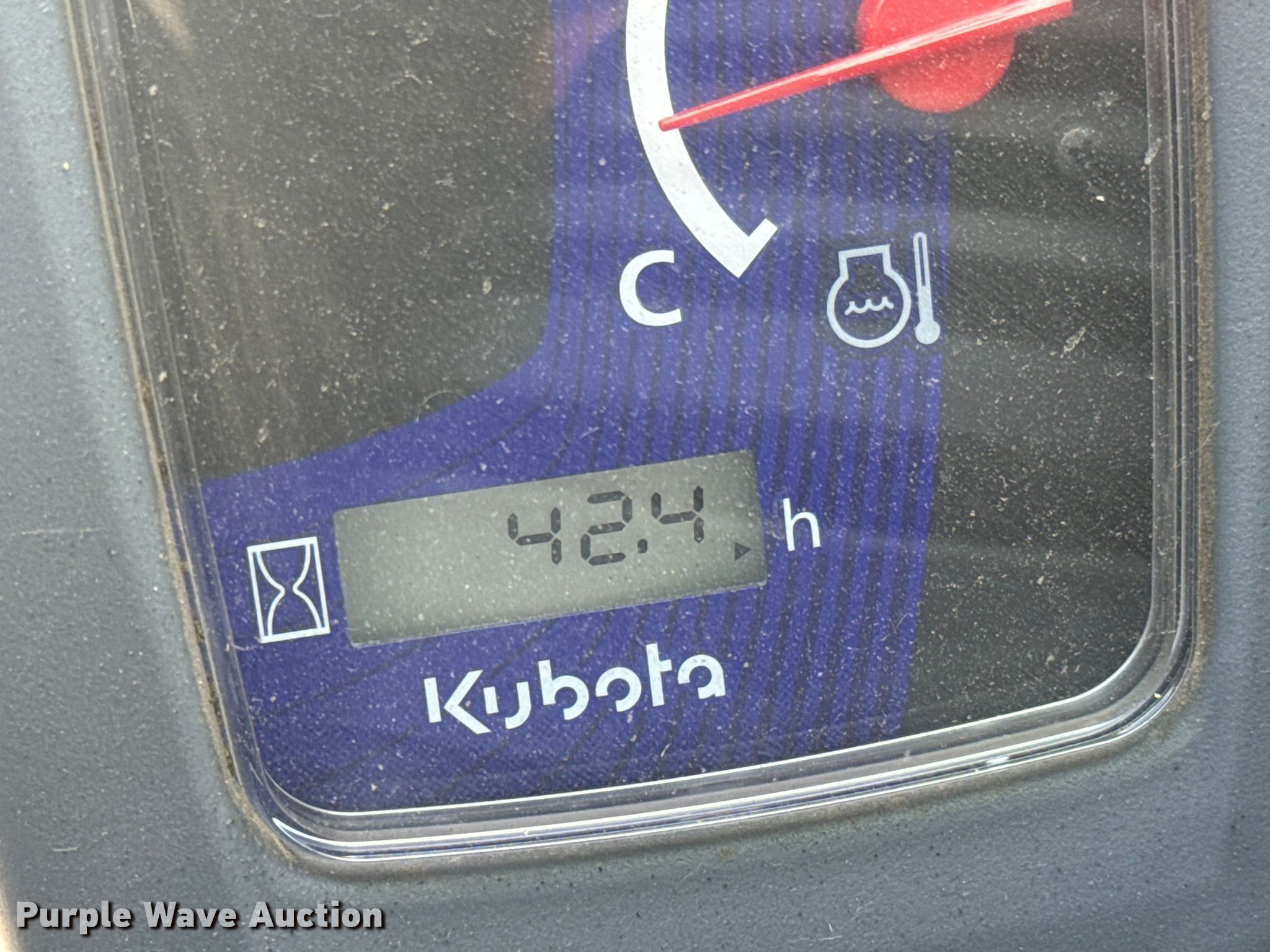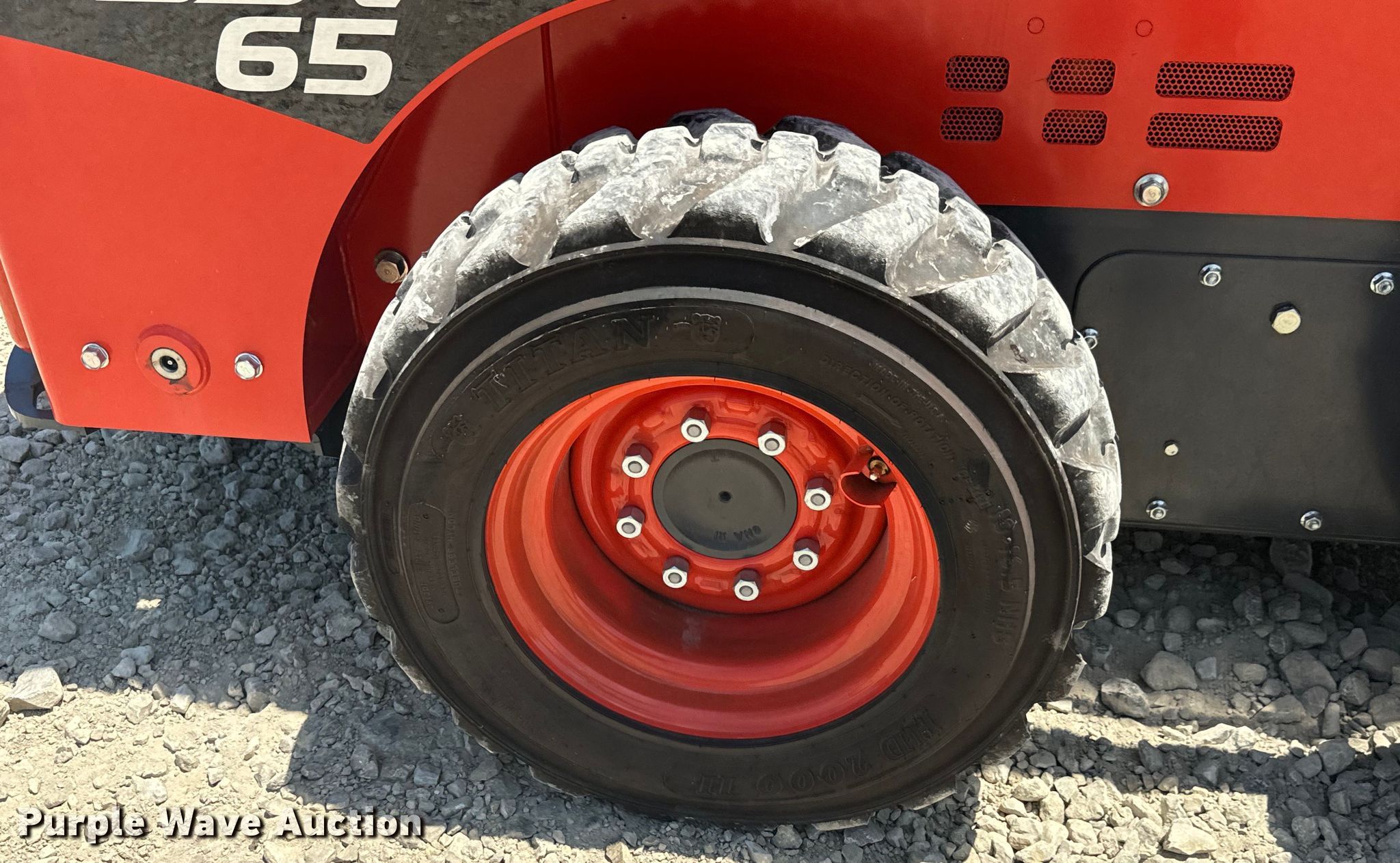 2022 Kubota SSV65 skid steer loader. Hours: 43 on meter, Serial: KBCZ131CTN3B55869. Engine Kubota V2607-CR-T-EF08, Serial: 8NC0242, Displacement: 2.6L, Cylinders: 4, Fuel type: Diesel. Transmission Hydrostatic, Two speed travel. Operators station Enclosed cab, AC, Heat, Bucket control: Hand. Features Auxiliary hydraulics, Auxiliary electrical outlet, Quick coupler: Hydraulic. Tires Size: 10-16.5. Notes No manufacture's warranty. Kubota Tractor Corp. Salina, KS 67401
