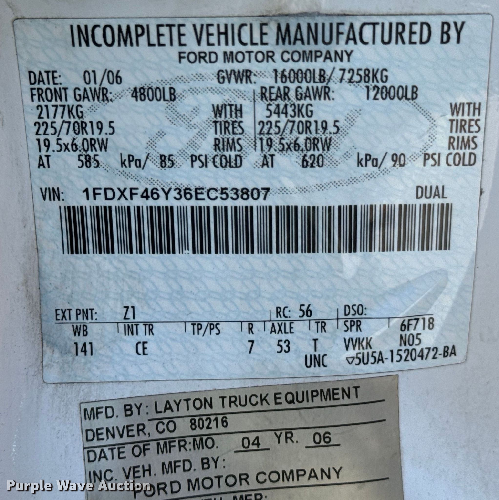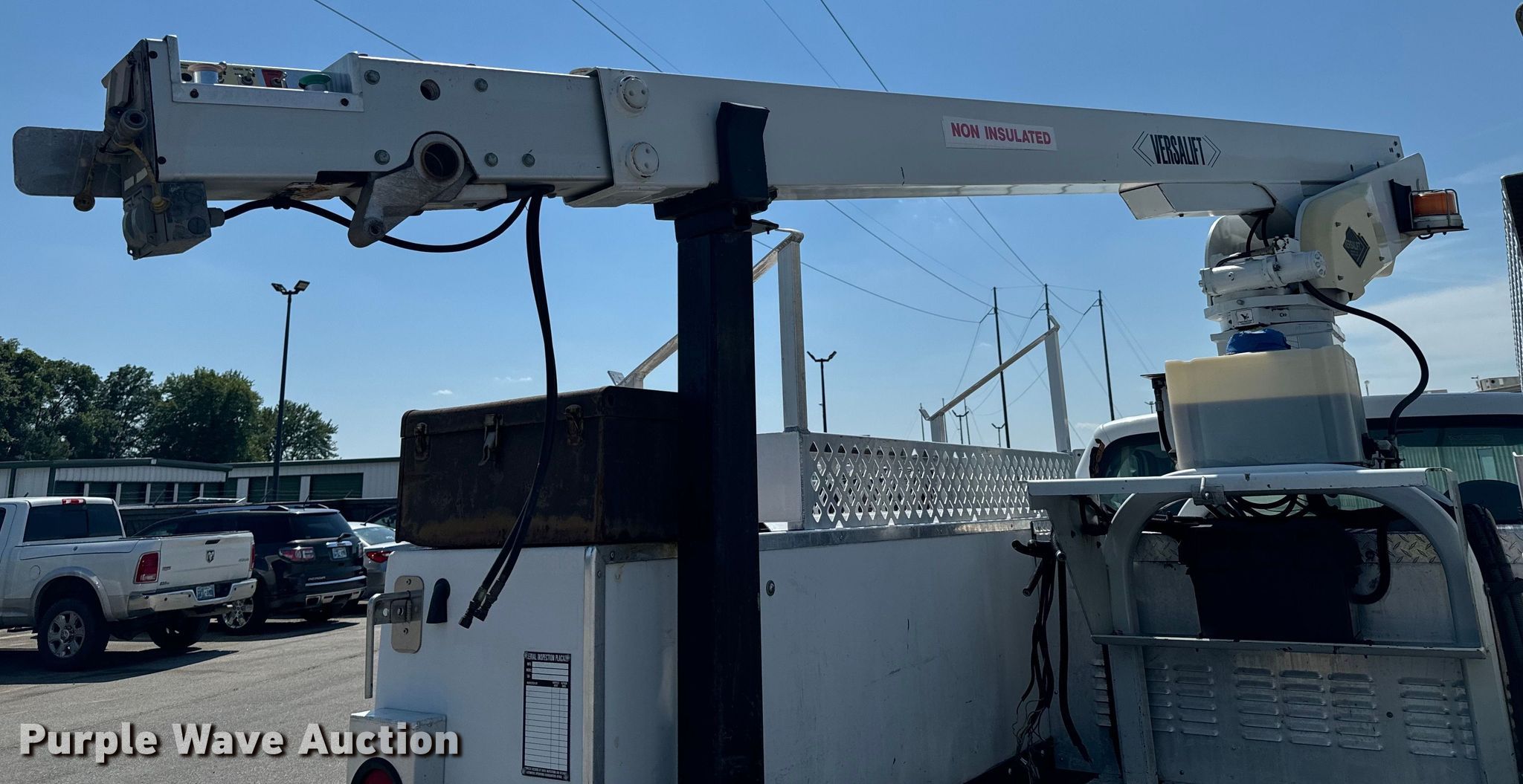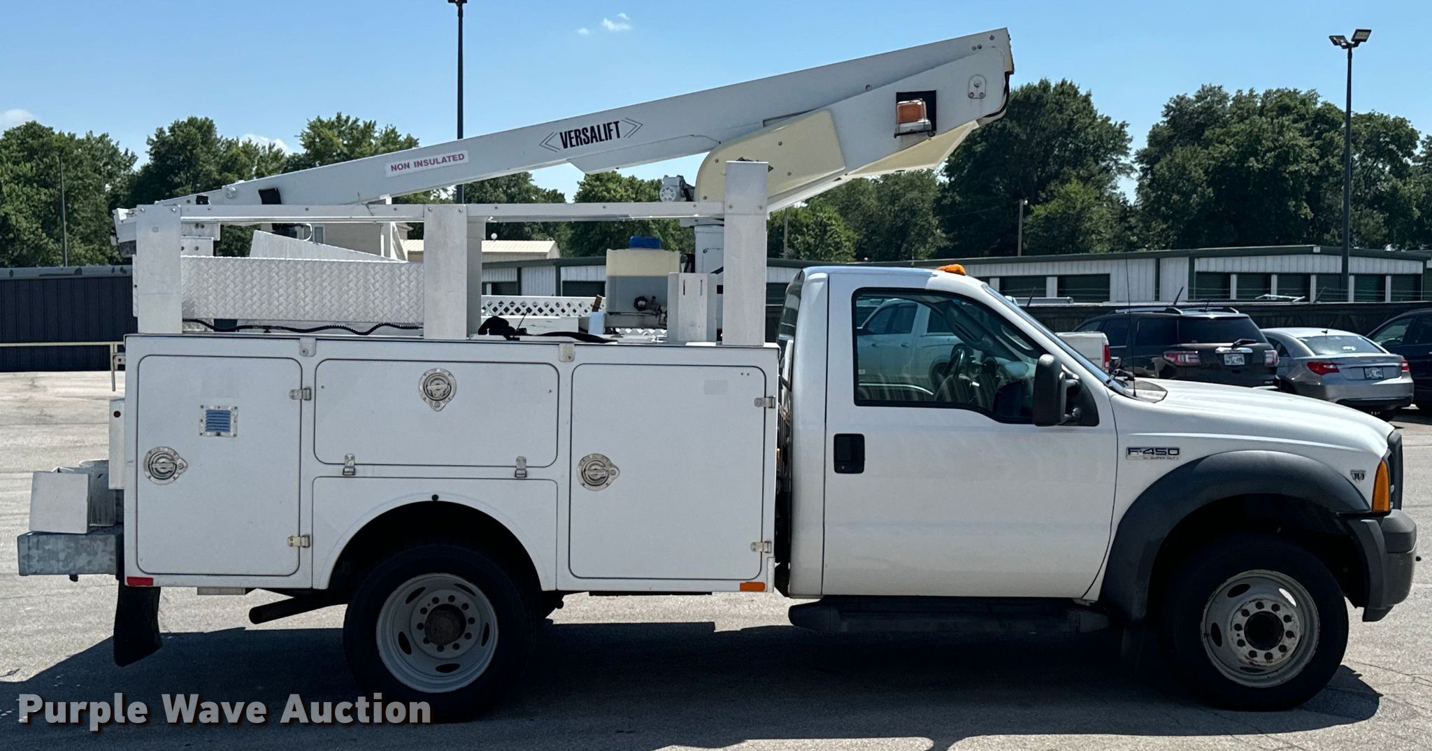 2006 Ford F450 Super Duty XL bucket truck. Miles: 107,478 on odometer, VIN: 1FDXF46Y36EC53807. Engine Ford, Displacement: 6.8L V10 SOHC, Cylinders: 10, Fuel type: Gas. Transmission Automatic. Chassis Axles: Single, Suspension: Spring, Brakes: Hydraulic, PTO, Wet kit, GVWR: 16,000 lbs. Interior AC, Heat, Auxiliary controls. Features Bed 10' 6" L x 94" W, Boom Versalift TEL29-N, Serial: AG060093, Boom type: Insulated, Telescopic, Boom controls Platform/ basket.. Tires Size: 225/70R19.5. Notes Bucket missing, Non-operational boom lift. Oklahoma title. Collinsville, OK 74021