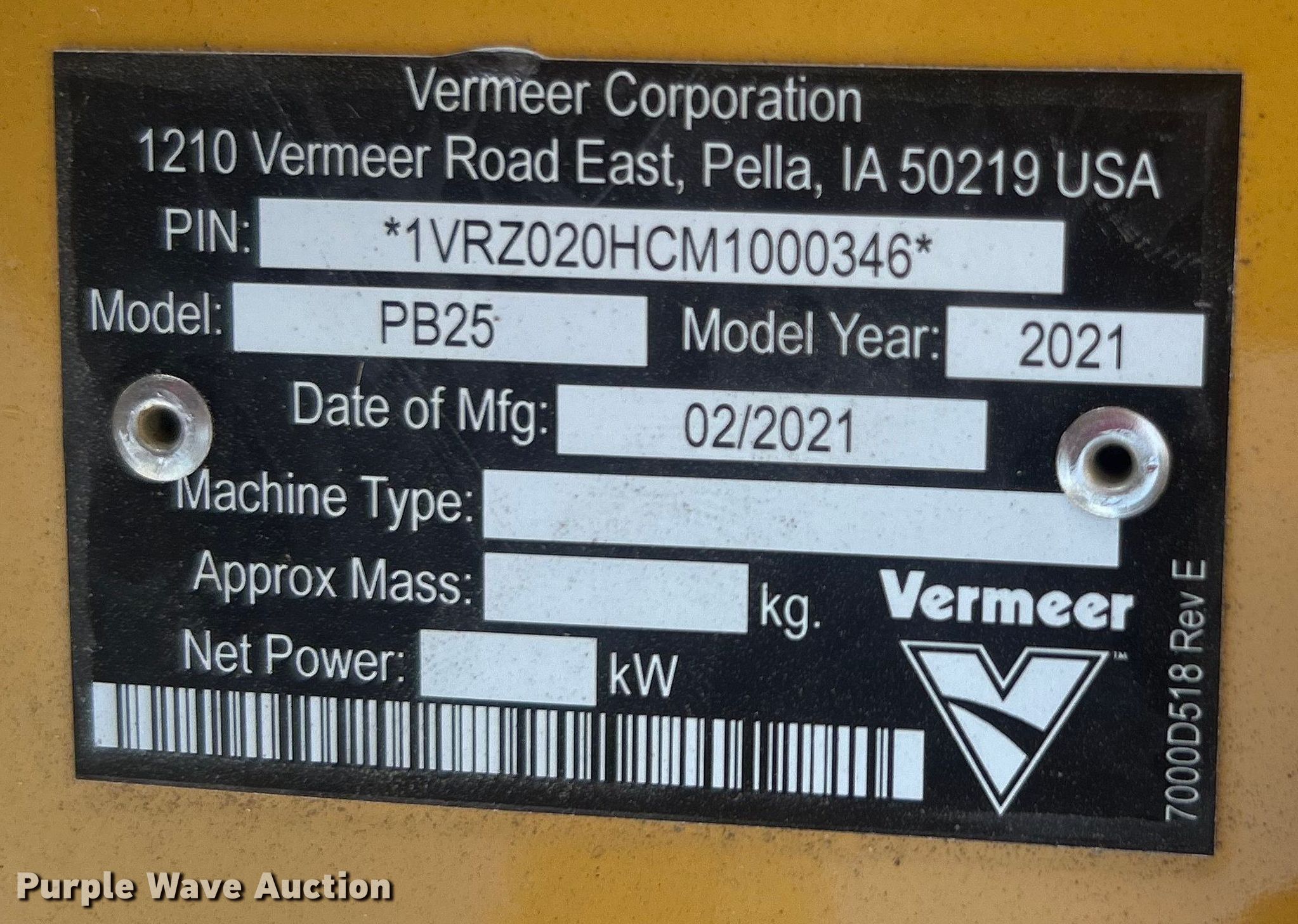 2021 Vermeer SPX25 cable plow. Hours: 139 on meter. Engine Cylinders: 2, Fuel type: Gas. Transmission Hydrostatic. Features Vibratory plow Model: PB25, Serial: 1VRZ020HCM1000346, Depth: 12", Remote control. Tracks Width: 7", Rubber. 15107 North 137th East Avenue. Collinsville, OK 74021