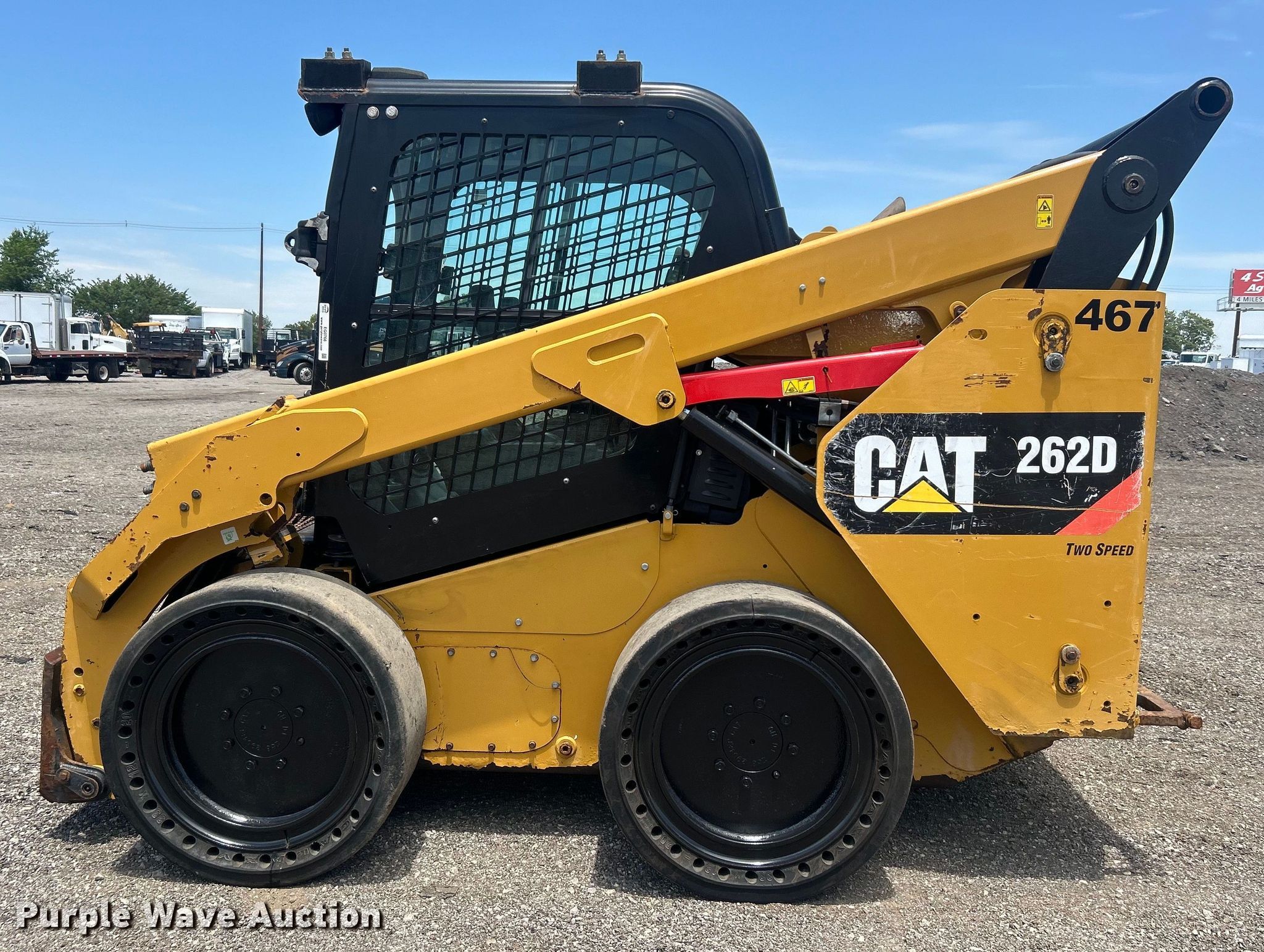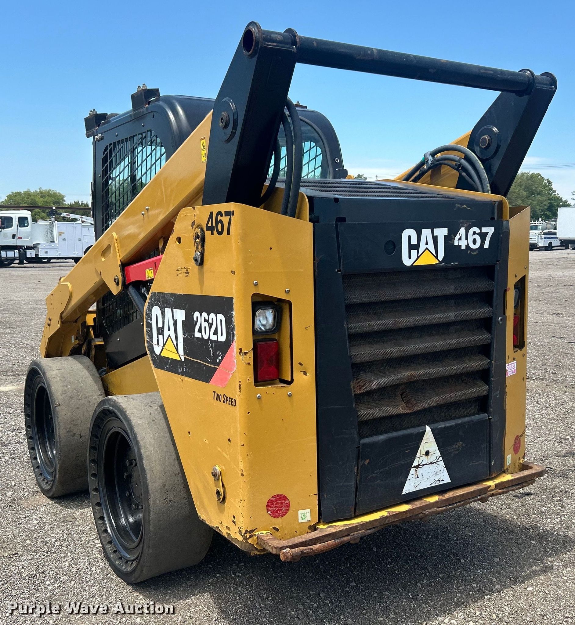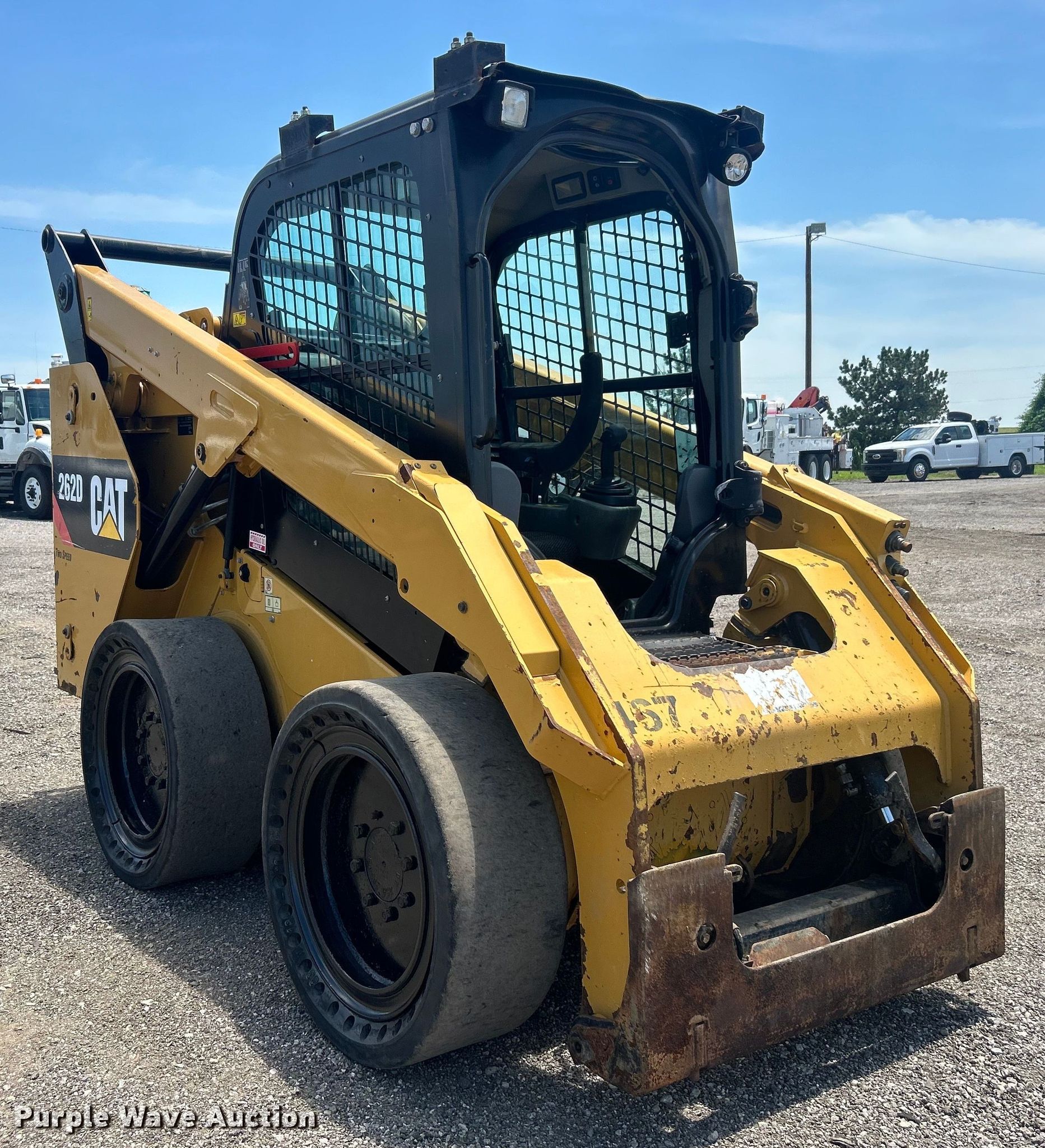 2016 Caterpillar 262D skid steer loader. Hours: 2,162 on meter, Serial: CAT0262DTDTB04280. Engine Caterpillar C3.3B, Displacement: 3.3L, Cylinders: 4, Fuel type: Diesel. Transmission Hydrostatic, Two speed travel. Operators station Enclosed cab, AC, Heat, Bucket control: Hand. Features Auxiliary hydraulics, Quick coupler: Manual. Tires Size: 33x12-20, Solid. Notes Door missing. 15107 North 137th East Avenue. Collinsville, OK 74021