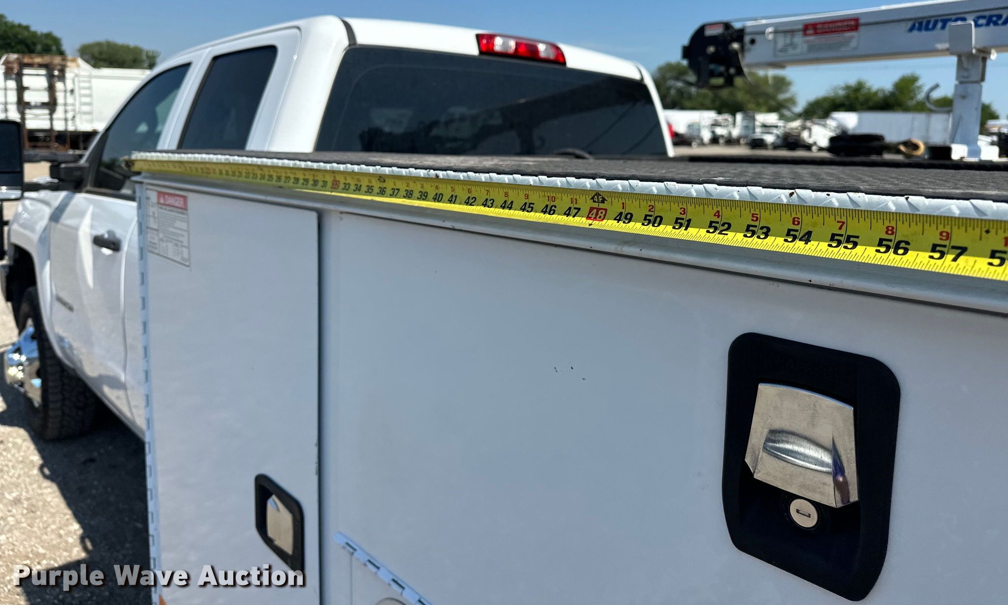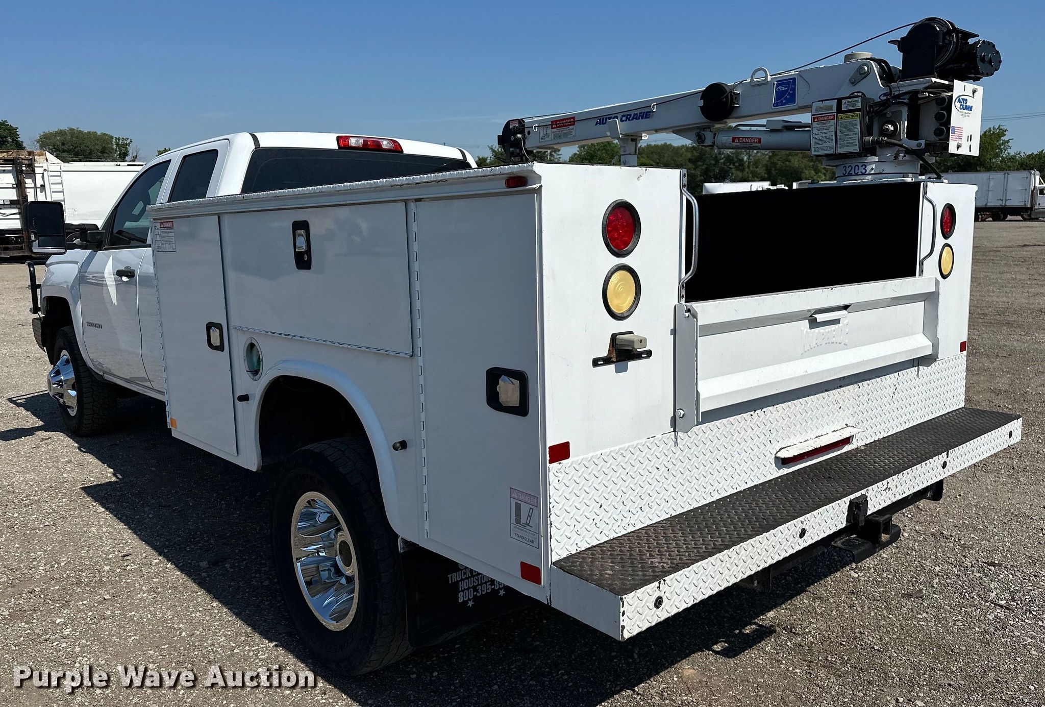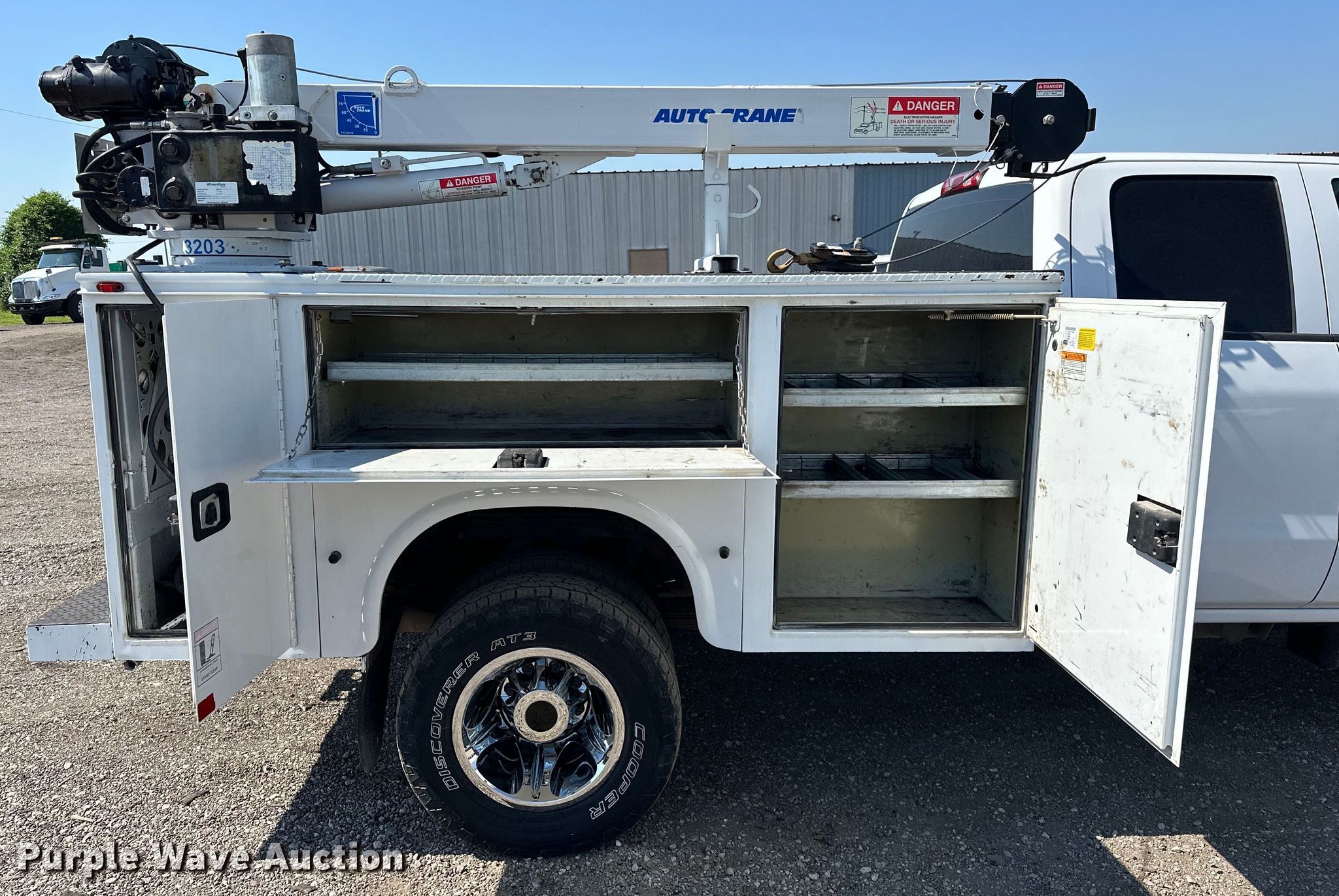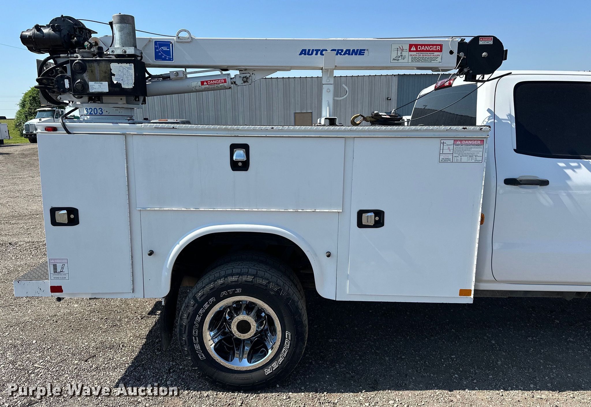 2016 Chevrolet Silverado 3500HD Double Cab utility bed pickup truck. Miles: 174,726 on odometer, VIN: 1GB5KYC89GZ207822. Engine Displacement: 6.6L V8 OHV, Cylinders: 8, Fuel type: Diesel. Transmission Automatic, Four wheel drive. Interior AC, Heat, Heated mirrors, Power windows, Power locks, Cruise control. Features Utility bed Knapheide 696D54J1, 9' L x 96" W, Crane AutoCrane 3203ORX, Maximum boom length: 7' Maximum lift capacity: 3,200 lbs, Remote control, Lift chart. Tires Front: LT245/75R17, Rear: LT265/70R17. Notes Windshield chipped or cracked. Oklahoma title. 15107 North 137th East Avenue. Collinsville, OK 74021