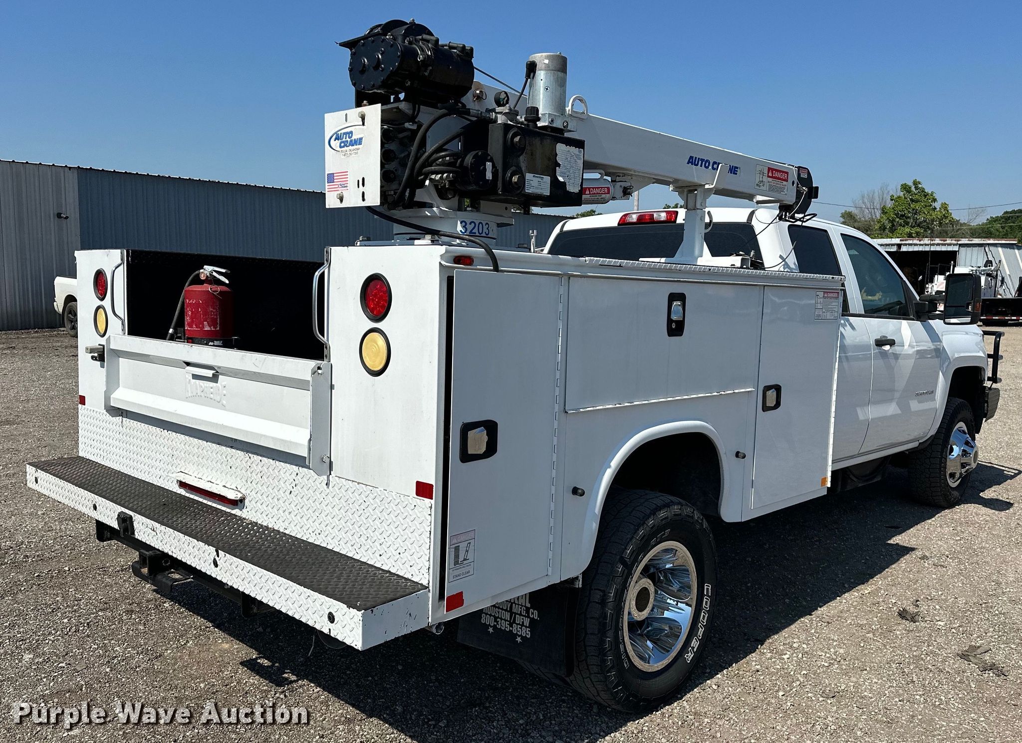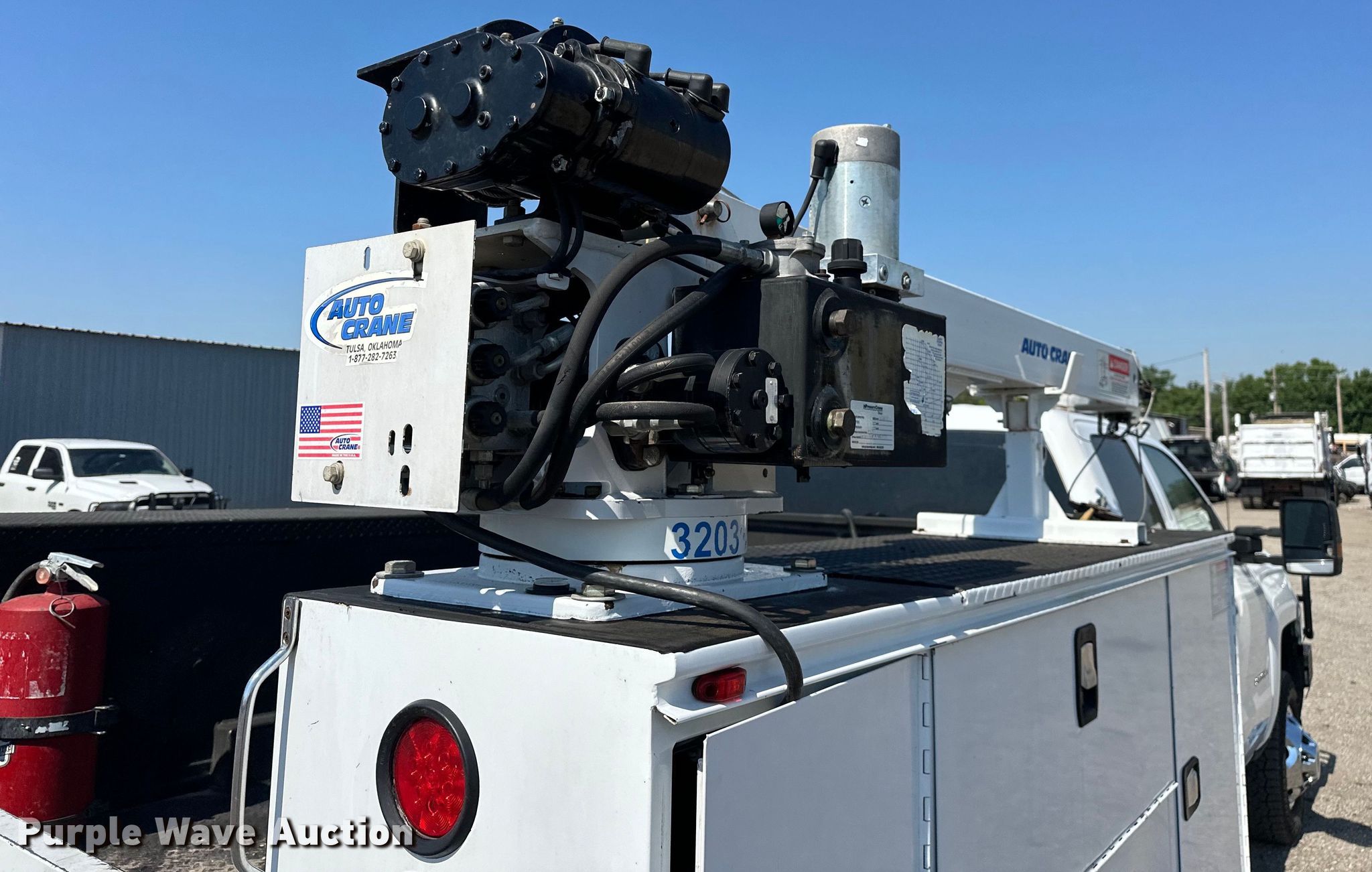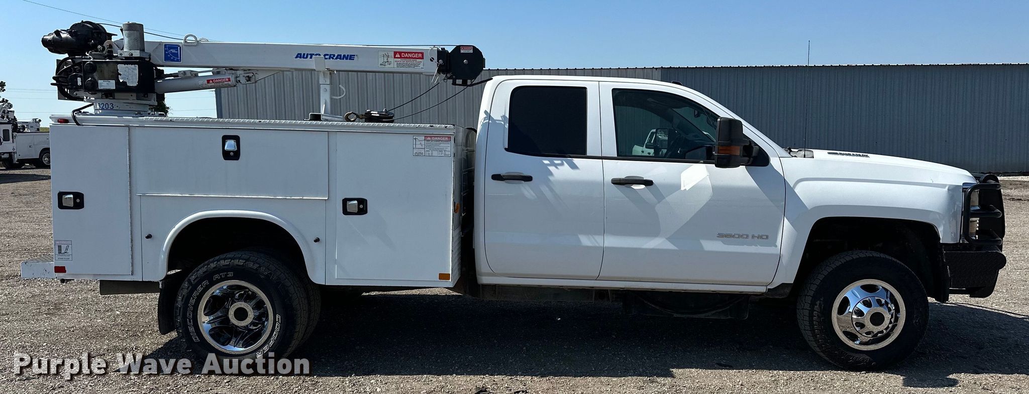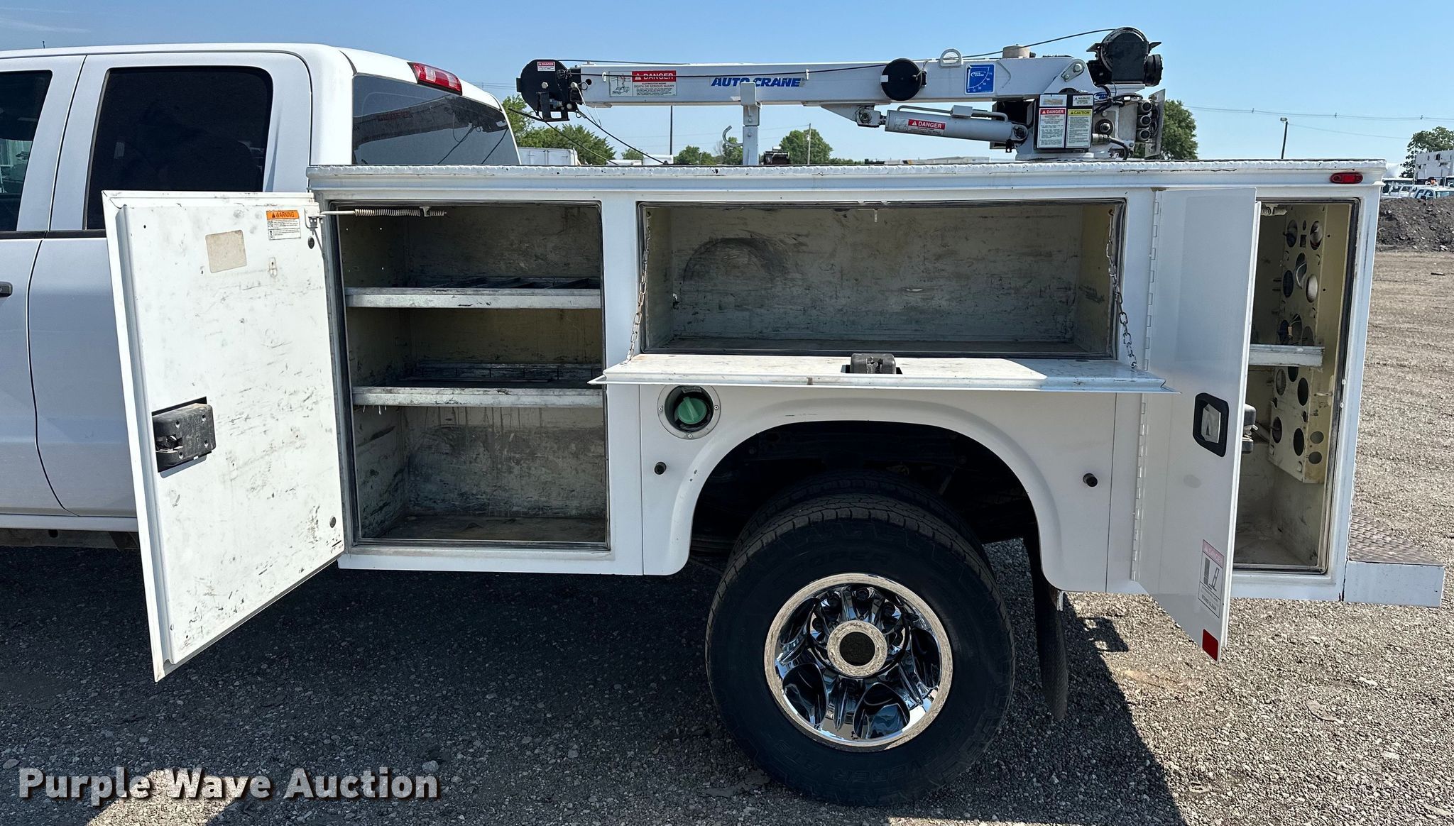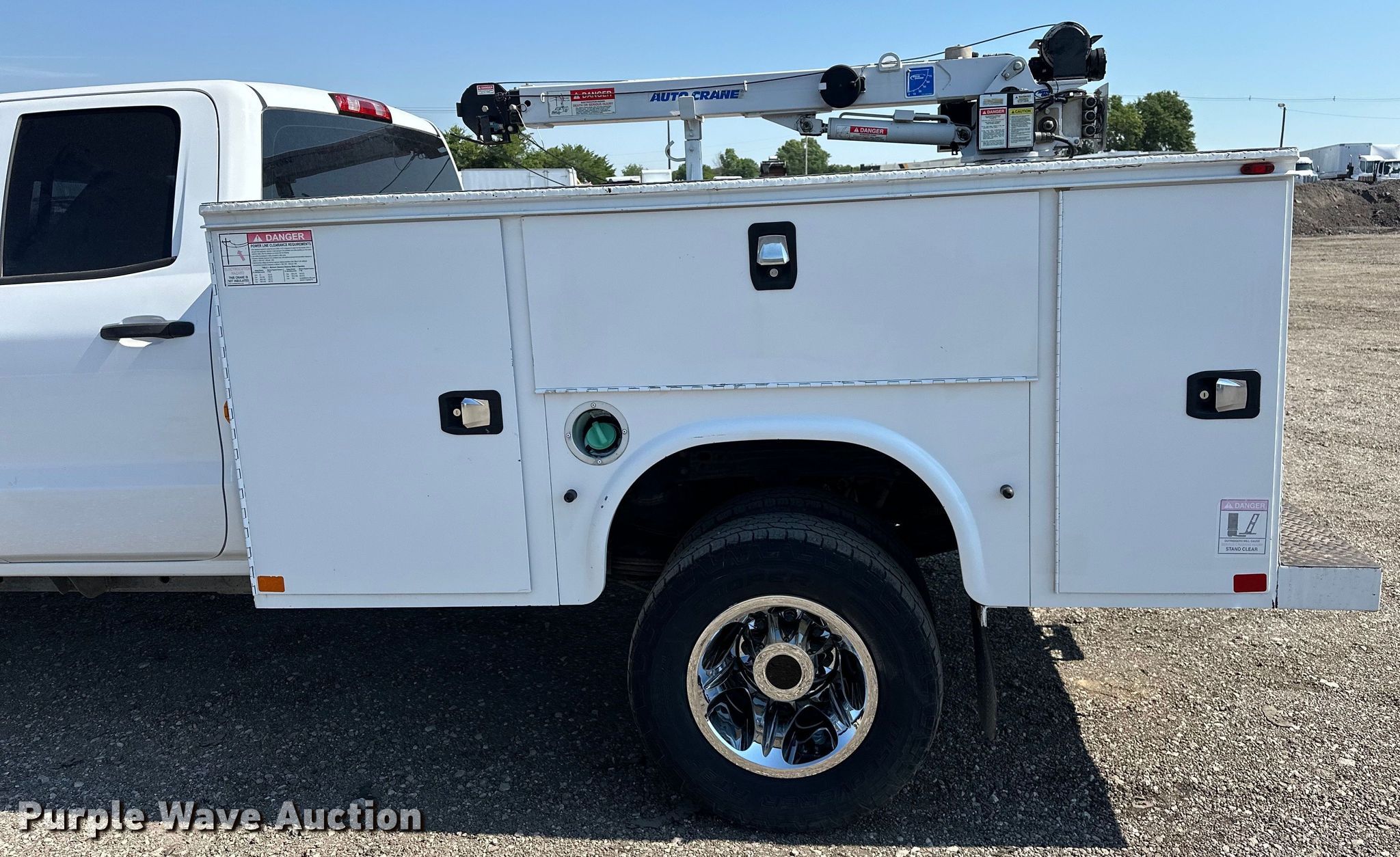 2016 Chevrolet Silverado 3500HD Double Cab utility bed pickup truck. Miles: 174,726 on odometer, VIN: 1GB5KYC89GZ207822. Engine Displacement: 6.6L V8 OHV, Cylinders: 8, Fuel type: Diesel. Transmission Automatic, Four wheel drive. Interior AC, Heat, Heated mirrors, Power windows, Power locks, Cruise control. Features Utility bed Knapheide 696D54J1, 9' L x 96" W, Crane AutoCrane 3203ORX, Maximum boom length: 7' Maximum lift capacity: 3,200 lbs, Remote control, Lift chart. Tires Front: LT245/75R17, Rear: LT265/70R17. Notes Windshield chipped or cracked. Oklahoma title. 15107 North 137th East Avenue. Collinsville, OK 74021