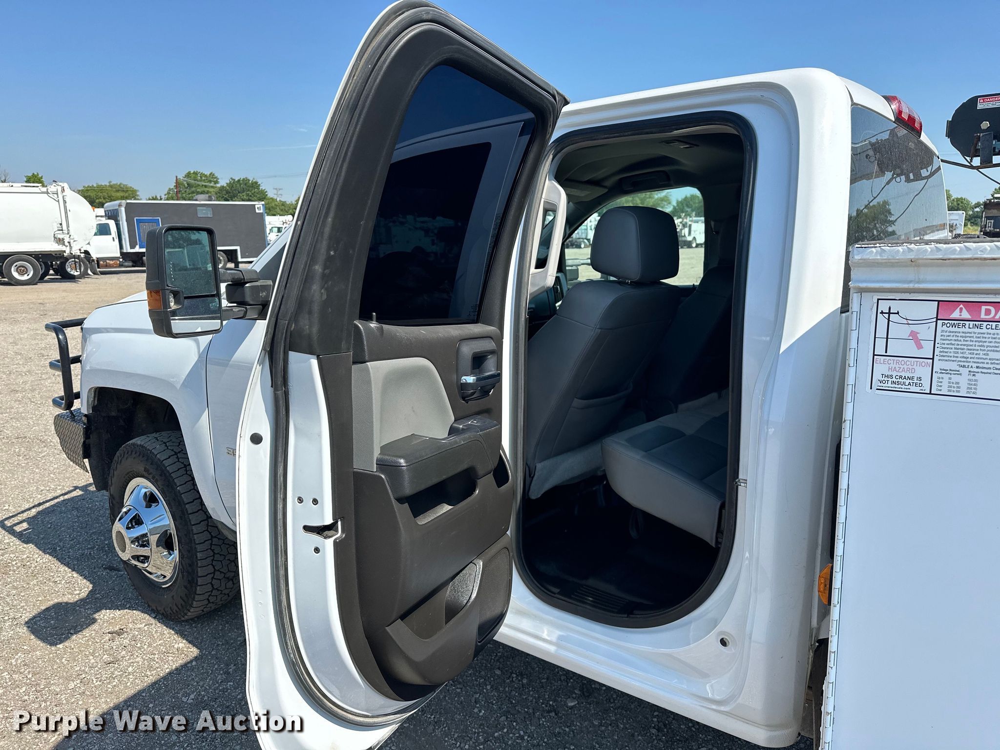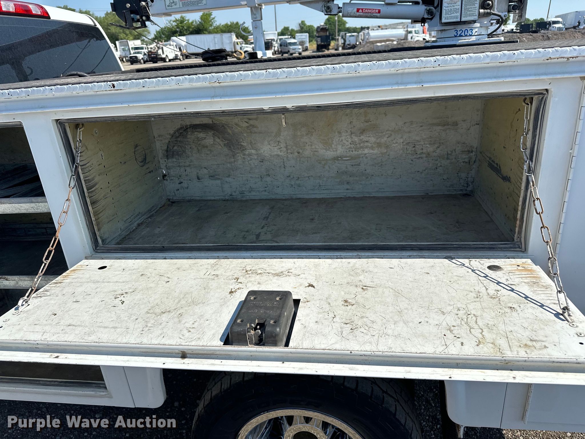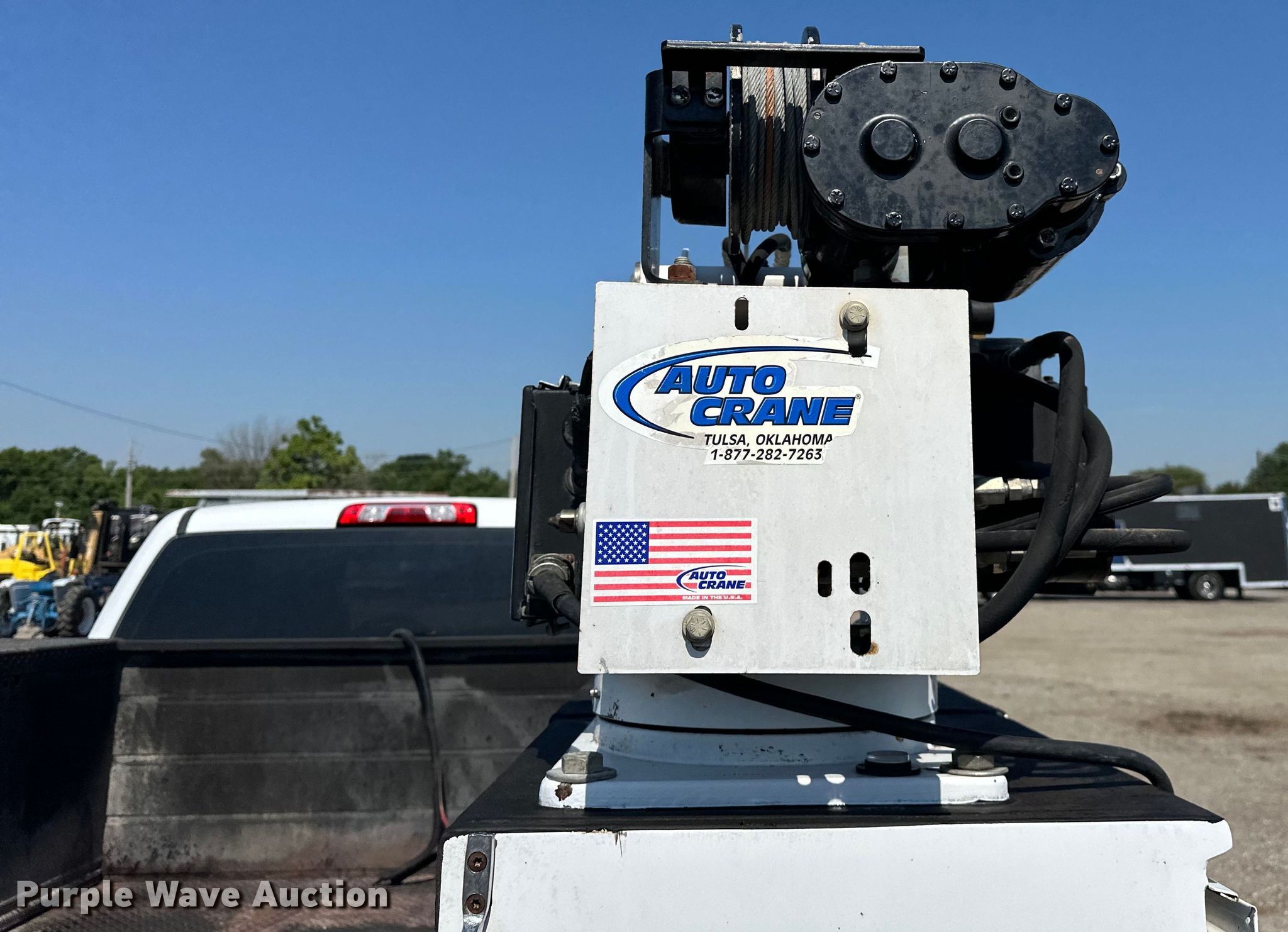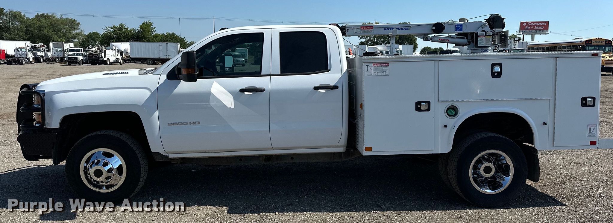 2016 Chevrolet Silverado 3500HD Double Cab utility bed pickup truck. Miles: 174,726 on odometer, VIN: 1GB5KYC89GZ207822. Engine Displacement: 6.6L V8 OHV, Cylinders: 8, Fuel type: Diesel. Transmission Automatic, Four wheel drive. Interior AC, Heat, Heated mirrors, Power windows, Power locks, Cruise control. Features Utility bed Knapheide 696D54J1, 9' L x 96" W, Crane AutoCrane 3203ORX, Maximum boom length: 7' Maximum lift capacity: 3,200 lbs, Remote control, Lift chart. Tires Front: LT245/75R17, Rear: LT265/70R17. Notes Windshield chipped or cracked. Oklahoma title. 15107 North 137th East Avenue. Collinsville, OK 74021
