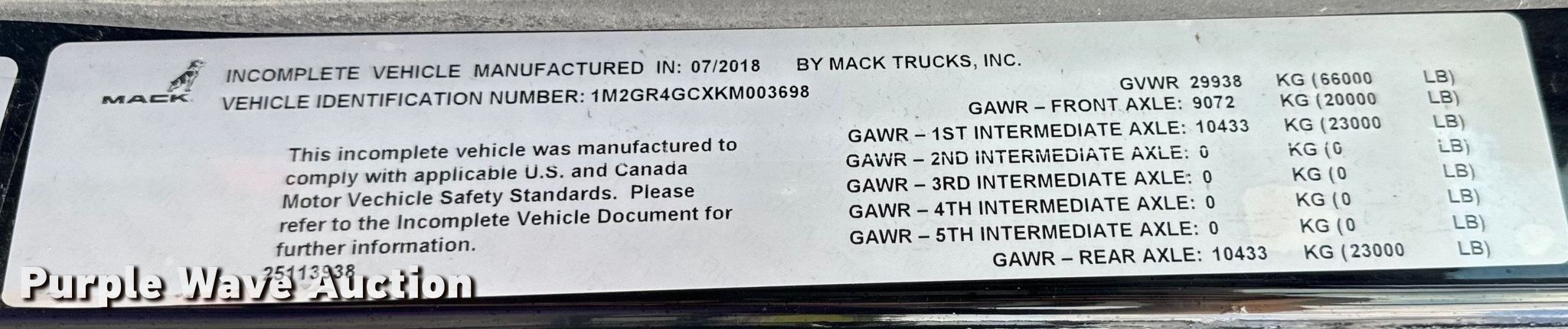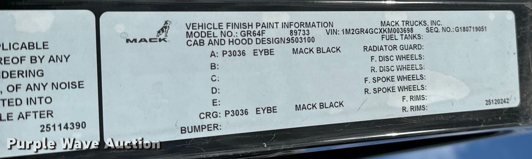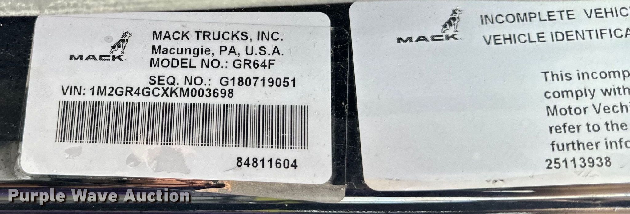 Purple Wave is selling a used Construction Dump Truck in Missouri. This item is a 2019 Mack Granite dump truck with the following: Miles: 27,584 on odometer, Hours: 1,219 on meter, VIN: 1M2GR4GCXKM003698