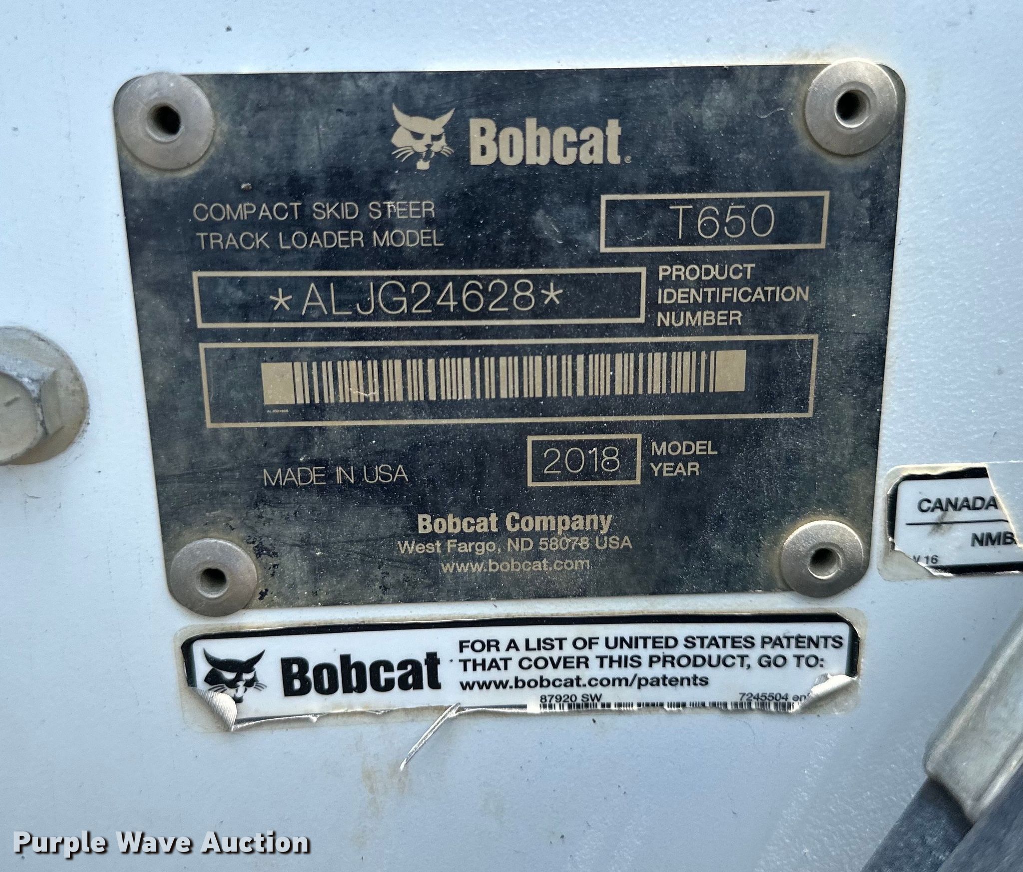 Purple Wave is selling a used Tracked Skid Steer Loader in Missouri. This item is a 2018 Bobcat T650 tracked skid steer loader with the following: Hours: 5,197 on meter, Serial: ALJG24628