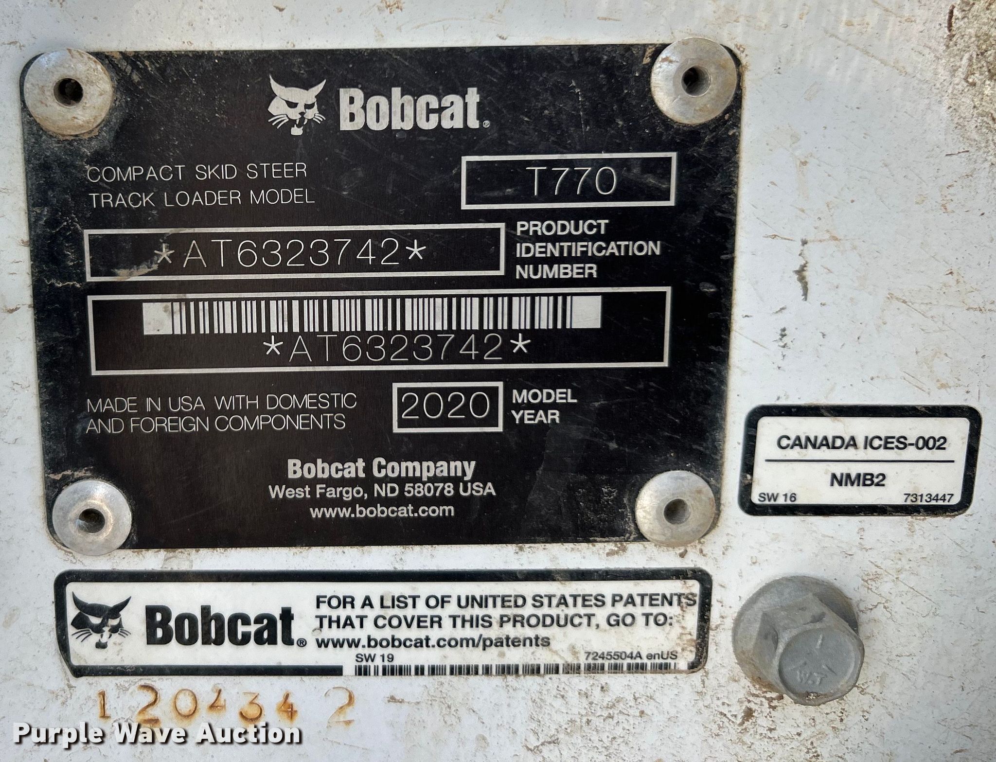 Purple Wave is selling a used Tracked Skid Steer Loader in Missouri. This item is a 2020 Bobcat T770 tracked skid steer loader with the following: Hours: 942 on meter, Serial: AT6323742