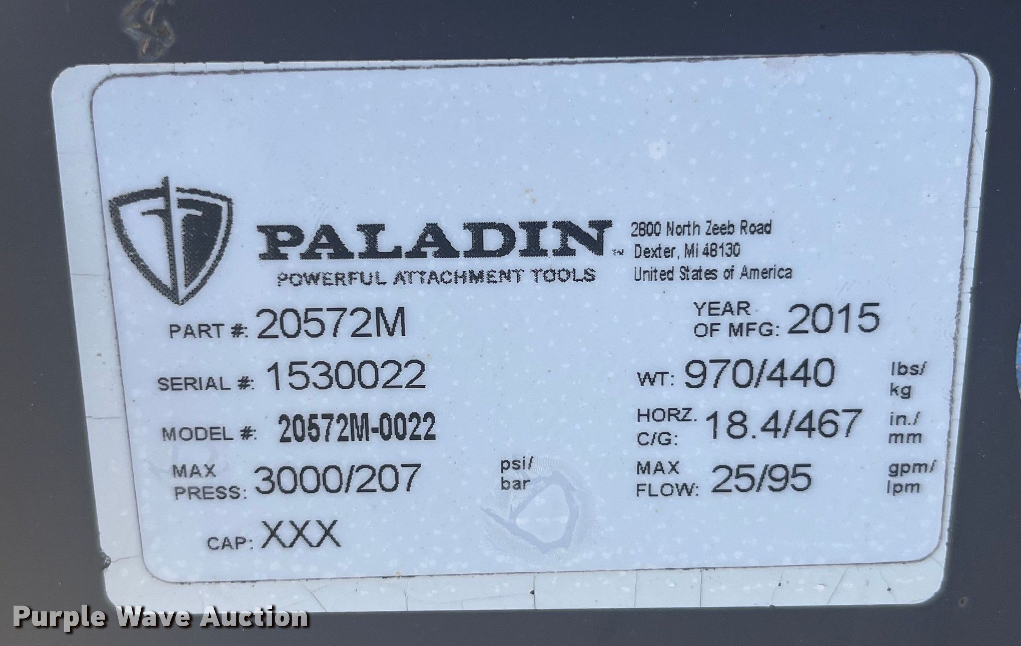 Purple Wave is selling a used Skid Steer Attach. in Iowa. This item is a 2015 Paladin 20572M-0022 skid steer sweeper with the following: Serial: 1530022, Width: 72", Skid steer not included