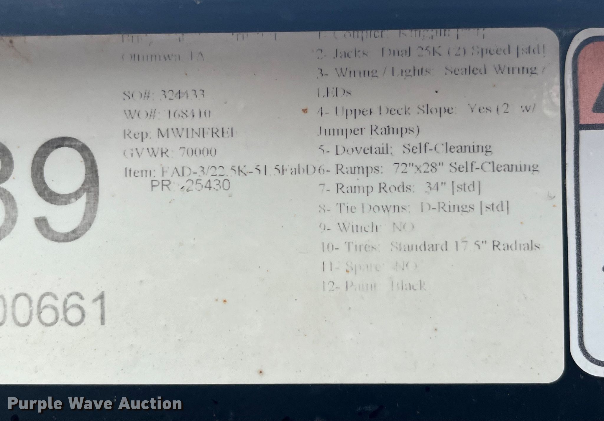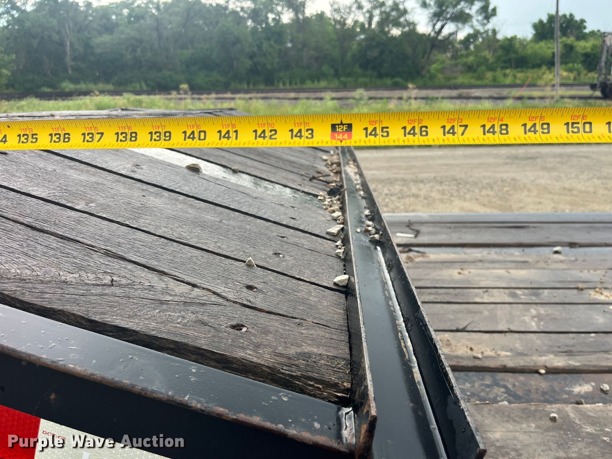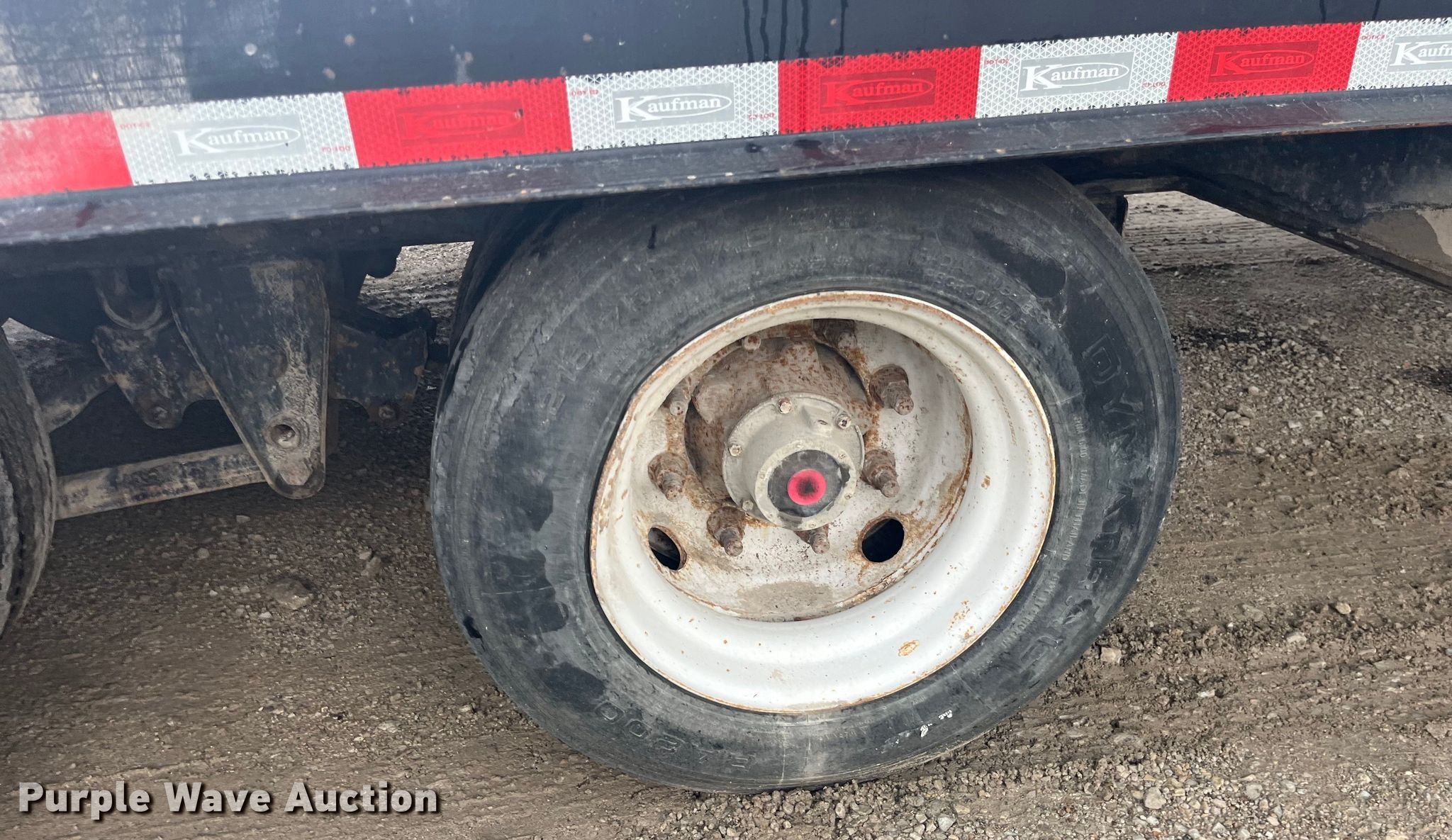 2018 Kaufman drop deck equipment trailer. VIN: 5SHAD5138JB000661. Dimensions Overall: 53' x 102" W, Deck: 33' 11" L x 100.5" W, Top deck length: 12', Tail length: 61", Ramps: Manual Length: 72". Features Deck type: Wood. Chassis Landing gear: Dual, Suspension: Spring, Brakes: Air, Axles: Triple, GVWR: 70,000 lbs. Tires Steel wheels, Size: 215/75R17.5. Notes Semi truck not included. Iowa title. Title distribution may be delayed up to 14 days from verification of funds. Bridge City Construction Inventory Reduction. Ottumwa, IA 52501
