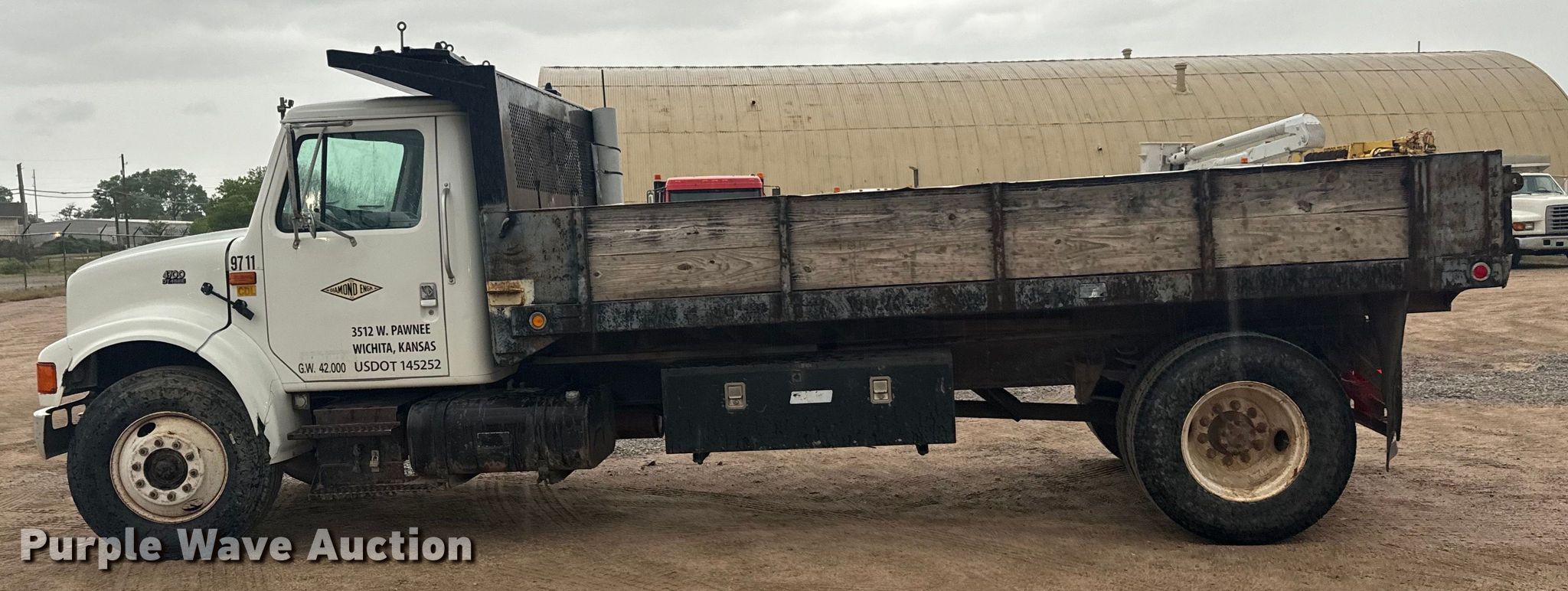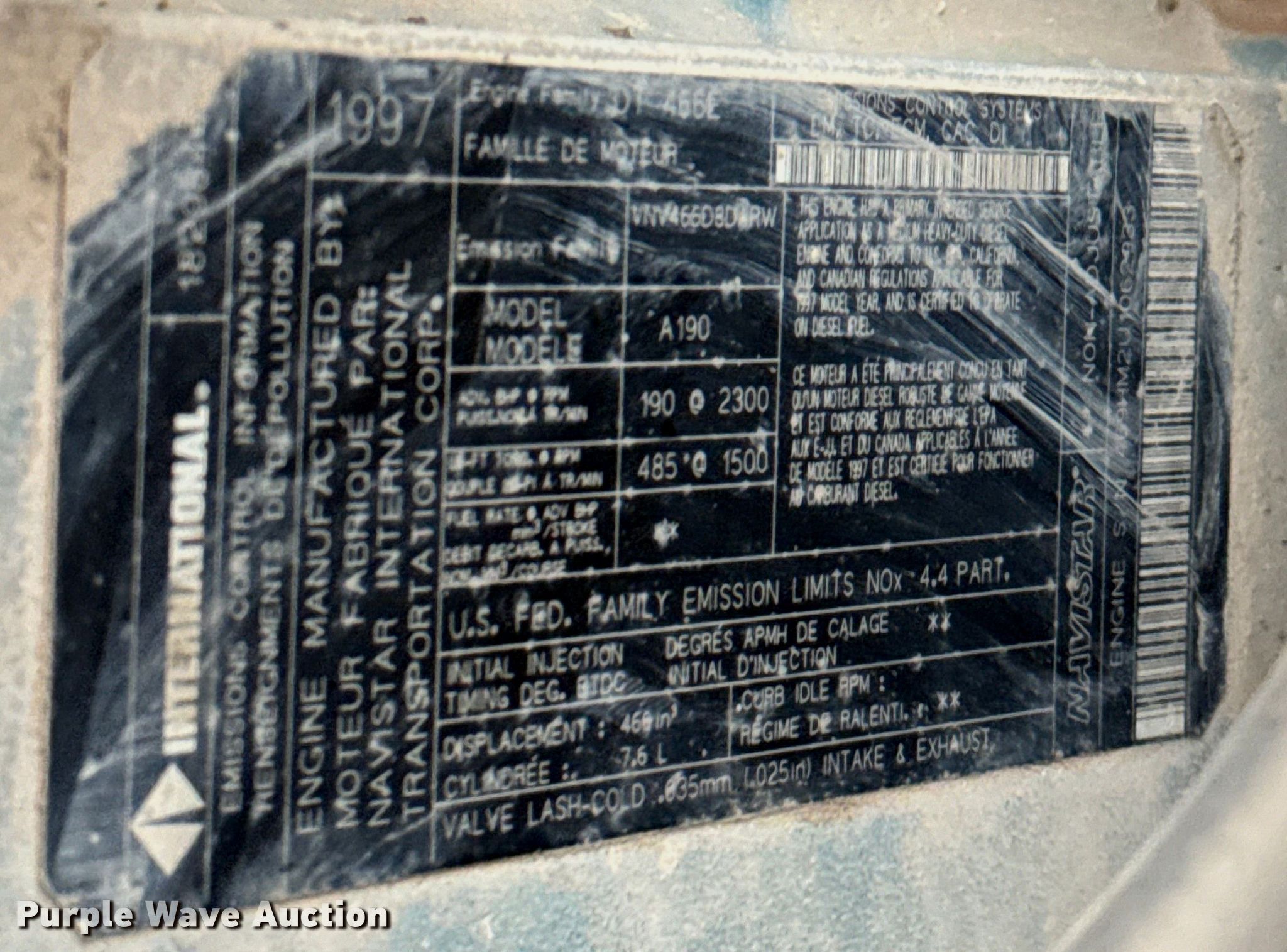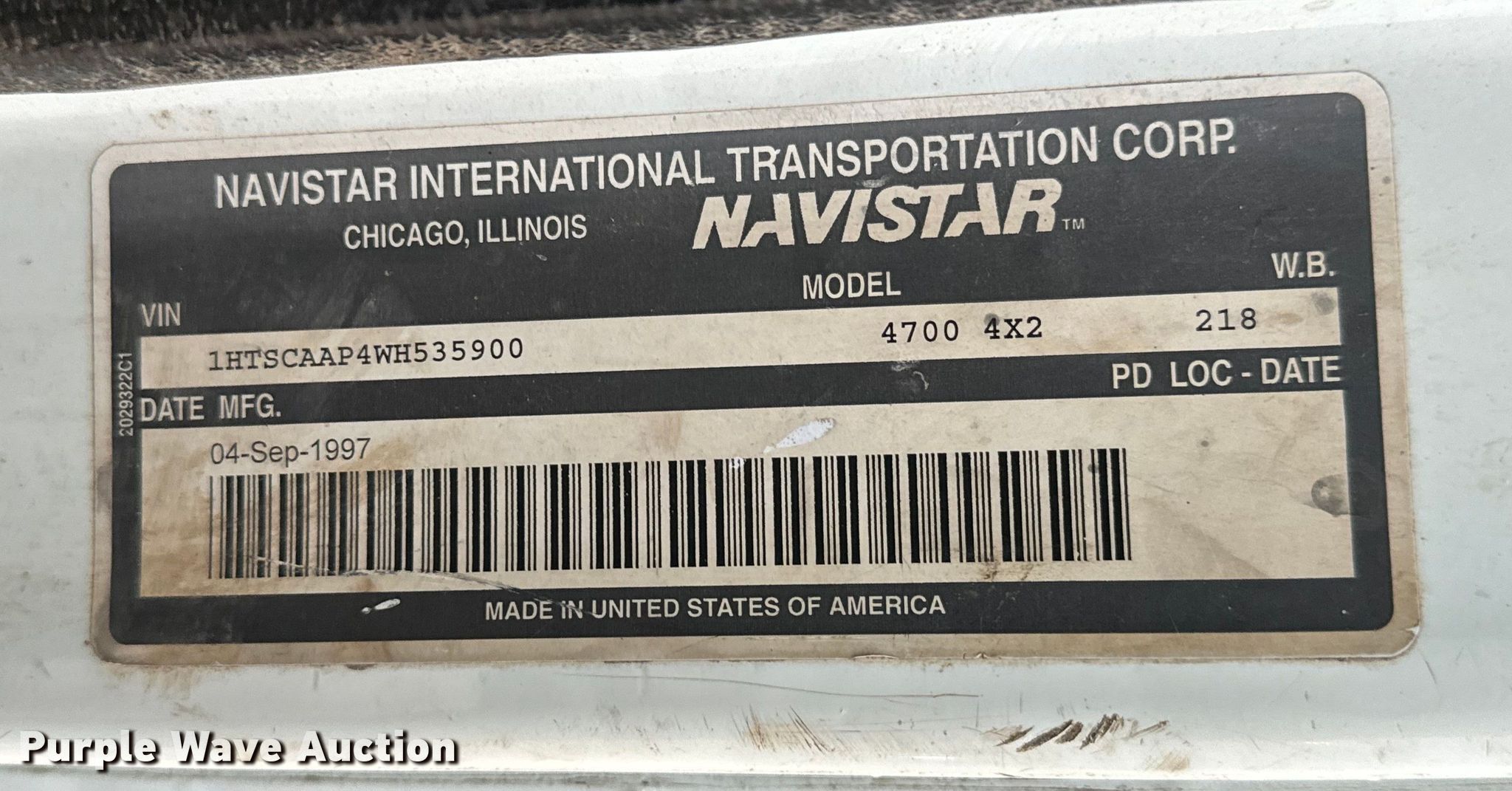 1998 International 4700 dump truck. Miles: 81,702 on odometer, Miles or hours may vary, unit still in use, VIN: 1HTSCAAP4WH535900, Unit #: 9711. Engine International, Displacement: 7.6L, Cylinders: 6, Fuel type: Diesel. Transmission International 6 plus, Manual, Speed: 7. Chassis Axles: Single, Suspension: Spring, Brakes: Hydraulic, PTO. Interior Heat, Cruise control. Features Dump bed 16' 2" L x 96" W, Side height: 18", Ram: Double. Tires Size: 11R22.5. Notes Driver side mirror cracked. Item will be available for pickup beginning August 5, 2024. Kansas title. Diamond Engineering Co. - Wichita Division Liquidation - Open Inspection Tuesday, July 9 from 9:00 a.m. to 3:00 p.m.. 3512 West Pawnee Street. Wichita, KS 67213