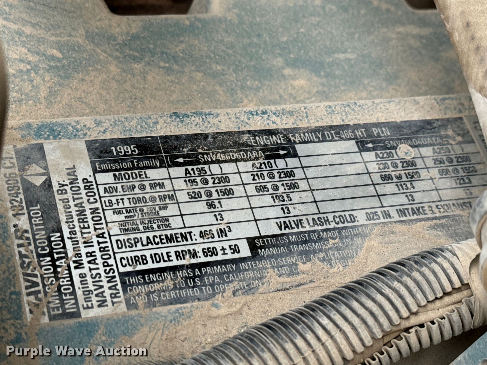 1995 International 4900 dump truck. Miles: 124,679 on odometer, Hours: 12,459 on meter, Miles or hours may vary, unit still in use, VIN: 1HTSHAAR4SH681159, Unit #: 1205. Engine International DT 466 A230, Displacement: 466 C.I.D., Cylinders: 6, Fuel type: Diesel, HP: 230. Transmission Automatic. Chassis Axles: Tandem, Differential lock: Inter-axle, Suspension: Spring over walking beam, Brakes: Air, PTO, GVWR: 47,220 lbs. Interior Heat. Features Dump bed 14' L x 96" W, Side height: 32", Side board height: 9", Bed type: Steel, Roll tarp, Ram: Single, End gate: Air operated. Tires Size: 11R22.5. Item will be available for pickup beginning August 5, 2024. Nebraska title. Diamond Engineering Co. - Wichita Division Liquidation - Open Inspection Tuesday, July 9 from 9:00 a.m. to 3:00 p.m.. 3512 West Pawnee Street. Wichita, KS 67213