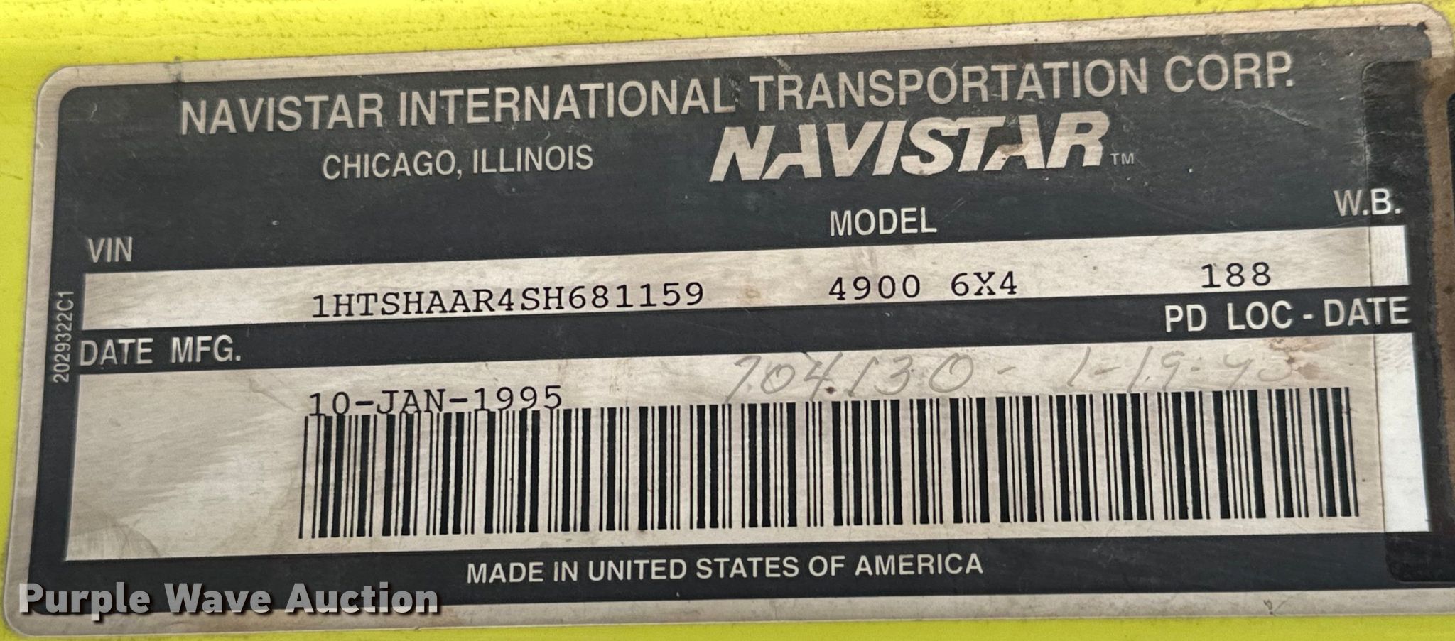 Purple Wave is selling a used Construction Dump Truck in Kansas. This item is a 1995 International 4900 dump truck with the following: Miles: 124,679 on odometer, Hours: 12,459 on meter, Miles or hours may vary, unit still in use, VIN: 1HTSHAAR4SH681159, Unit #: 1205