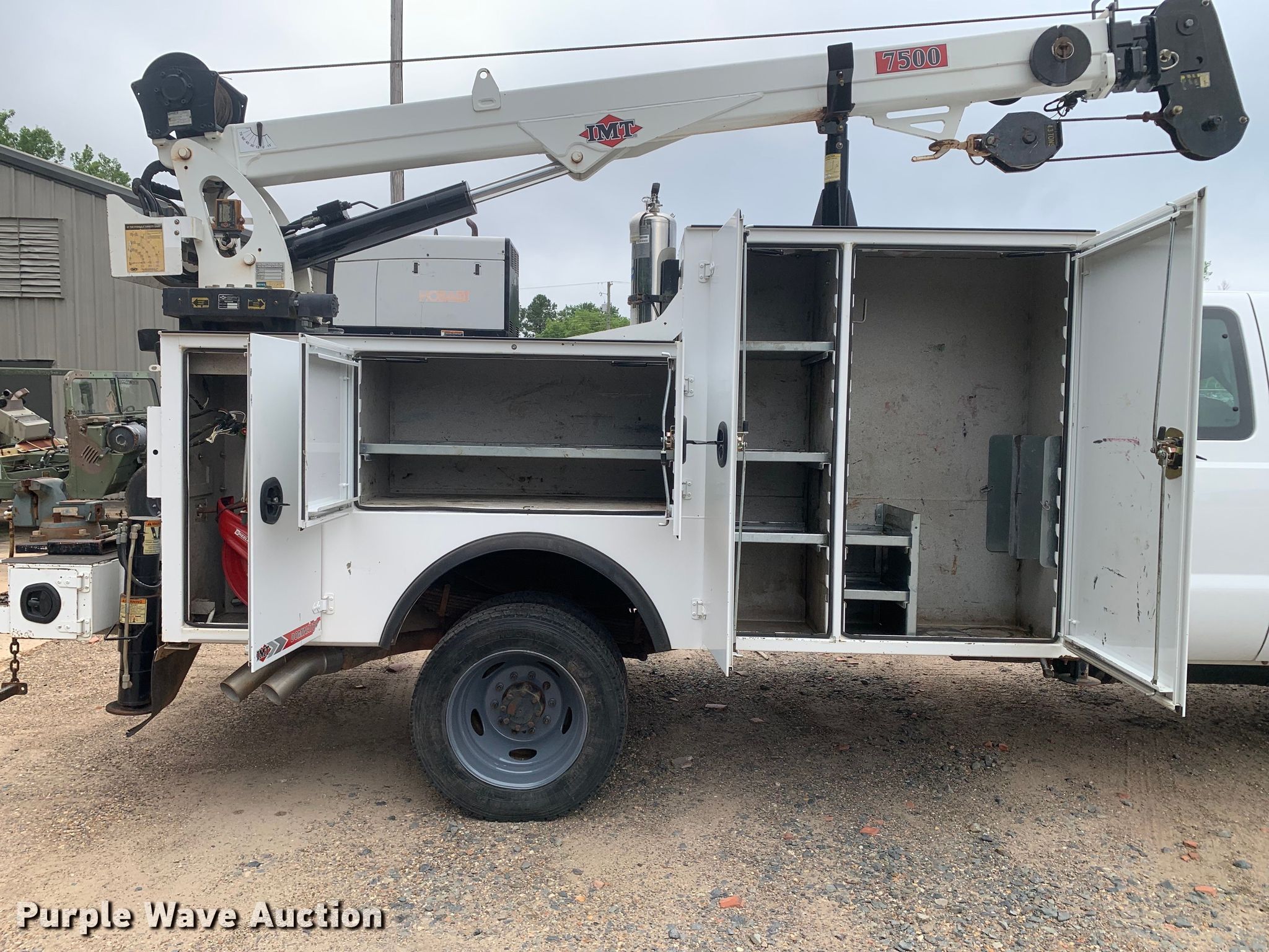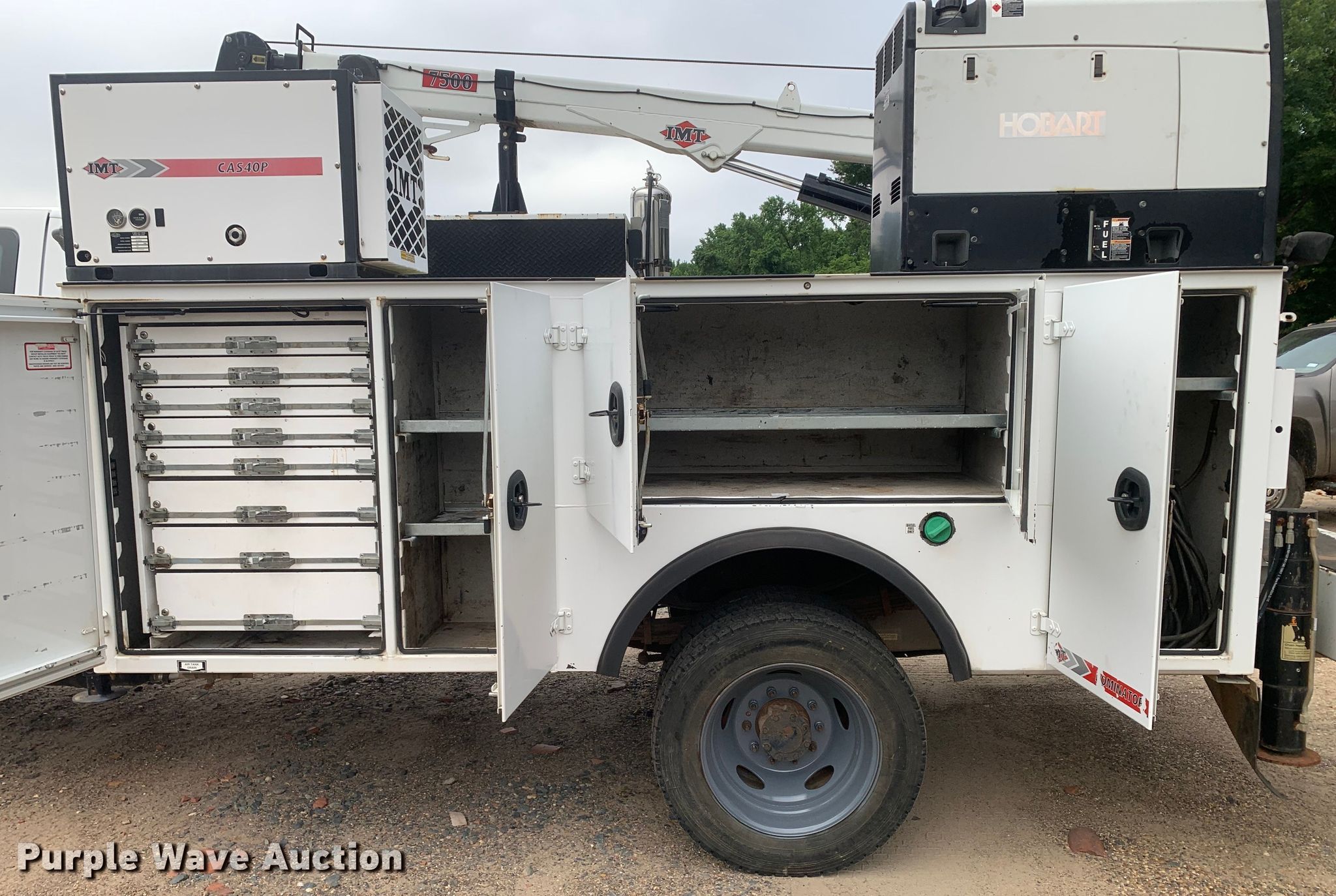 2015 Ford F550 Super Duty XL SuperCab utility / service truck. Miles: 231,974 on odometer, VIN: 1FD0X5HT4FEA60460, Unit #: 2220. Engine Ford, Displacement: 6.7L V8 OHV, Cylinders: 8, Fuel type: Diesel. Transmission Automatic. Chassis Four wheel drive, Axles: Single, Suspension: Spring, Brakes: Hydraulic, PTO, GVWR: 19,500 lbs, Wheelbase: 186". Interior AC, Heat, Heated mirrors, Power windows, Power locks, Cruise control, Auxiliary controls. Features Bed Iowa DOM1S3 J966020, 13' 5" L x 7' 10" W, Welder/generator Hobart Champion Elite, Hours: 173 on meter, Fuel type: Gas, 240V outlets: 2, 120V outlets: 4, Watts: 11,000, IMT CAS40P, Crane Iowa 7500, Maximum boom length: 21.8' Maximum lift capacity: 7,500 lbs, Remote. Tires Size: 225/70R19.5. Texas title. Tatum Excavating Company. Texarkana, TX 75501