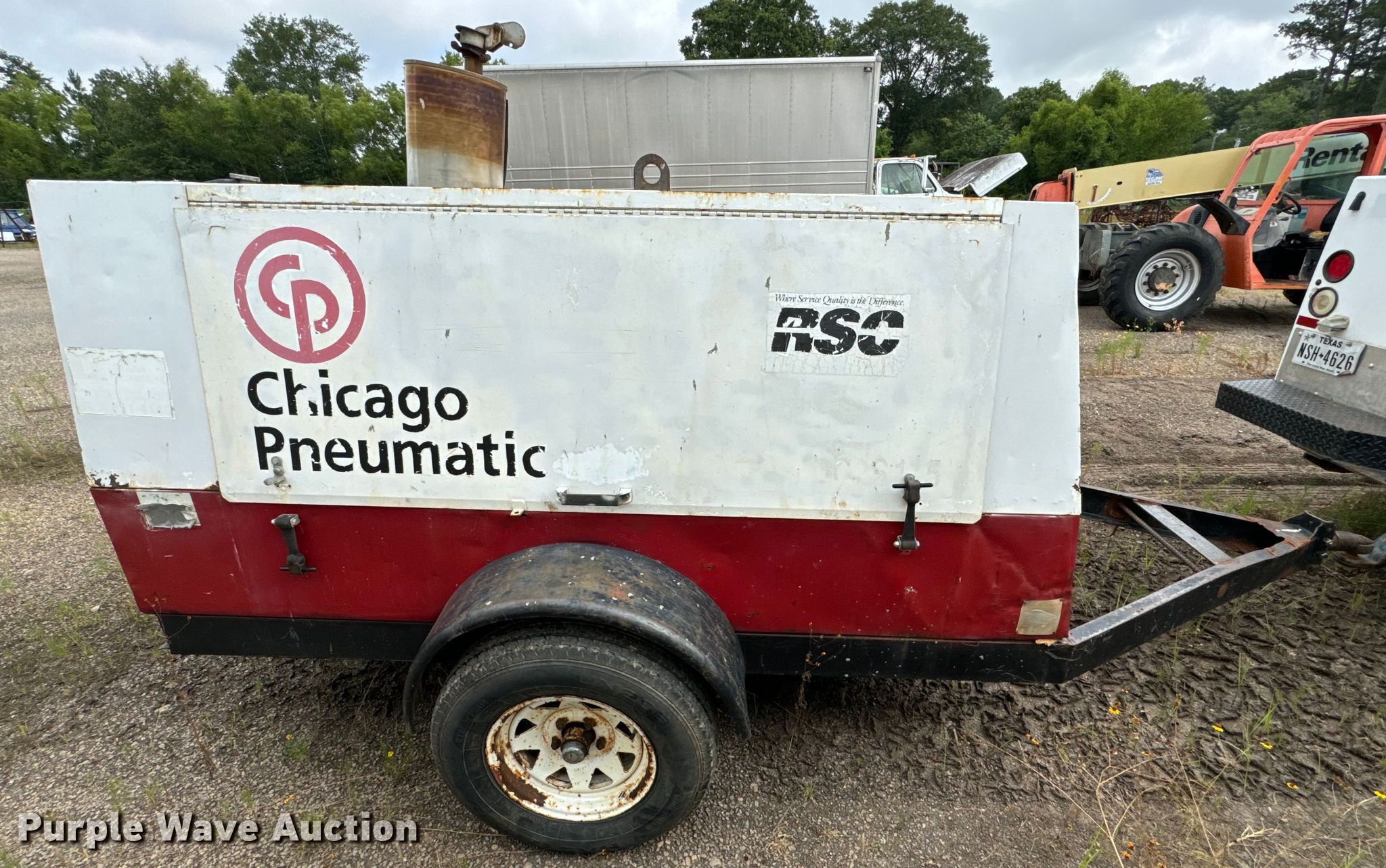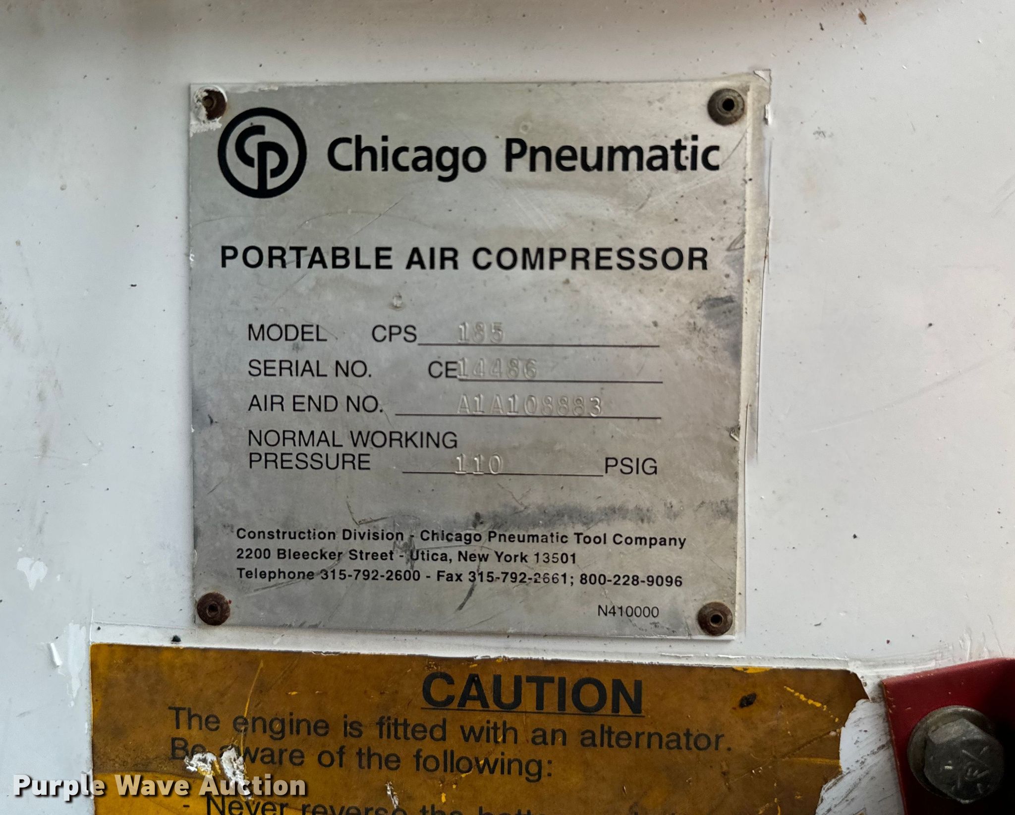 Purple Wave is selling a used Air Compressor in Texas. This item is a 1994 Chicago Pneunmatic 185 air compressor with the following: Hours: 4,853 on meter, Serial: CE14486